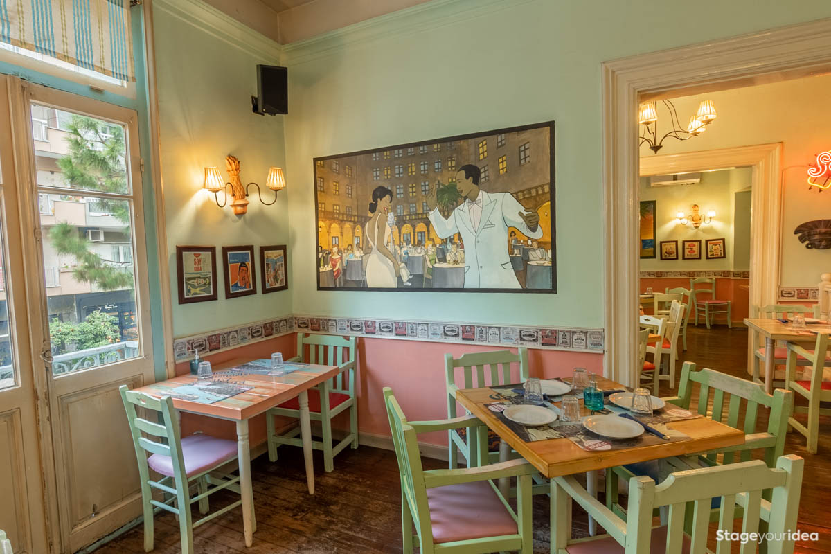 Η αισθητική της Αίθουσας συντίθεται από μια εκλεκτική προσέγγιση όπου αναμειγνύονται με έντεχνο τρόπο το κουβανέζικο μπαρόκ, το νεοκλασικό στυλ, το έθνικ και το art deco. Η μεγαλοπρέπεια και η συμμετρία η οποία απορρέει από την νεοκλασική δόμηση με την καθαρότητα στις φόρμες, τις δυνατές οριζόντιες και κάθετες γραμμές συναντιέται με την εξιδανίκευση της ομορφιάς και της ευτυχίας που διακηρύσσεται μέσα από τους παραστατικούς πίνακες ζωγραφικής οι οποίοι εκθειάζουν την διασκέδαση και την χαρά με πρωταγωνιστή την μουσική. Η έθνικ πινελιά εκδηλώνεται μέσα από τα στιβαρά τοτέμ τα οποία υπενθυμίζουν τις βαθιές ιστορικές ρίζες που φέρουν αυτές οι κουλτούρες. Το ξύλινο δάπεδο, τα χαρακτηριστικά νεοκλασικού στυλ κιγκλιδώματα, οι διακοσμητικές λεπτομέρειες στους τοίχους σε μορφή κολάζ, τα art deco φωτιστικά, τα ντελικάτα παστέλ που θυμίζουν άνοιξη και εξυψώνουν την διάθεση, και τα πολλά και μεγάλα παράθυρα που κρατούν το περιβάλλον καθαρό και καλωσορίζουν το φυσικό φως είναι μερικά από τα στοιχεία που αποκαλύπτουν την σπουδή και την φροντίδα που έχουμε καταβάλει προκειμένου να διαμορφώσουμε έναν χώρο που θα καταπλήξει εσάς και τους καλεσμένους σας.