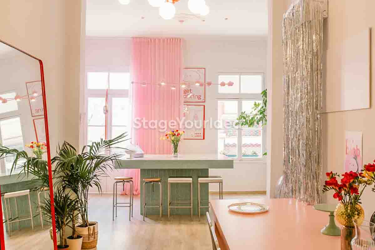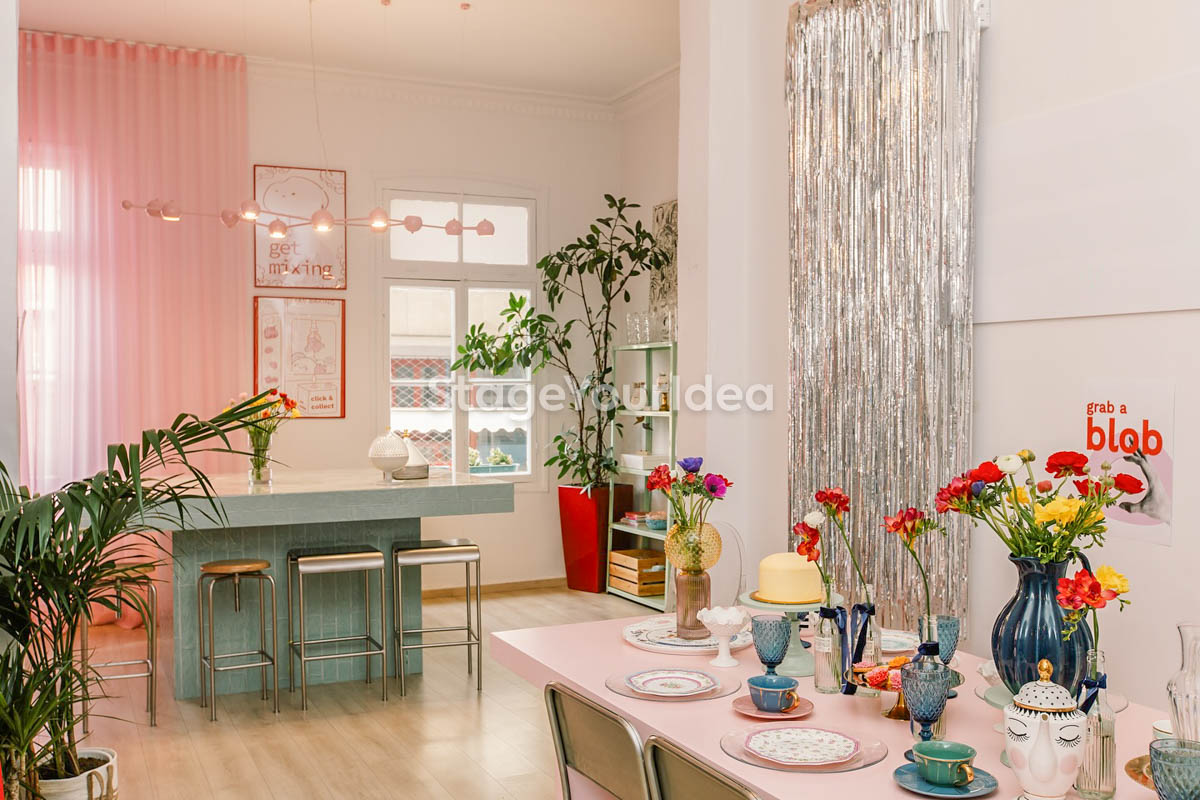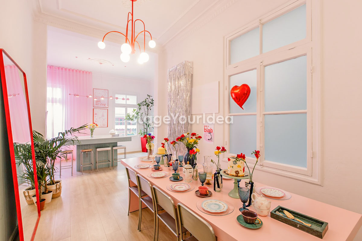 Η αίθουσα «Events Studio με Girly Διάθεση» χαρακτηρίζεται από μια μεταμοντέρνα, εκλεκτικιστική και ρομαντική διάθεση με μια παστέλ girly παλέτα και pop art πινελιές. Η vintage βιτρίνα είναι μια ιδιαίτερη γωνιά του χώρου με συναισθηματική αξία. Εκεί η γιαγιά φύλαγε το καλό της σερβίτσιο που το έβγαζε μόνο στα τραπέζια και στο κάτω ντουλάπι συνήθως έκρυβε γλυκά και κουραμπιέδες. Τώρα έχει πάρει ζωή και χρησιμοποιείται καθημερινά για τις ανάγκες των διοργανωτών και των καλεσμένων σας.