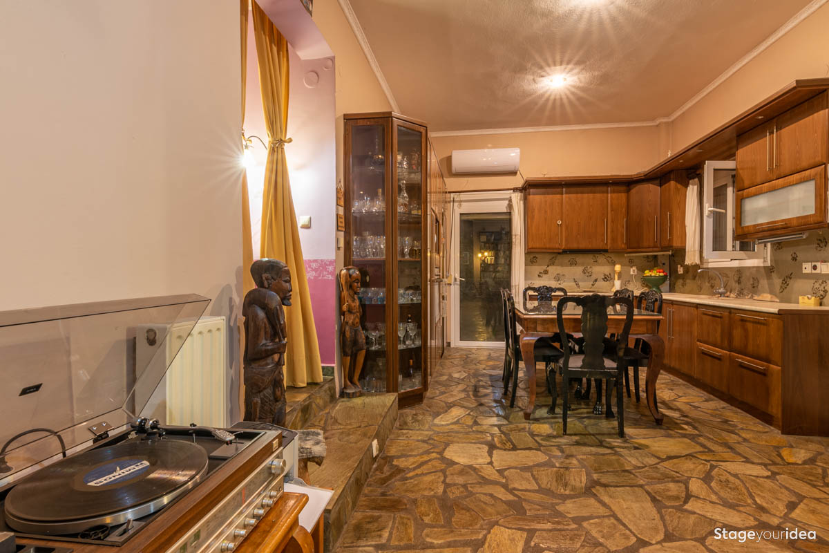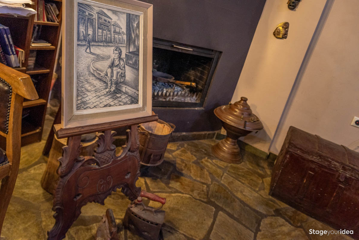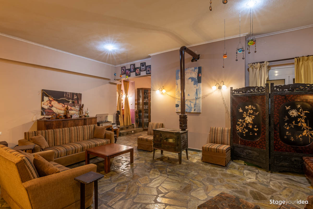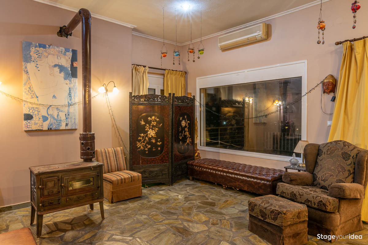 Από την αναγεννησιακή έκφραση της θηλυκότητας, στην συντροφικότητα του Γιώργου Σταθόπουλου και την μητρότητα του Gustav Klimt, η «Εξοχική Οικία με Νοσταλγική Ατμόσφαιρα» βρίθει καλλιτεχνικών στιγμάτων και ορόσημων του συμβολικού, και υπερρεαλιστικού κινήματος με κοινή συνισταμένη τον ρομαντισμό, την υπερβατικότητα και την περιπετειώδη ατμόσφαιρα της αναζήτησης. Το πλακόστρωτο δάπεδο με πέτρα, το ξύλο που αγκαλιάζει και περιβάλλει με ζεστασιά τον χώρο, η ζεστή χρωματική παλέτα με αποχρώσεις του καφέ, οι λείες βελούδινες και δερμάτινες υφές των επίπλων, οι ρετρό νοσταλγικές πινελιές της ξυλόσομπας, του ενδόξου πικάπ, τα εξωτικά τοτέμ, η «δραστήρια» βιβλιοθήκη, η γωνιά του τζακιού, τα ανατολίτικα φωτιστικά, το ασιατικό παραβάν, τα μεγάλα ανοιχτά παράθυρα με θέα που σε συνεπαίρνει και η αρχοντική ευρύχωρη κουζίνα δεν μπορούν παρά να εξάψουν την επιθυμία σου να βιώσεις την εμπειρία που απλόχερα σου προσφέρεται.