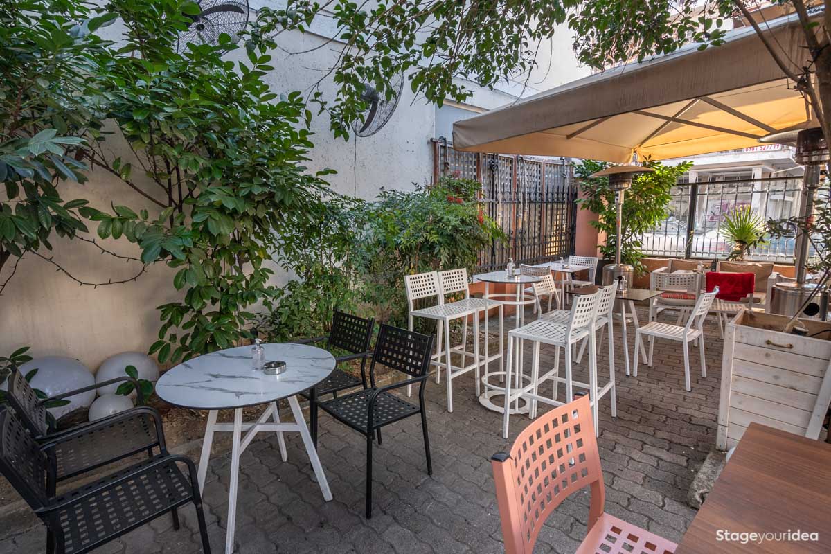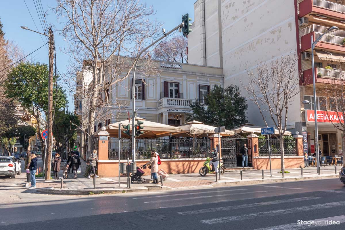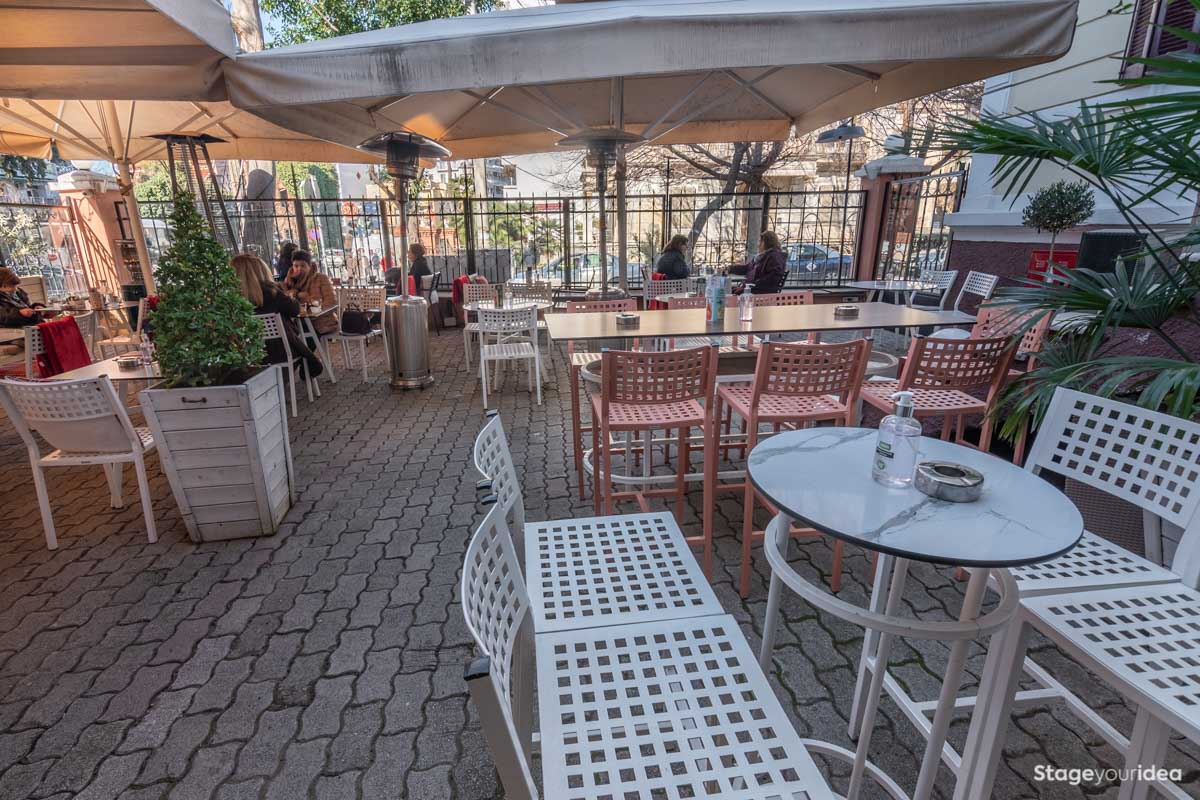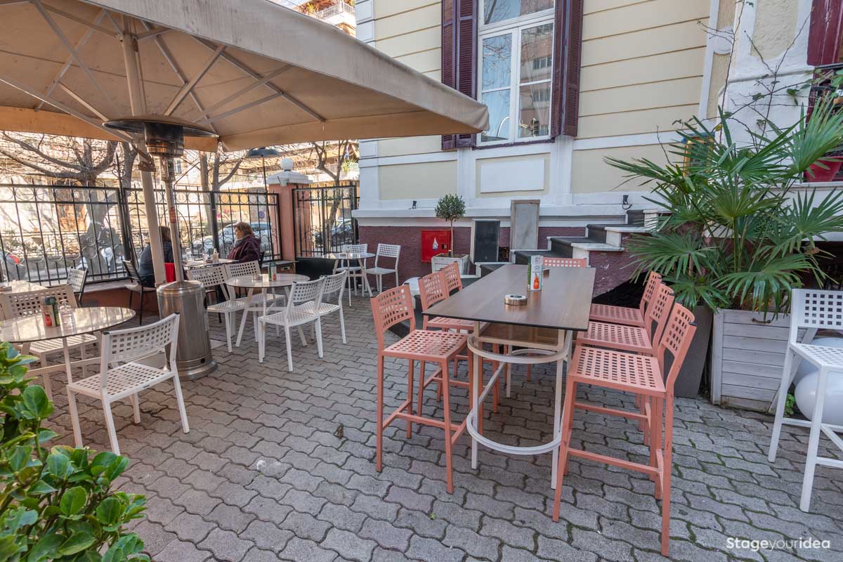 Είναι ένα ηλιόλουστο περιβάλλον προστατευμένο (μέσω των μεγάλων ομπρελών που έχουμε τοποθετήσει) από την υπεριώδη ακτινοβολία του ηλίου, συνεπώς ευνοούνται εκδηλώσεις που διοργανώνονται και τις πρωϊνές - μεσημεριανές ώρες όπως δεξιώσεις βάπτισης ή κηδείας. Επίσης για τον ίδιο λόγο δεν χρειάζεται να ανησυχείτε για το ενδεχόμενο κακοκαιρίας. Τις βραδινές ώρες τα τραπέζια γεμίζουν με φαναράκια και η πρόσοψη του νεοκλασικού φωτίζεται διακριτικά χωρίς να δημιουργείται φωτορύπανση δημιουργώντας ένα μυστηριακό - ξεχωριστό περιβάλλον που ανυψώνει τη διάθεση των παρευρισκομένων.