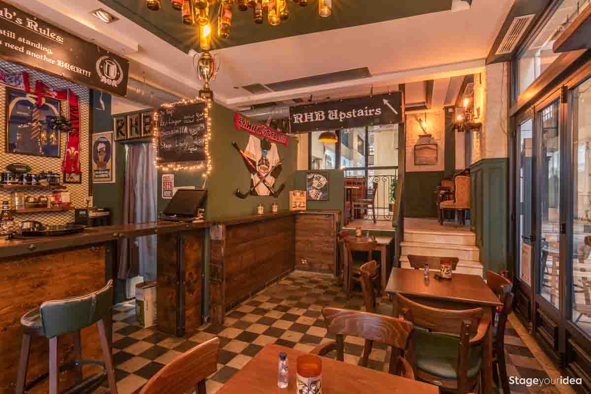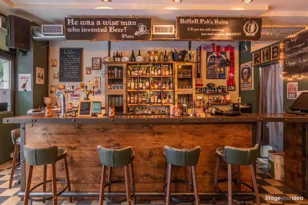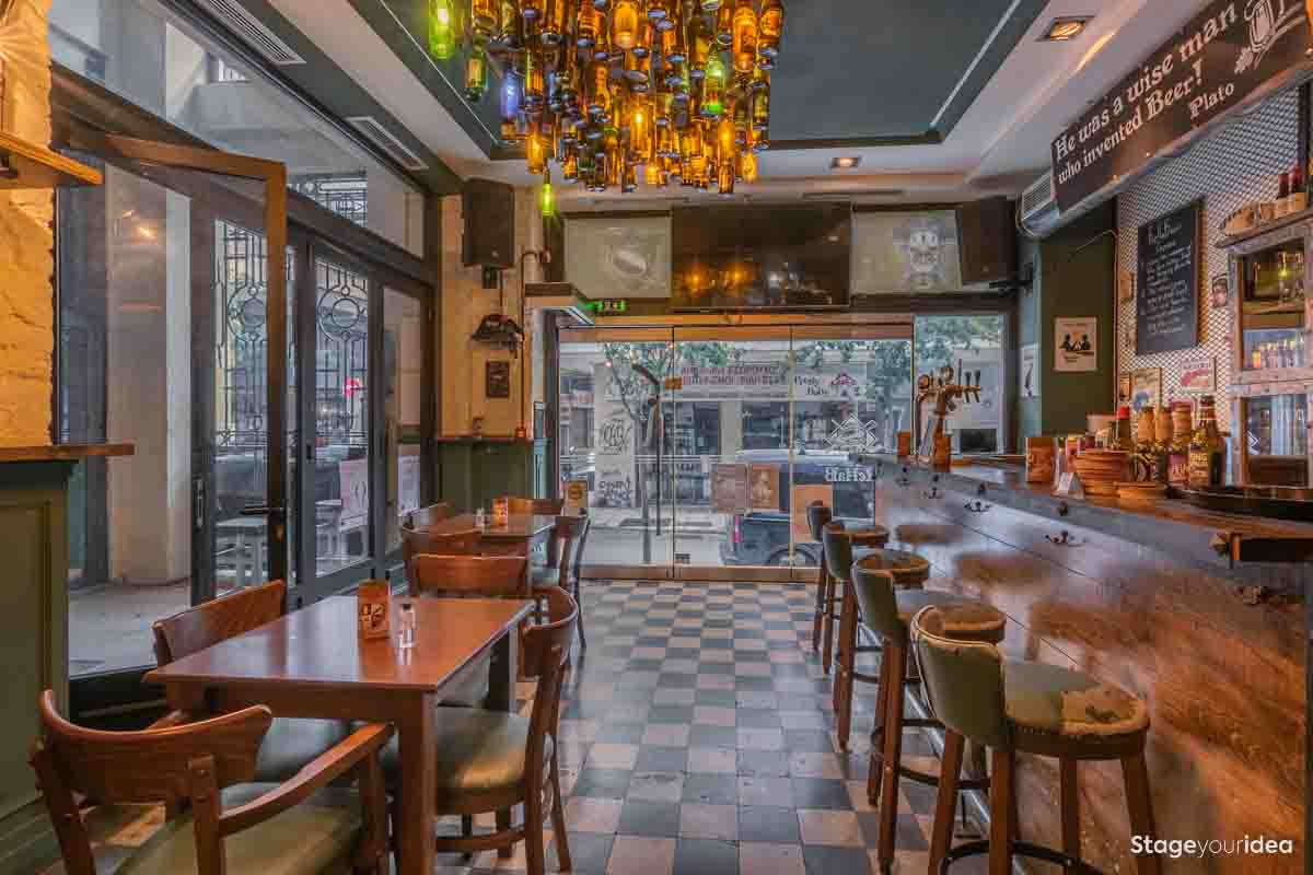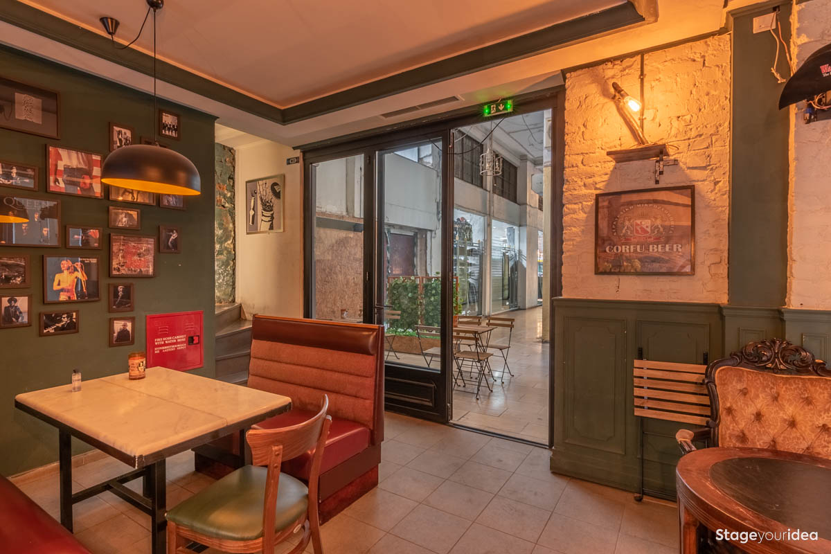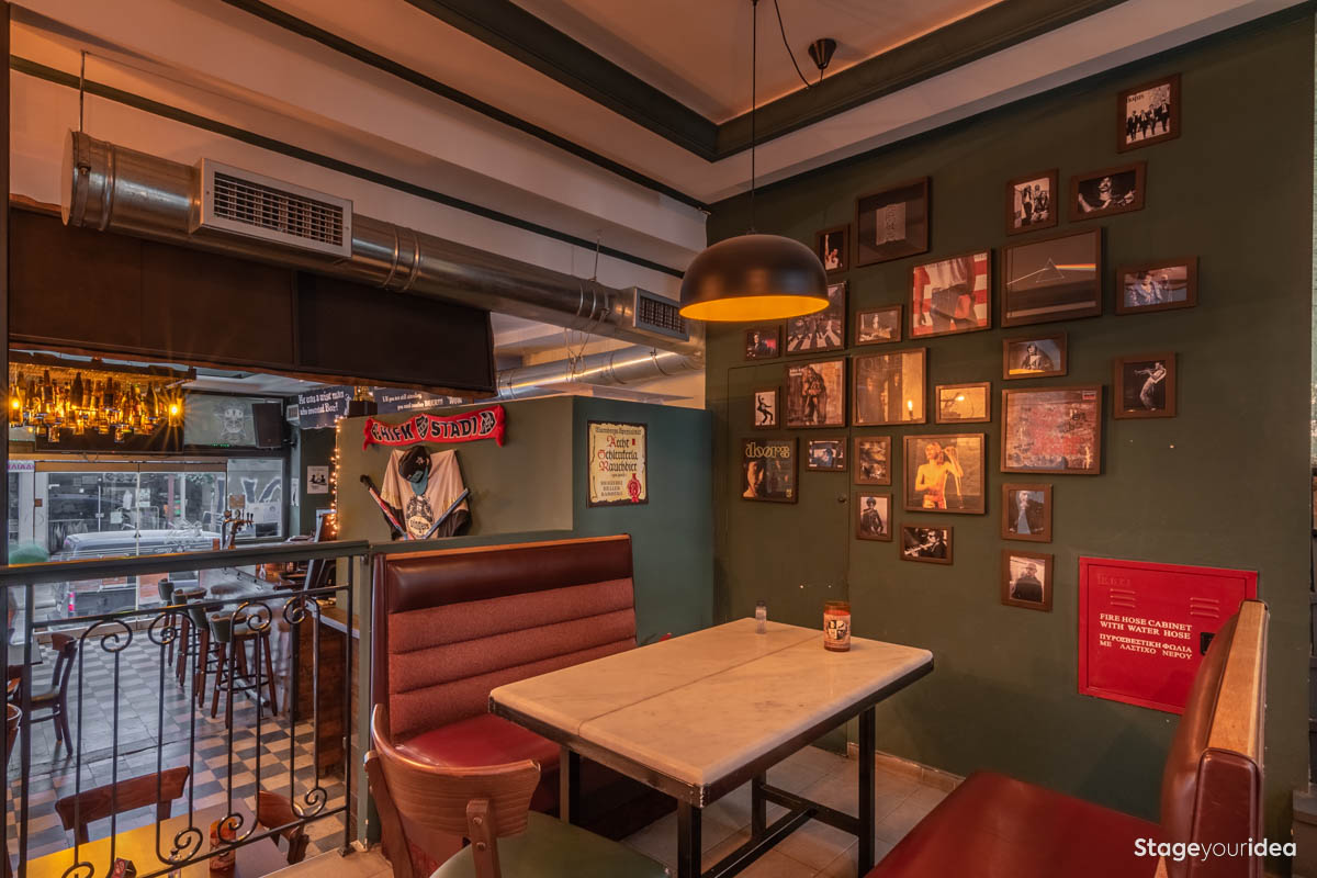 H αισθητική της «Ιρλανδικής Rugby Pub» διεκδικεί επάξια την αυθεντικότητα μια παραδοσιακής ιρλανδικής pub όπου η σκουρόχρωμη ξύλινη επίπλωση, οι ξεθωριασμένες επιφάνειες και τα ματ φινιρίσματα, τα γήινα υλικά όπως το μάρμαρο, το δάπεδο σε στυλ σκακιέρας, οι ασβεστολιθικοί τοίχοι κυριαρχούν προσδίδοντας μια old world, σπιτική ατμόσφαιρα. Η μακρά ιστορία της κουλτούρας των pub αποτυπώνεται στον εκκεντρικό φωτιστικό με την μπύρα να σηματοδοτεί το πρωταγωνιστικό μέσο κοινωνικοποίησης, στον εξοπλισμό hockey που καμαρώνει περήφανα ως έκθεμα στην κεντρική είσοδο μαζί με διάφορα άλλα αναμνηστικά που σχετίζονται με τα δυναμικά macho αθλήματα των rugby, hockey και baseball. Την χρωματική παλέτα μονοπωλεί το σκούρο πράσινο, σήμα κατατεθέν των ιρλανδικών pub, ο φωτισμός είναι χαμηλός και θερμός, oι πινακίδες στο bar δηλώνουν ευθαρσώς την κουλτούρα που διαπνέει την Αίθουσα, η τηλεόραση προδιαθέτει για επικές αθλητικές βραδιές, τα κάδρα απεικονίζουν εμβληματικές καλλιτεχνικές μορφές της rock μουσικής που άφησαν εποχή, και φυσικά οι διαλεχτές παγωμένες μπύρες θωρακισμένες στα βαρέλια τους αναμένουν να τις απολαύσετε.