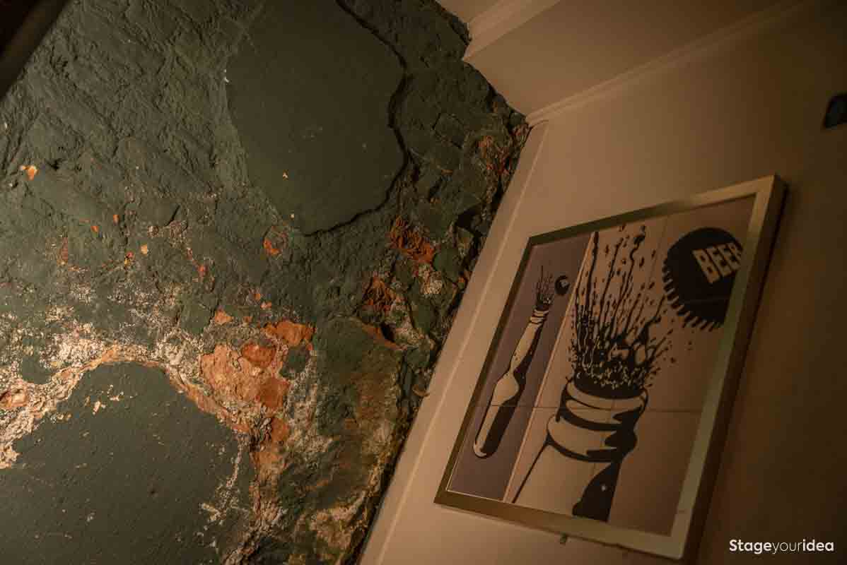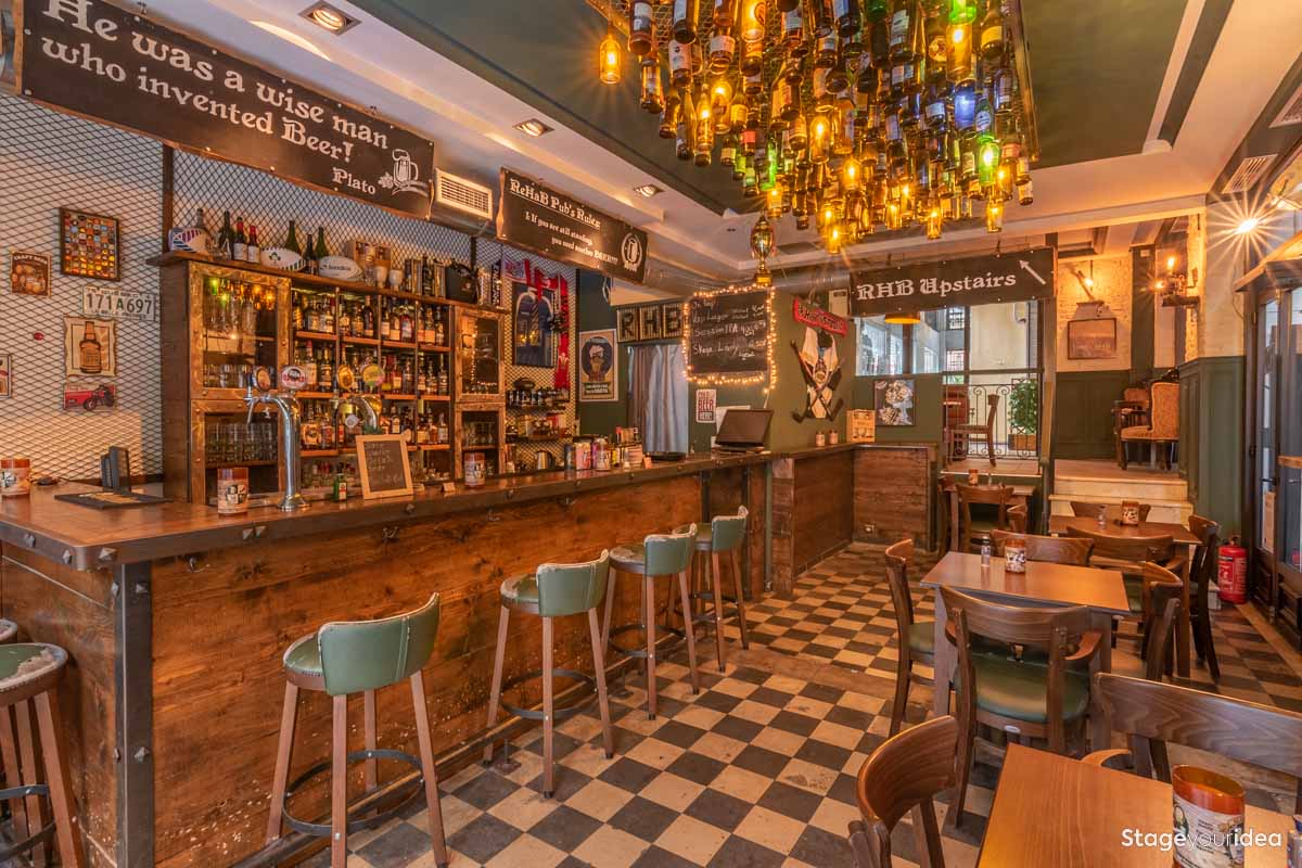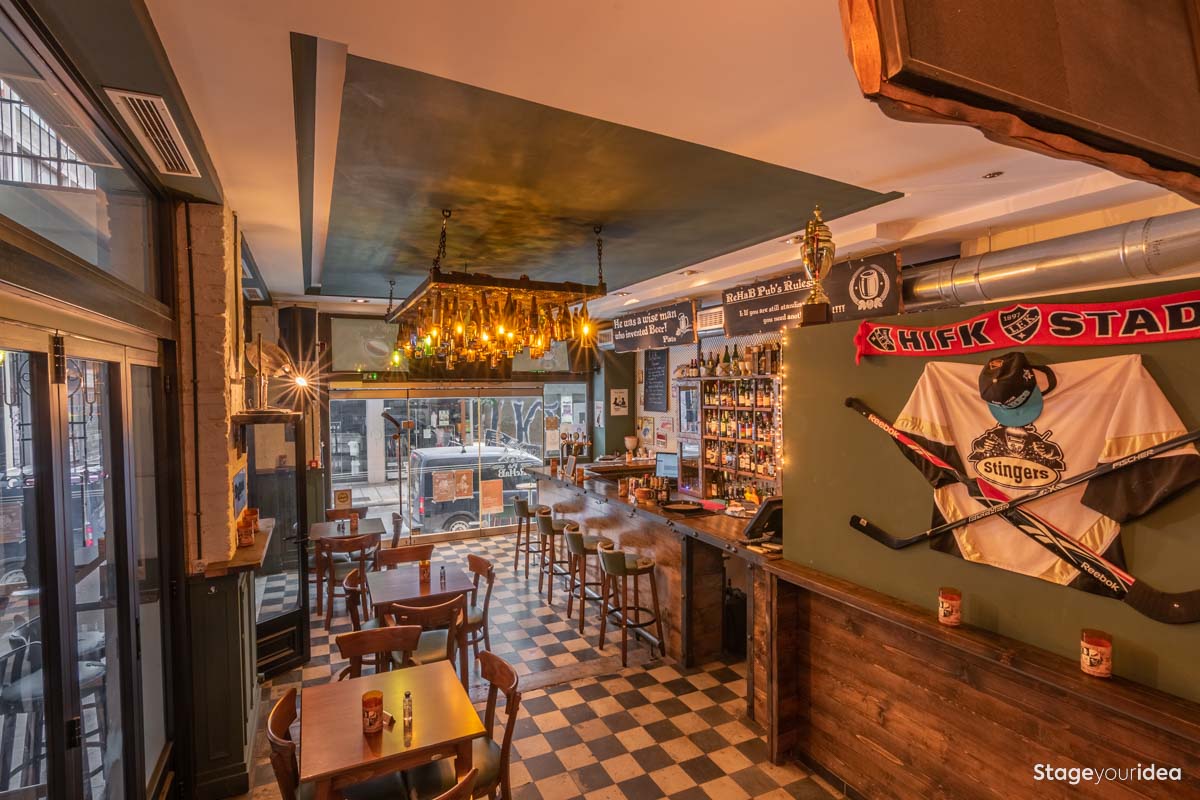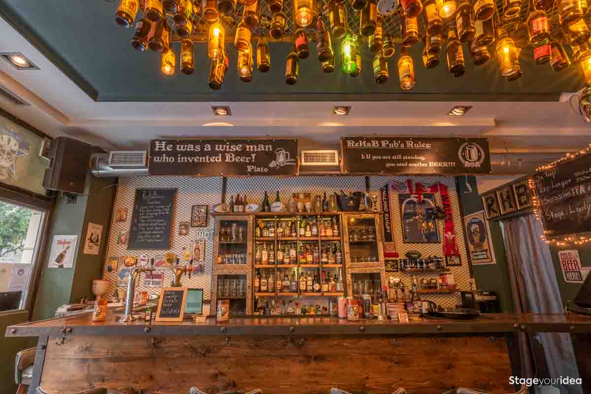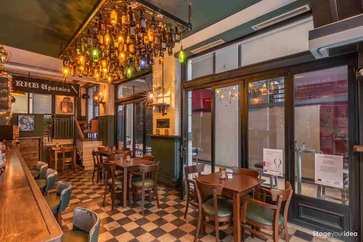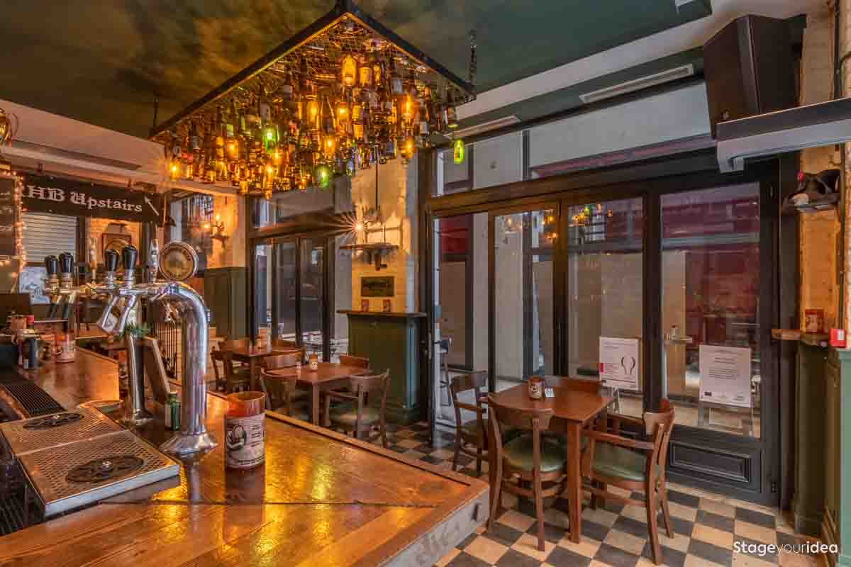 H αισθητική της «Ιρλανδικής Rugby Pub» διεκδικεί επάξια την αυθεντικότητα μια παραδοσιακής ιρλανδικής pub όπου η σκουρόχρωμη ξύλινη επίπλωση, οι ξεθωριασμένες επιφάνειες και τα ματ φινιρίσματα, τα γήινα υλικά όπως το μάρμαρο, το δάπεδο σε στυλ σκακιέρας, οι ασβεστολιθικοί τοίχοι κυριαρχούν προσδίδοντας μια old world, σπιτική ατμόσφαιρα. Η μακρά ιστορία της κουλτούρας των pub αποτυπώνεται στον εκκεντρικό φωτιστικό με την μπύρα να σηματοδοτεί το πρωταγωνιστικό μέσο κοινωνικοποίησης, στον εξοπλισμό hockey που καμαρώνει περήφανα ως έκθεμα στην κεντρική είσοδο μαζί με διάφορα άλλα αναμνηστικά που σχετίζονται με τα δυναμικά macho αθλήματα των rugby, hockey και baseball. Την χρωματική παλέτα μονοπωλεί το σκούρο πράσινο, σήμα κατατεθέν των ιρλανδικών pub, ο φωτισμός είναι χαμηλός και θερμός, oι πινακίδες στο bar δηλώνουν ευθαρσώς την κουλτούρα που διαπνέει την Αίθουσα, η τηλεόραση προδιαθέτει για επικές αθλητικές βραδιές, τα κάδρα απεικονίζουν εμβληματικές καλλιτεχνικές μορφές της rock μουσικής που άφησαν εποχή, και φυσικά οι διαλεχτές παγωμένες μπύρες θωρακισμένες στα βαρέλια τους αναμένουν να τις απολαύσετε.
