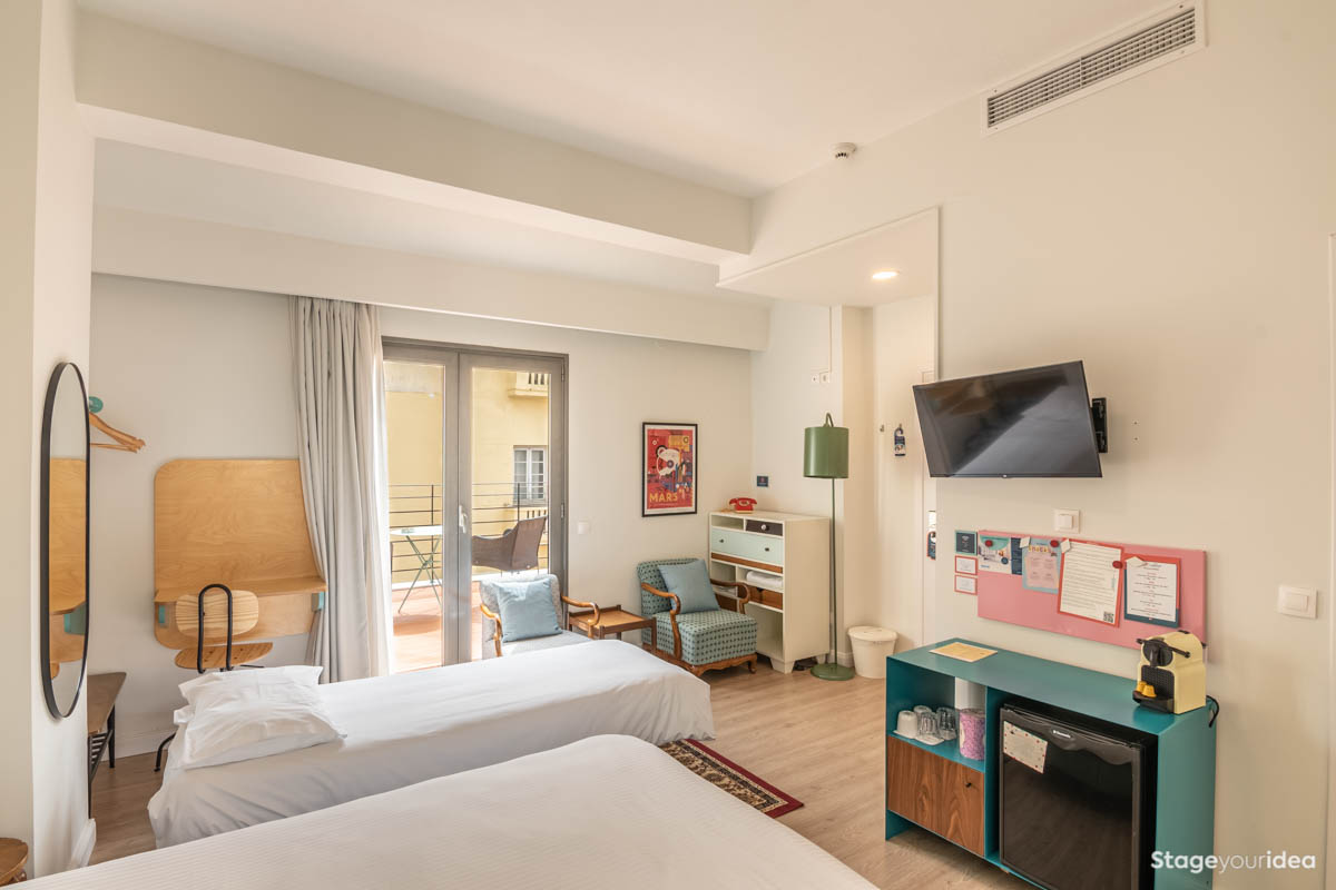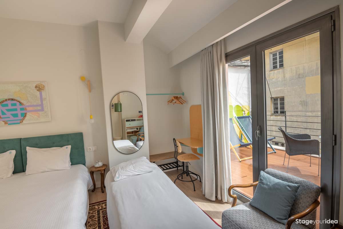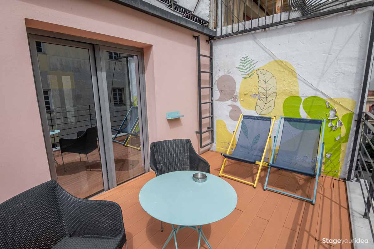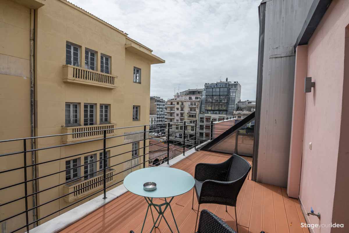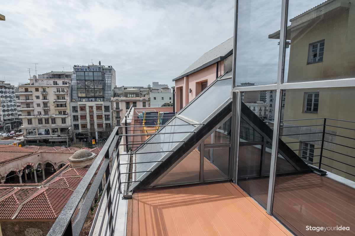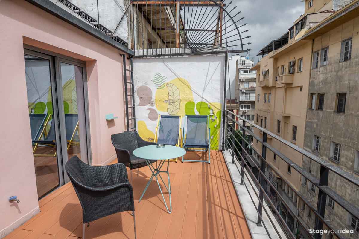 H «Ρετιρέ Σουίτα με Μπαλκονάκι» διαθέτει μια πανοραμική θέα που σε καθηλώνει. Με ντελικάτη εσωτερική διακόσμηση, με εξωτερικό φόντο τον απέραντο ουρανό και ένα επιβλητικό κτίριο αισθητικής Bauhaus είναι δεδομένο ότι έχετε επιλέξει μια τοποθεσία πέρα από τα καθιερωμένα, για πρωτοποριακές παραγωγές. Η Αίθουσα βρίσκεται στην αιχμή των εναλλακτικών και ιδιαίτερων χώρων στον τομέα των παραγωγών.