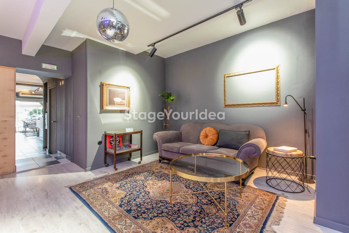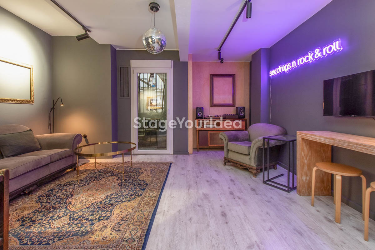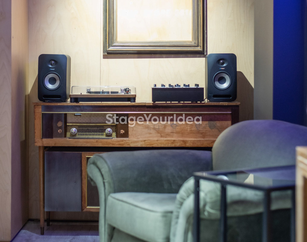 Η αισθητική συνδυάζει urban-vintage στοιχεία με cozy lounge ατμόσφαιρα: χαμηλός φωτισμός, track lights, vinyl setup, ρετρο έπιπλα και καθαρή παλέτα γκρι και ξύλου. Οι διαφορετικές “γωνιές” της αίθουσας δημιουργούν φυσικό zoning για συζήτηση, ηχογράφηση, παρουσιάσεις ή social interaction, ενώ η ντισκόμπαλα και τα ατμοσφαιρικά φωτιστικά επιτρέπουν εύκολη μετάβαση σε πιο festive mood για πάρτυ γενεθλίων ή αποφοίτησης. Η πρακτική διαρρύθμιση υποστηρίζει pop-up εκθέσεις και bazaar, χωρίς να χάνεται η αίσθηση οικειότητας και ο χαρακτήρας της αίθουσας.