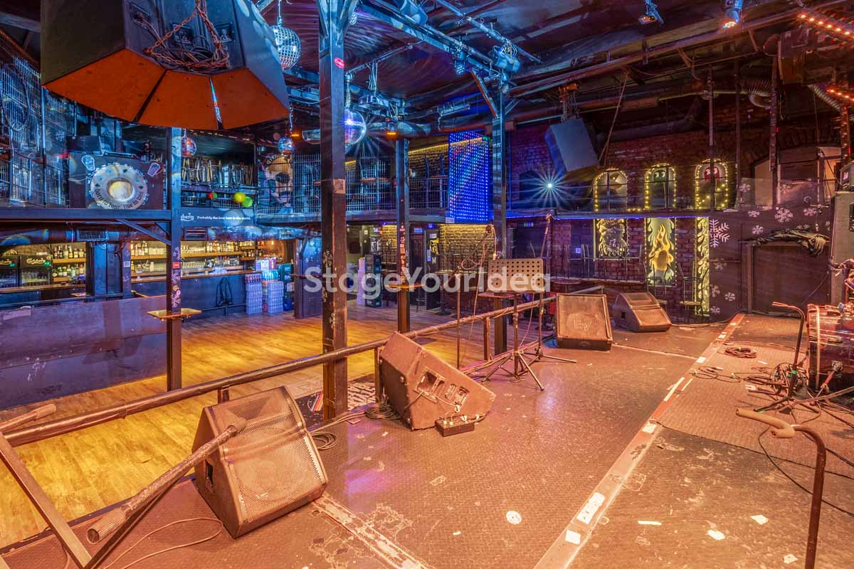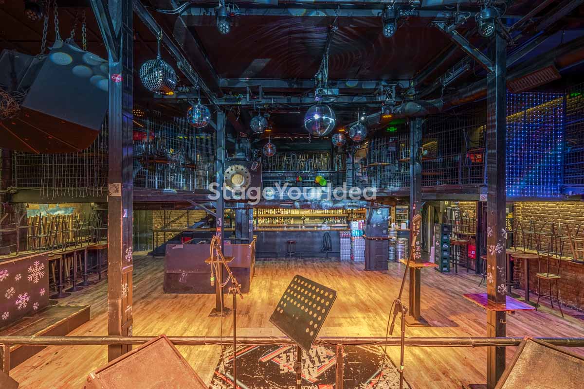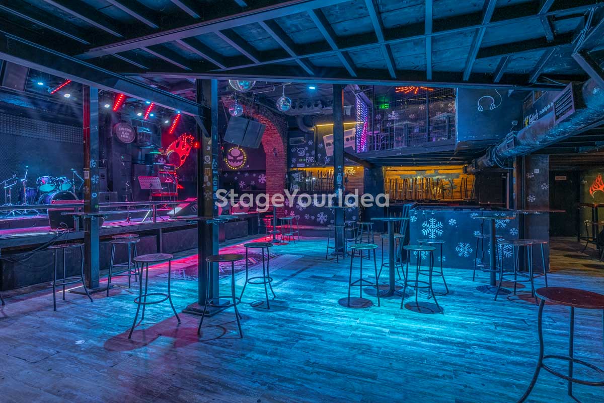 Η σκηνή, με επαγγελματικά συστήματα ήχου και φωτισμού, συμπληρώνεται από στρατηγικά τοποθετημένα πατάρια και ανοιχτό χώρο στο δάπεδο, εξασφαλίζοντας βέλτιστη ορατότητα για τους καλεσμένους, είτε κάθονται είτε όρθιοι.