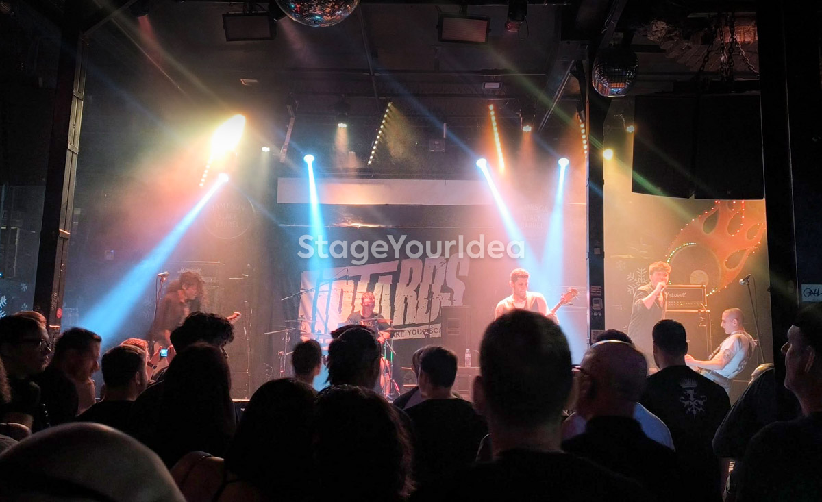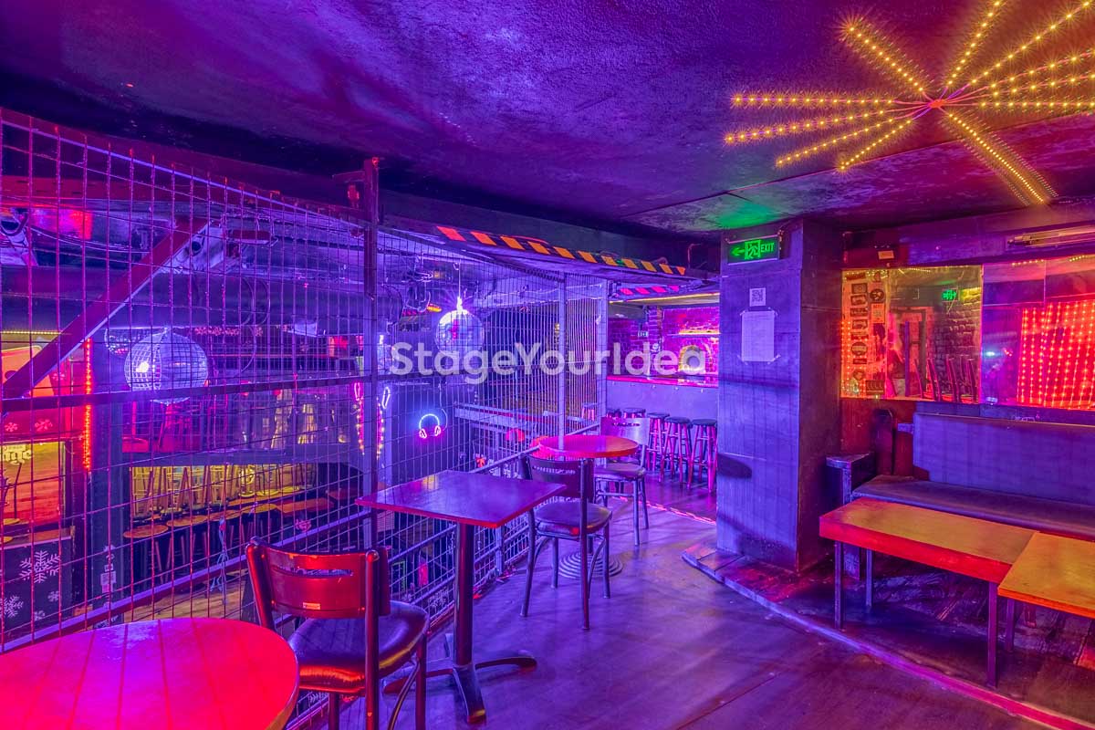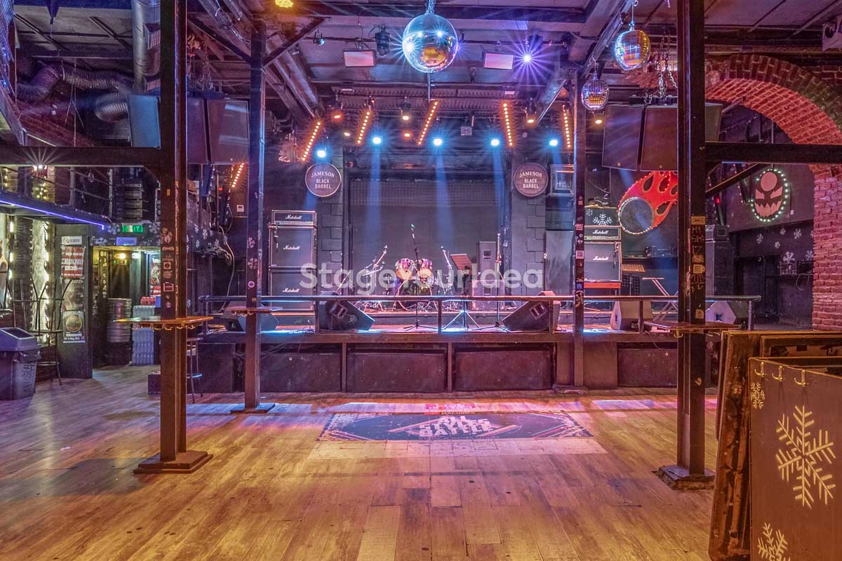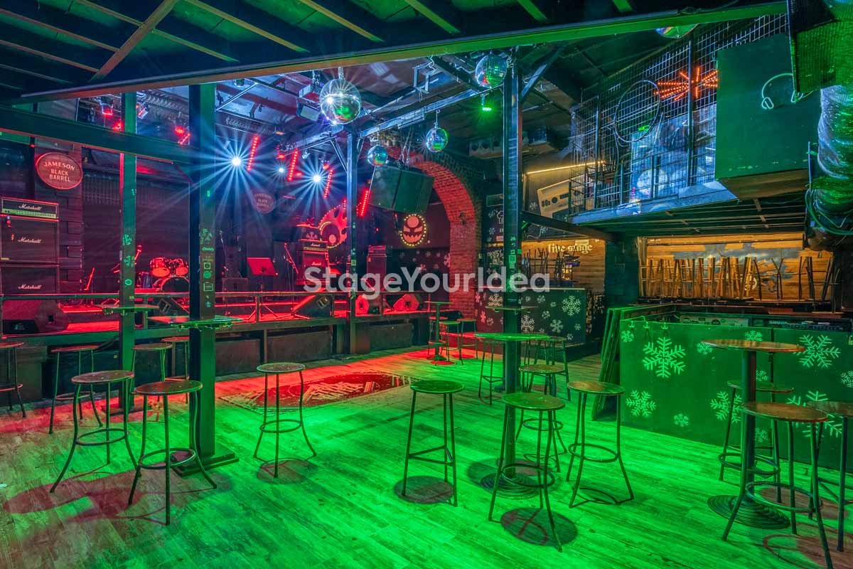 Η σκηνή, με επαγγελματικά συστήματα ήχου και φωτισμού, συμπληρώνεται από στρατηγικά τοποθετημένα πατάρια και ανοιχτό χώρο στο δάπεδο, εξασφαλίζοντας βέλτιστη ορατότητα για τους καλεσμένους, είτε κάθονται είτε όρθιοι.