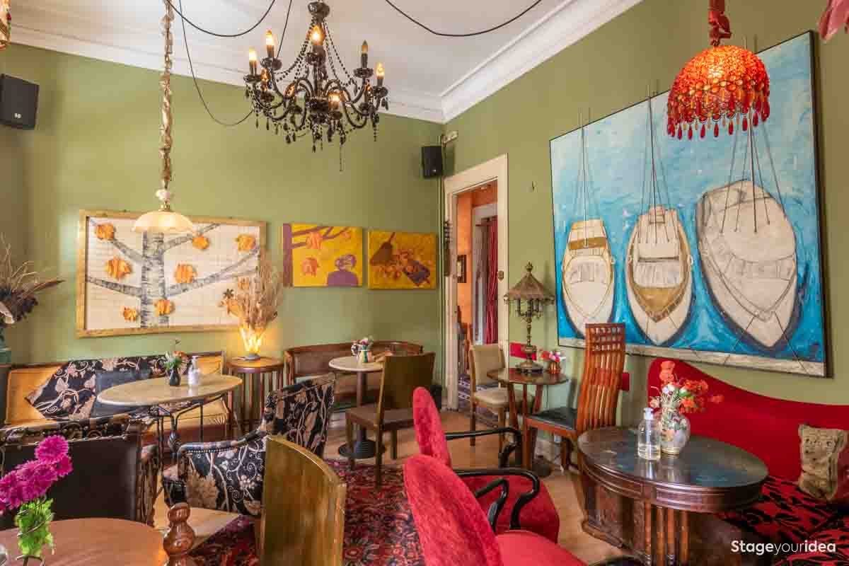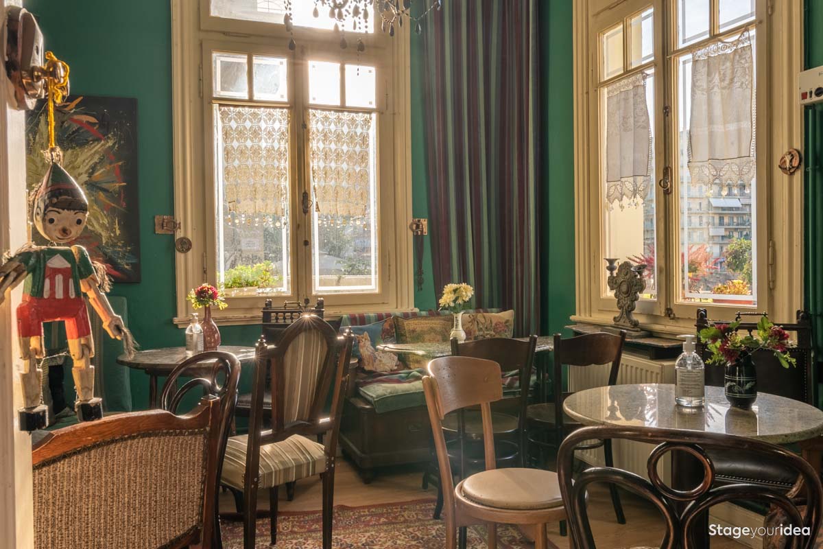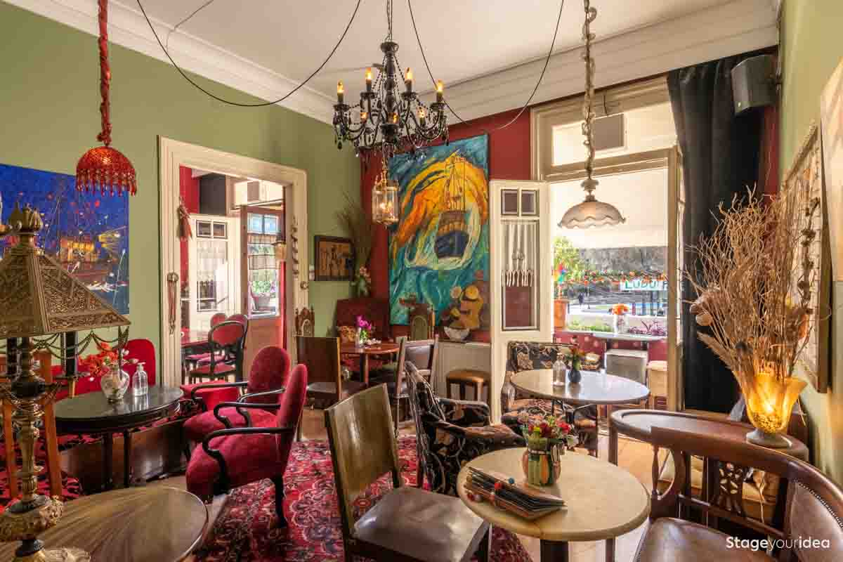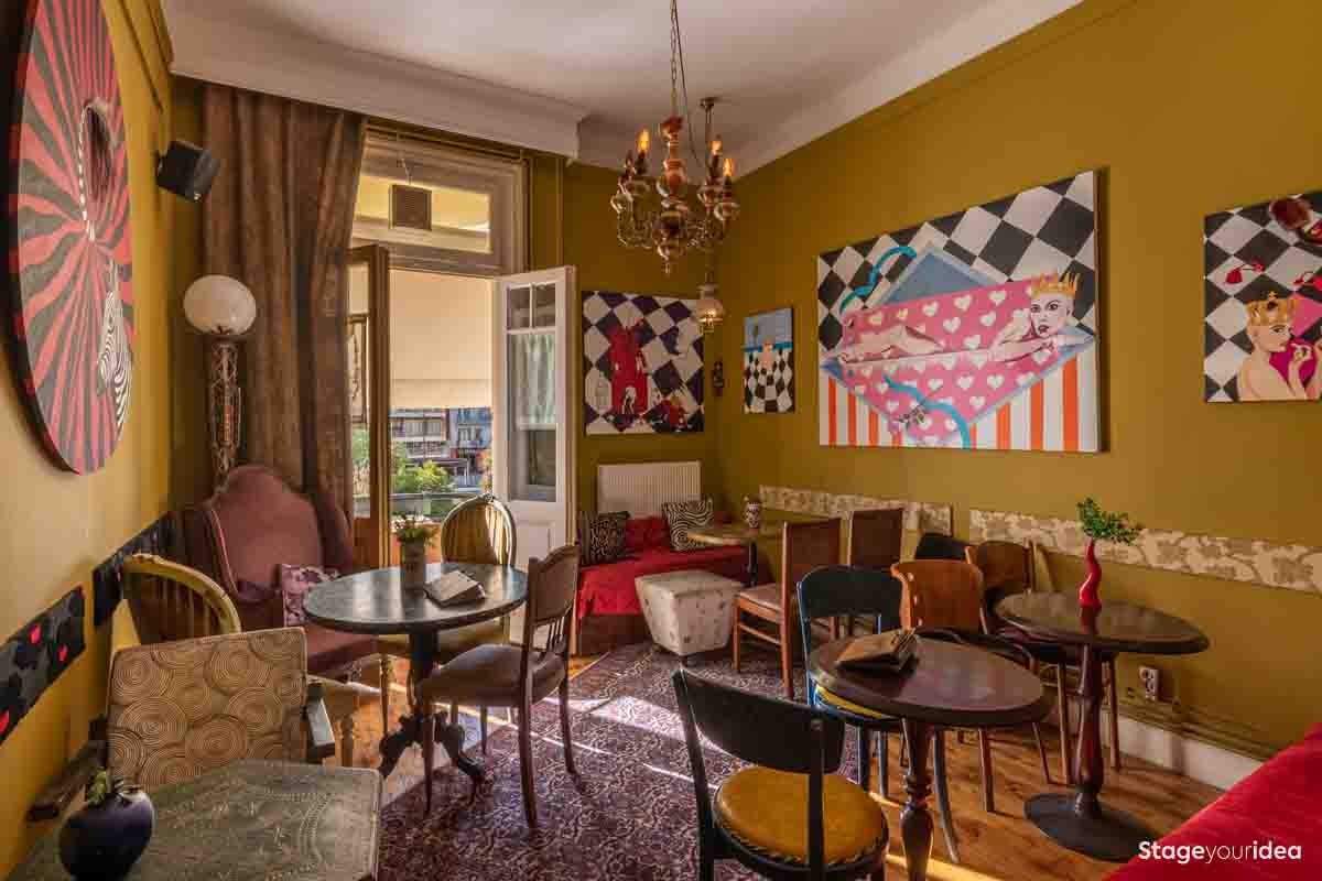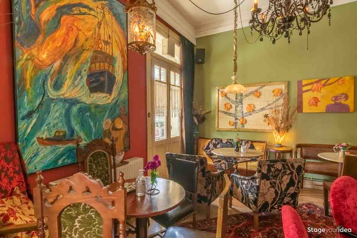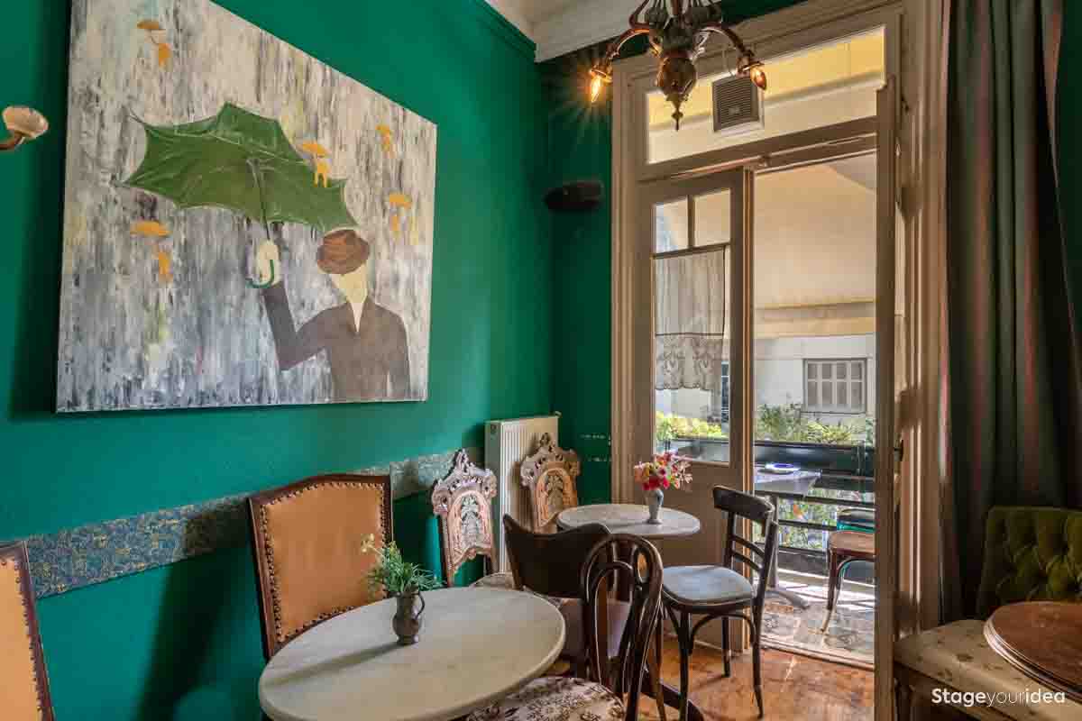 Για Παραγωγές Στο «Καφέ με Δραματικό Διακοσμητικό Ύφος» θα συναντήσετε την απρόσμενη συνύπαρξη του μπαρόκ όπως αποτυπώνεται στις διακοσμητικές λεπτομέρειες των πολυελαίων και στις καμπύλες των καθισμάτων, του ρουστίκ με το ακατέργαστο ξύλο και τις ανάγλυφες επιφάνειες, του boho chic με το ανέμελο layering των μοτίβων και των υφών.