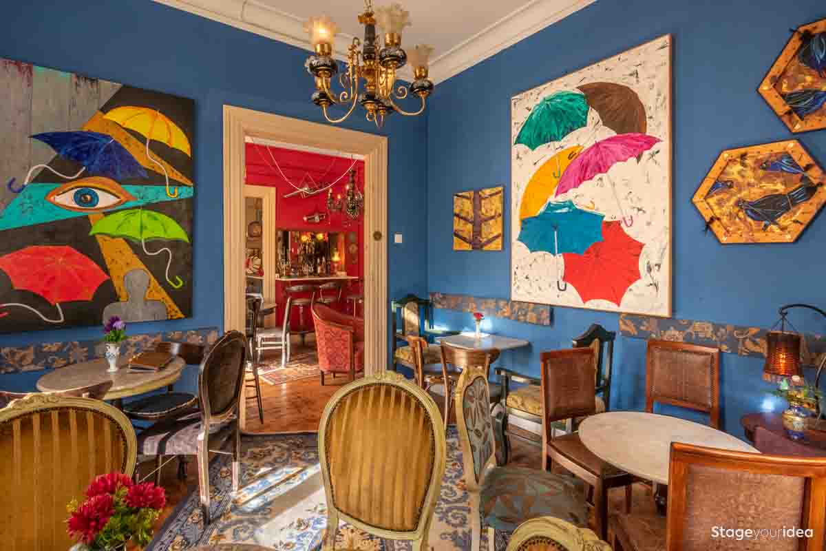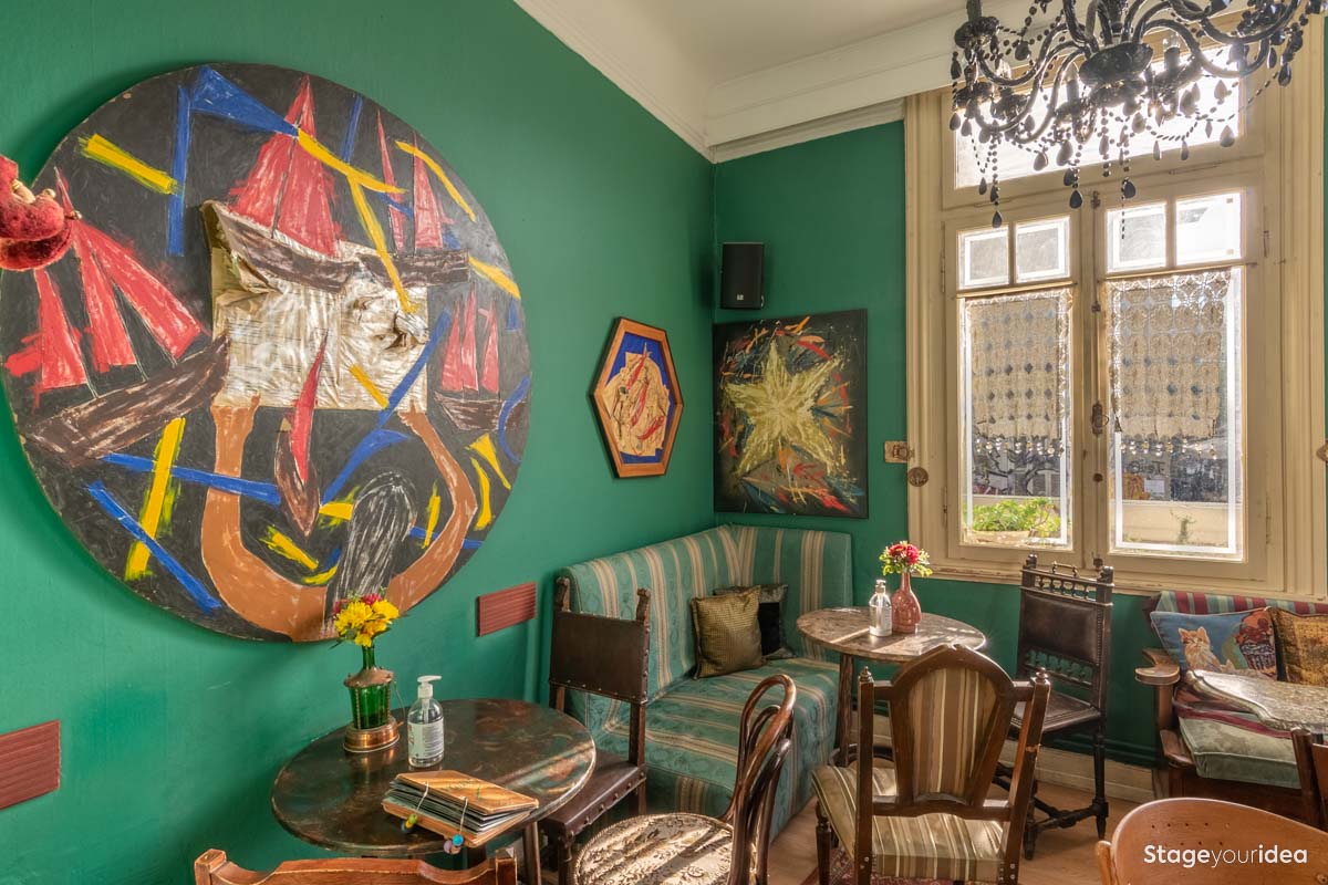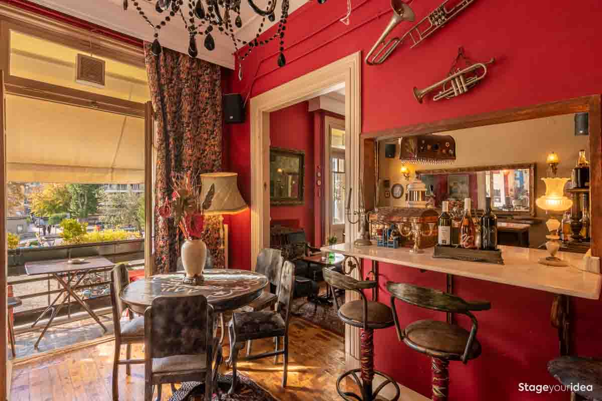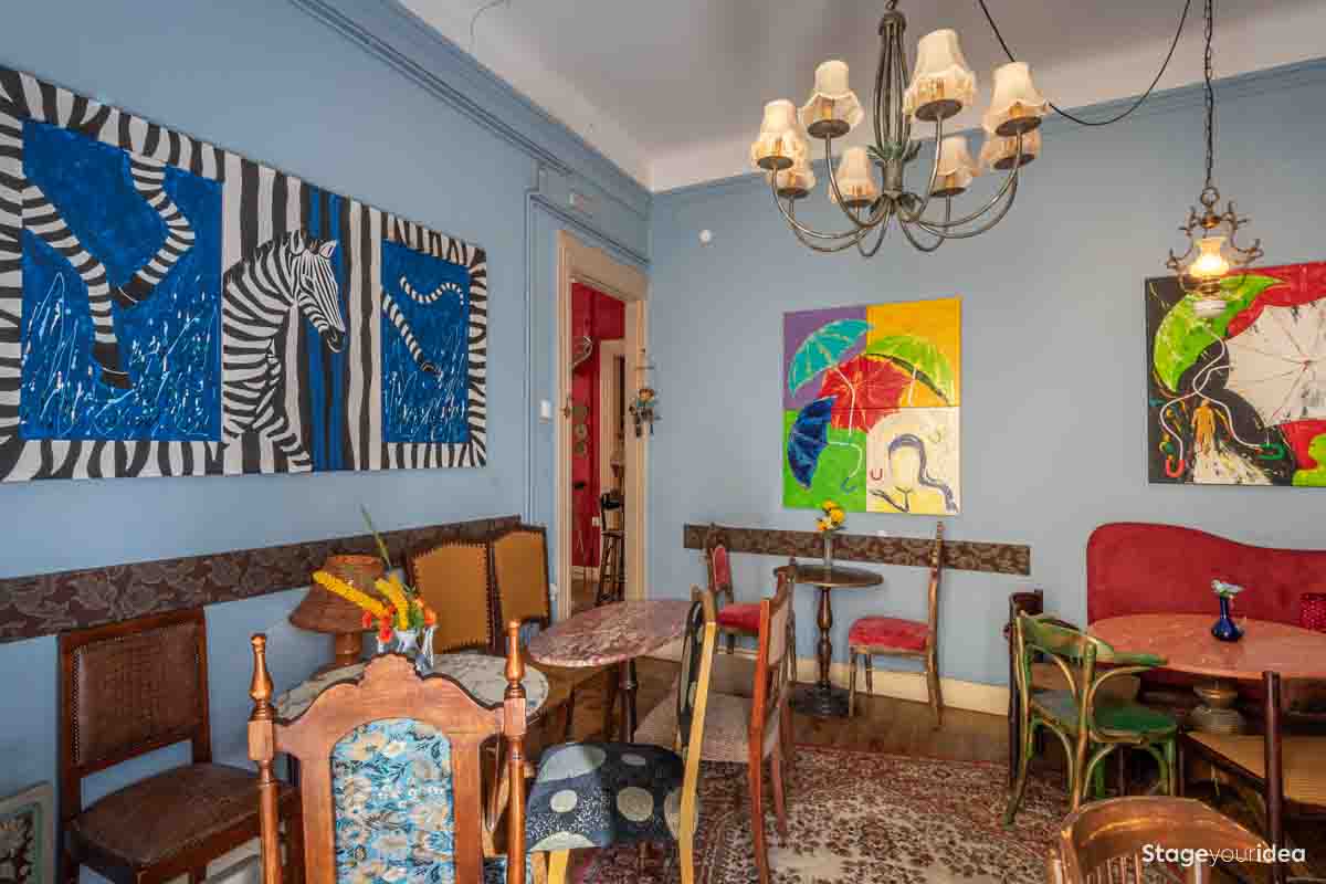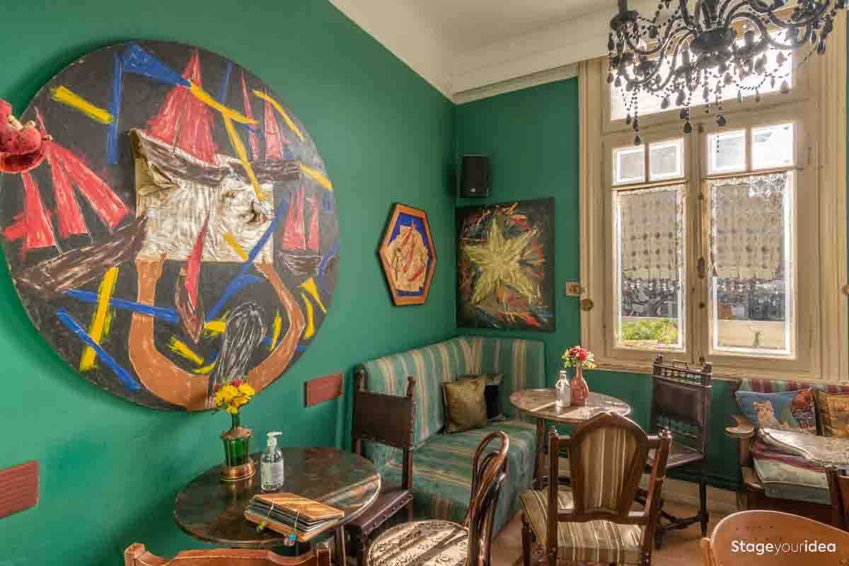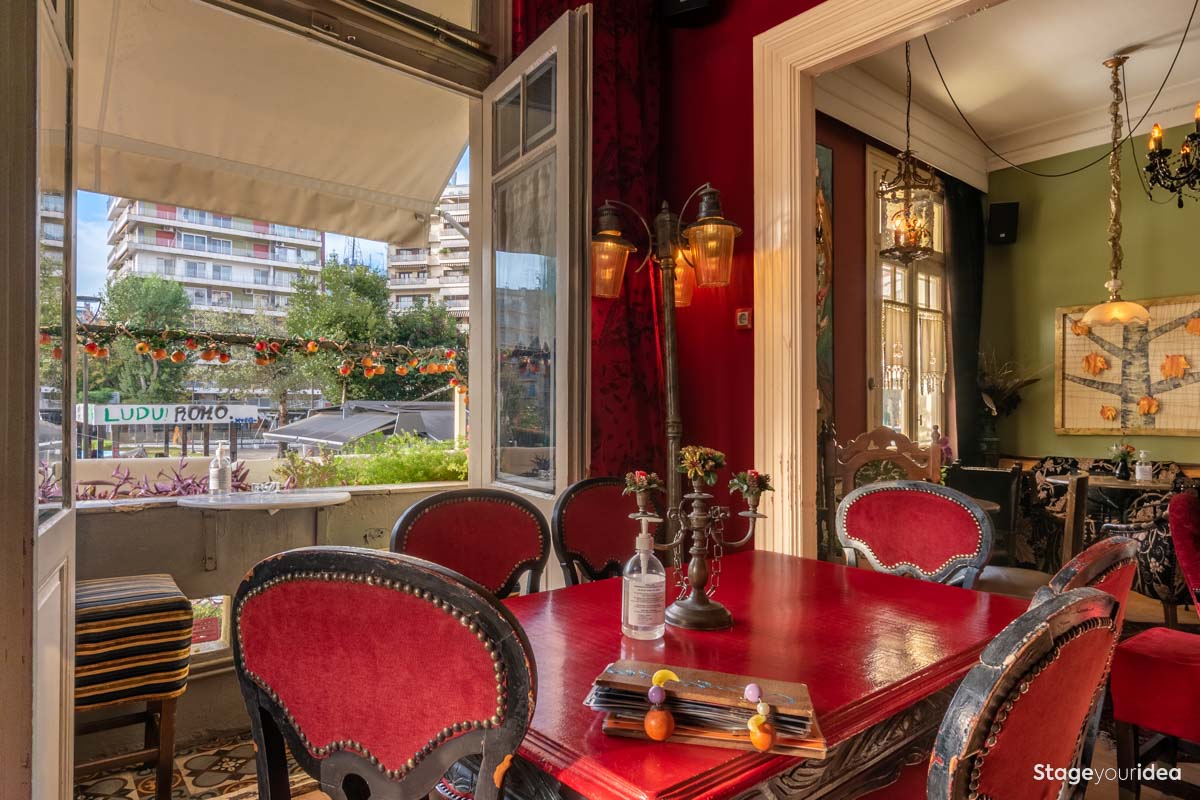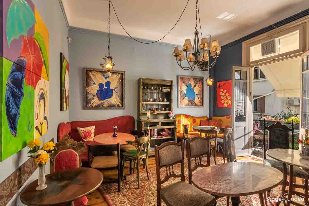 Για Παραγωγές Στο «Καφέ με Δραματικό Διακοσμητικό Ύφος» θα συναντήσετε την απρόσμενη συνύπαρξη του μπαρόκ όπως αποτυπώνεται στις διακοσμητικές λεπτομέρειες των πολυελαίων και στις καμπύλες των καθισμάτων, του ρουστίκ με το ακατέργαστο ξύλο και τις ανάγλυφες επιφάνειες, του boho chic με το ανέμελο layering των μοτίβων και των υφών.