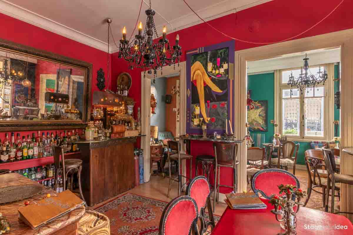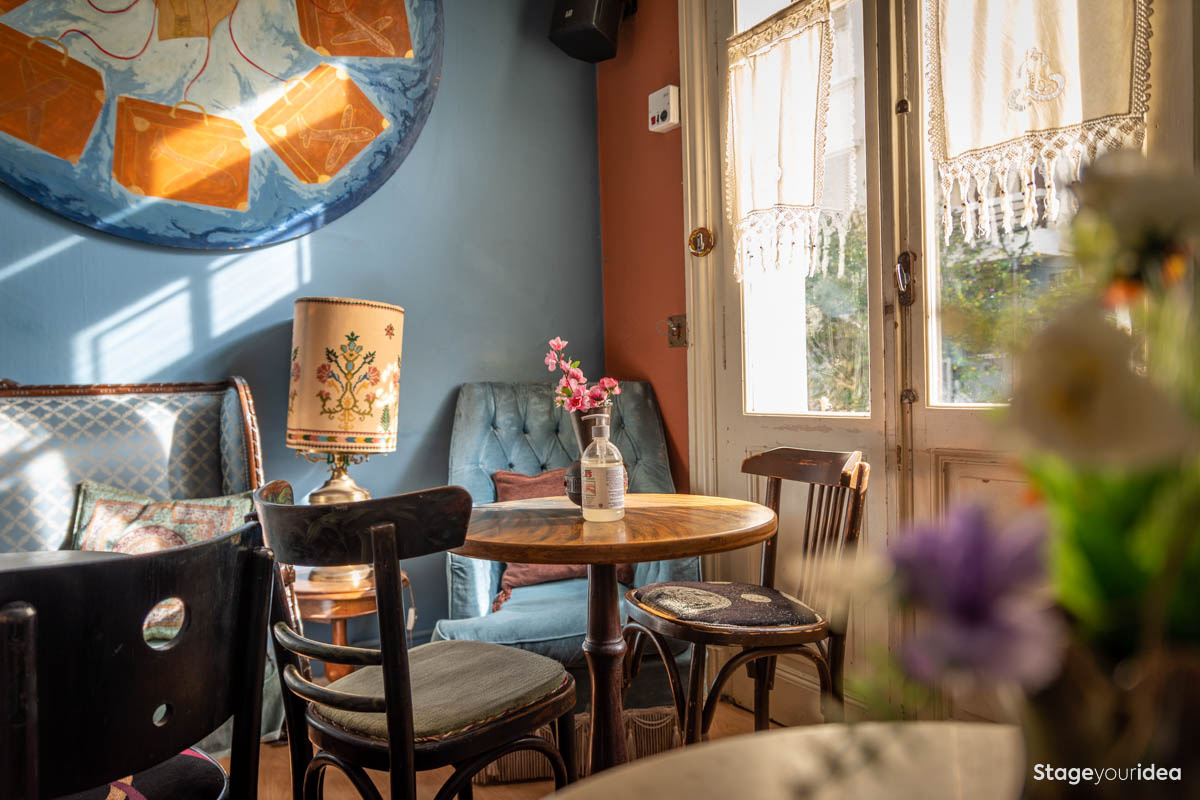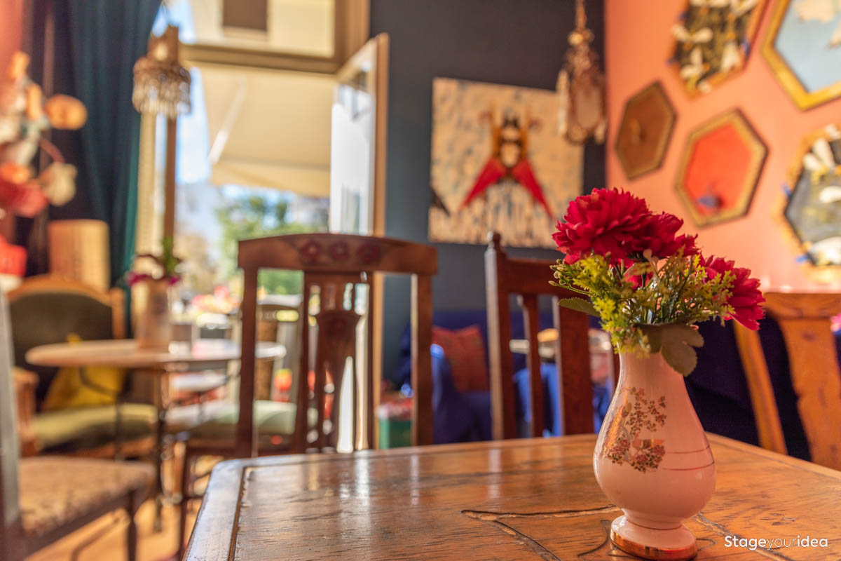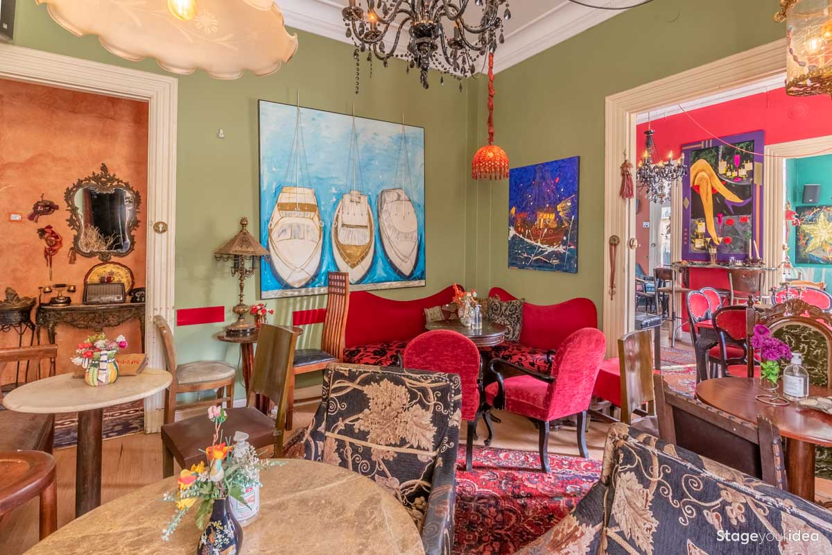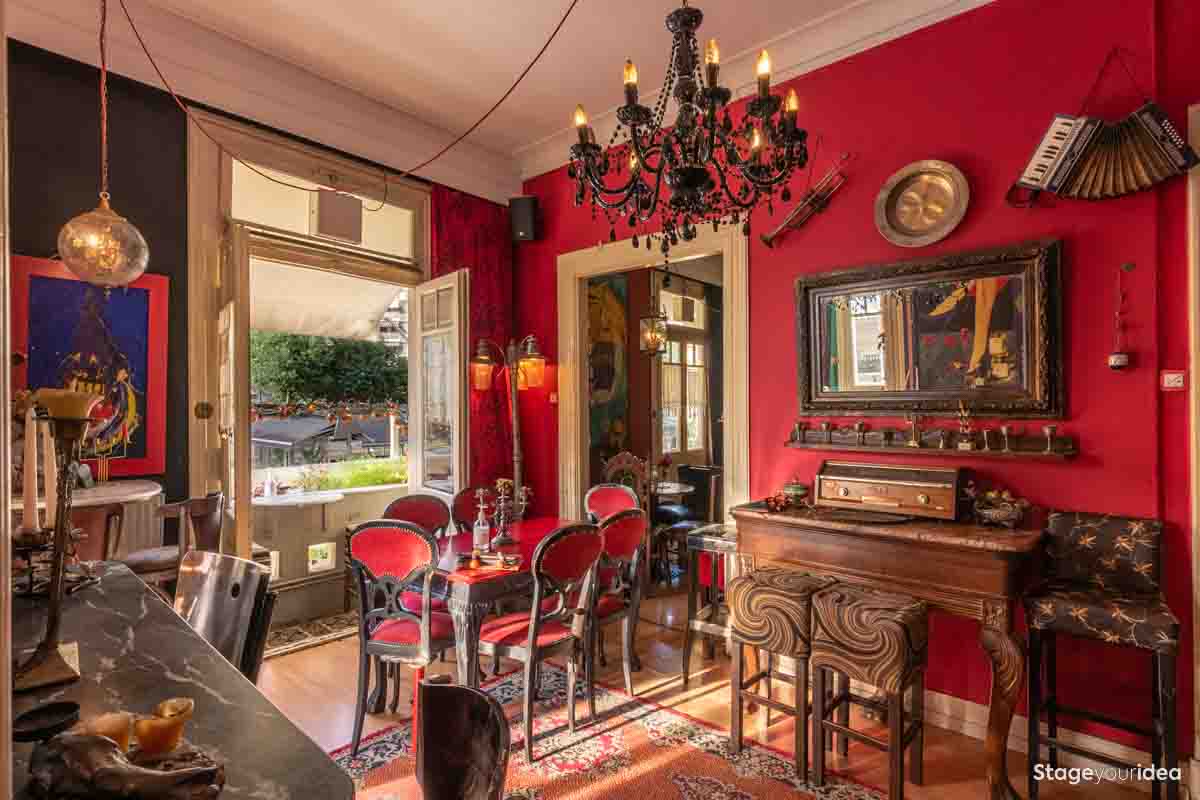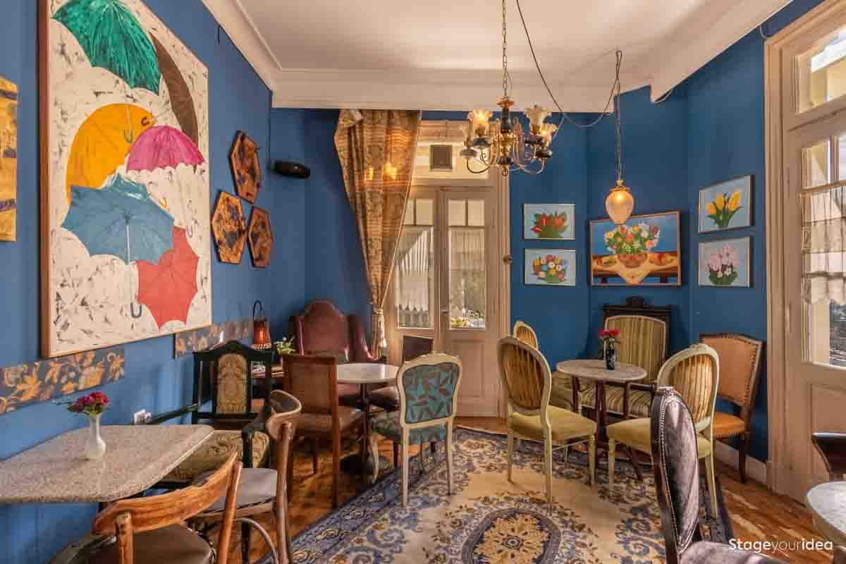 Για Παραγωγές Στο «Καφέ με Δραματικό Διακοσμητικό Ύφος» θα συναντήσετε την απρόσμενη συνύπαρξη του μπαρόκ όπως αποτυπώνεται στις διακοσμητικές λεπτομέρειες των πολυελαίων και στις καμπύλες των καθισμάτων, του ρουστίκ με το ακατέργαστο ξύλο και τις ανάγλυφες επιφάνειες, του boho chic με το ανέμελο layering των μοτίβων και των υφών.