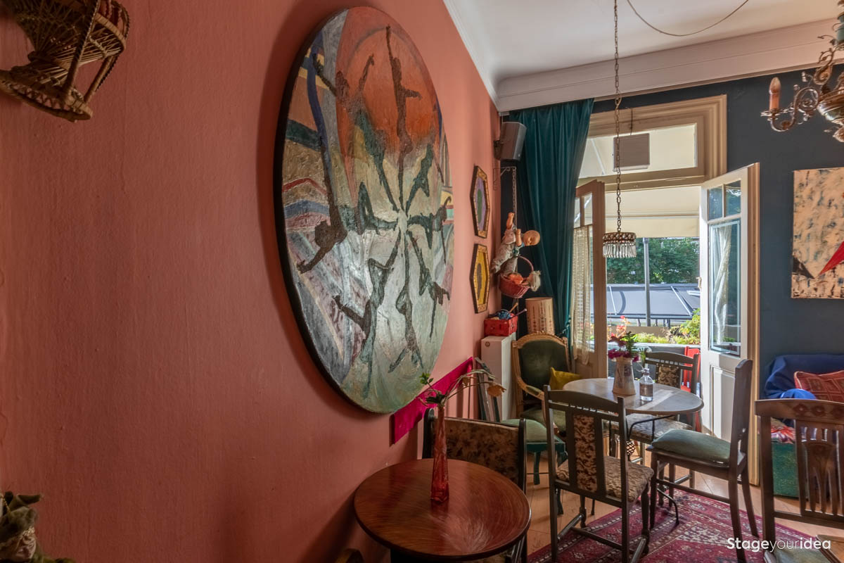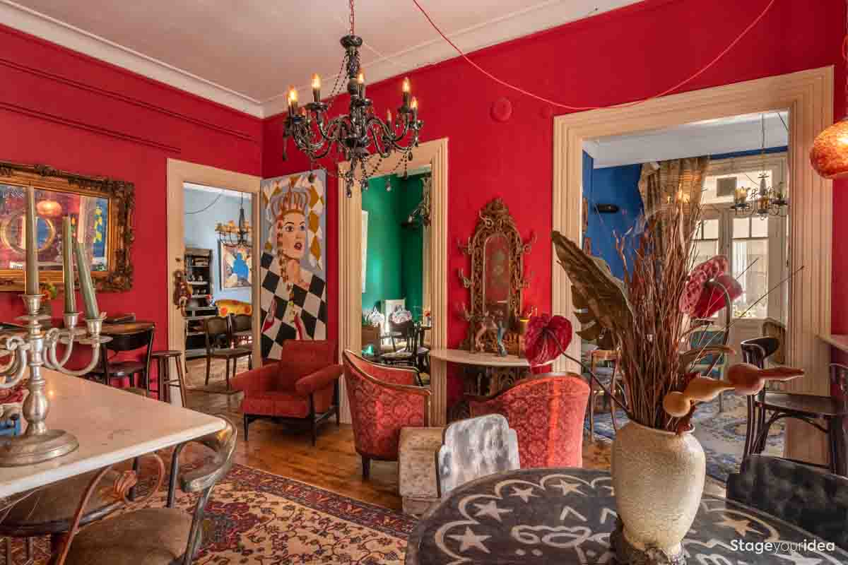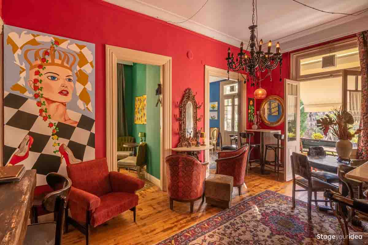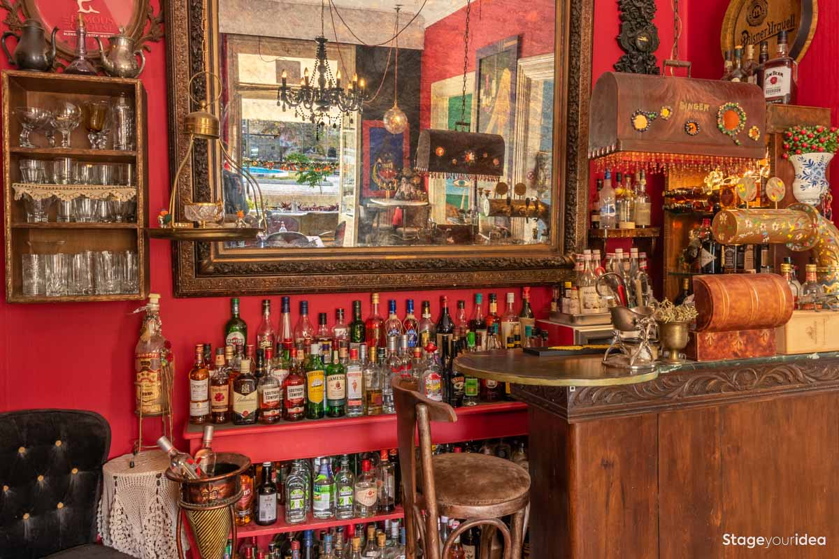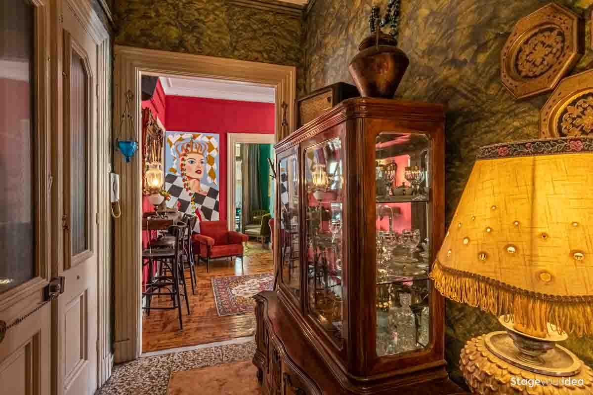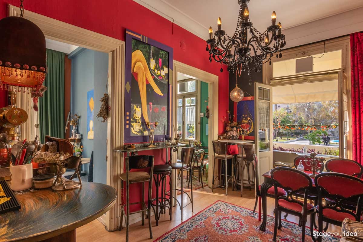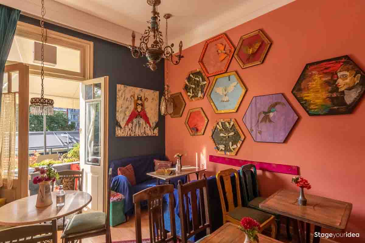 Για Παραγωγές Στο «Καφέ με Δραματικό Διακοσμητικό Ύφος» θα συναντήσετε την απρόσμενη συνύπαρξη του μπαρόκ όπως αποτυπώνεται στις διακοσμητικές λεπτομέρειες των πολυελαίων και στις καμπύλες των καθισμάτων, του ρουστίκ με το ακατέργαστο ξύλο και τις ανάγλυφες επιφάνειες, του boho chic με το ανέμελο layering των μοτίβων και των υφών.