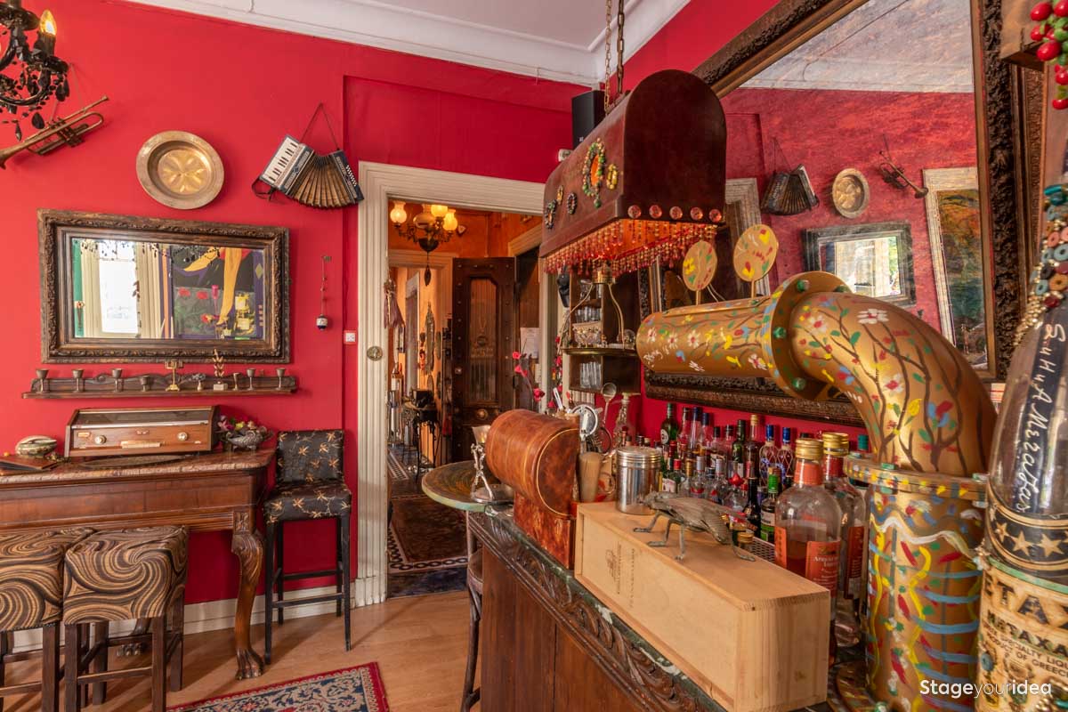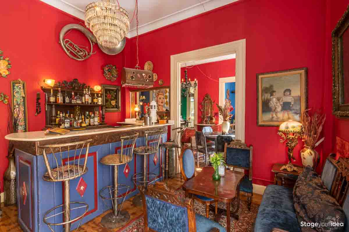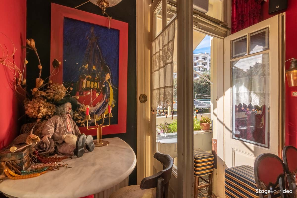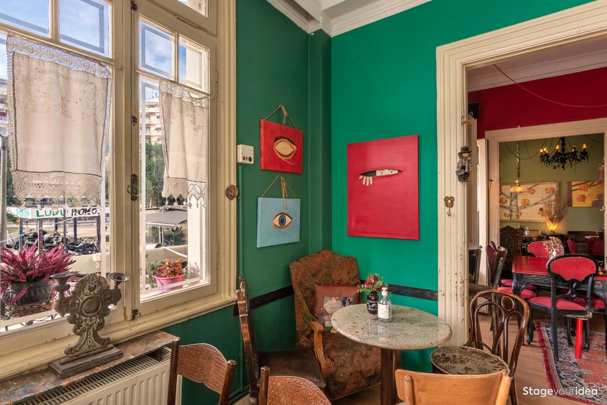 Η αισθητική του «Καφέ με Δραματικό Διακοσμητικό Ύφος» αναδύει φαντασιακές εικόνες από τα γαλλικά σαλόνια του 17ου και 18ου όπου οι τότε κοινότητες λογίων, επιστημόνων, συγγραφέων και καλλιτεχνών αντάμωναν προκειμένου να συνδυάσουν βαθυστόχαστες συζητήσεις με αλκοόλ και ευχάριστη παρέα. Ο μαξιμαλισμός στον διάκοσμο και η ζωηρή χρωματική παλέτα διατηρούν αμείωτο το ενδιαφέρον του επισκέπτη. Τα vintage έπιπλα και τα ρετρό διακοσμητικά αντικείμενα μεταδίδουν την γοητεία του παρελθόντος διεκδικώντας χώρο να αναδειχθούν ανάμεσα σε καλλιτεχνικές πινελιές, όπως είναι οι αναρτημένοι στους τοίχους πίνακες ζωγραφικής με μεταμοντέρνα θέματα και τεχνοτροπίες. Ο ήλιος διαχέει πλούσιο το φως του σε όλα τα δωμάτια της Αίθουσας μέσα από τα μεγάλα παράθυρα και τις πολυάριθμες μπαλκονόπορτες οι οποίες διευρύνουν τον οπτικό - και όχι μόνο - ορίζοντα ενθαρρύνοντάς σε ν’ αγναντέψεις παρατηρώντας και αλληλεπιδρώντας νοερά με το εξωτερικό περιβάλλον.