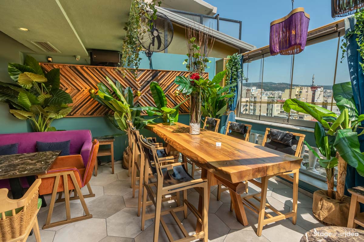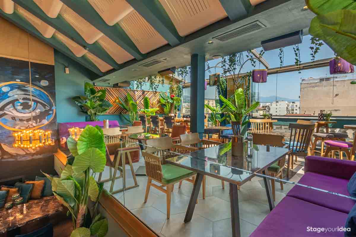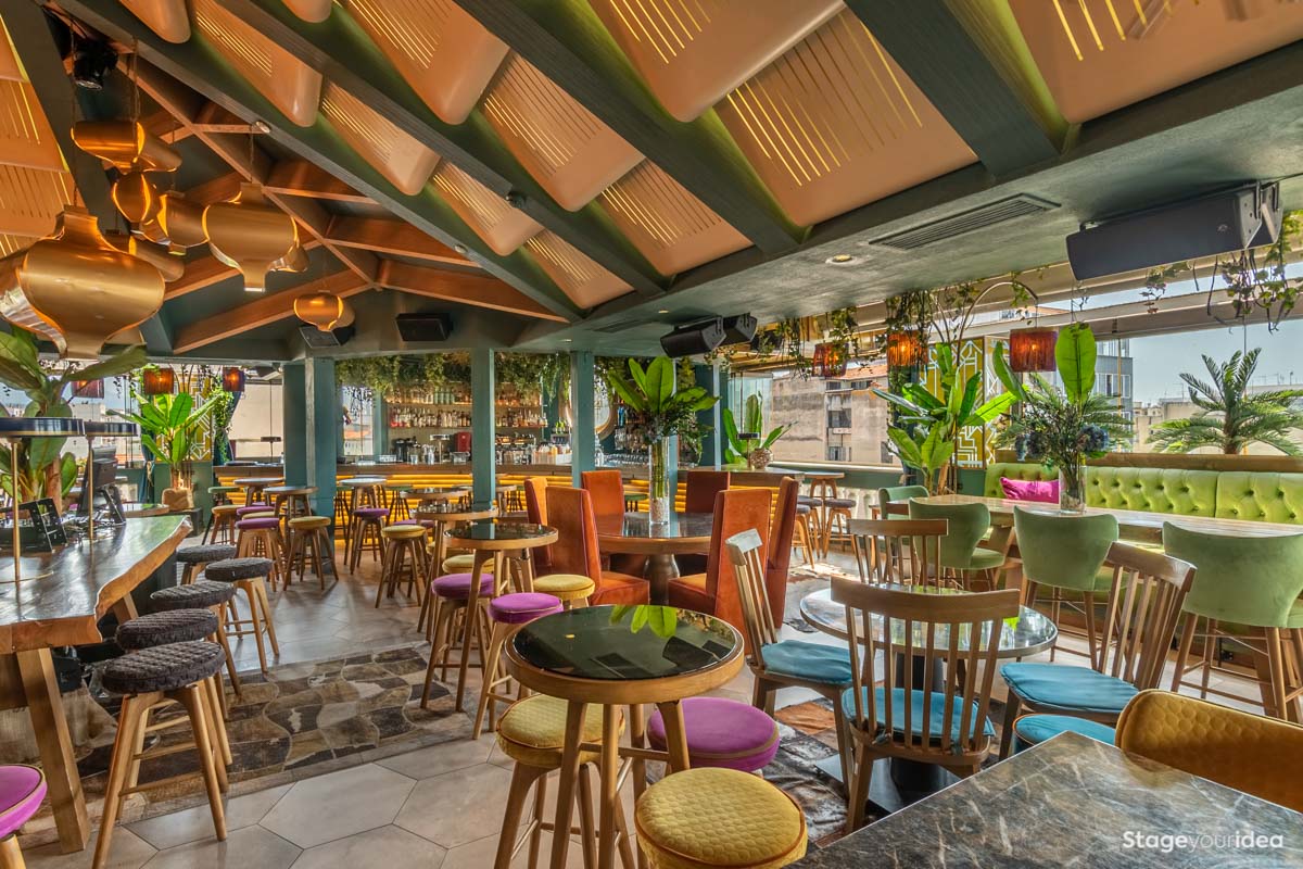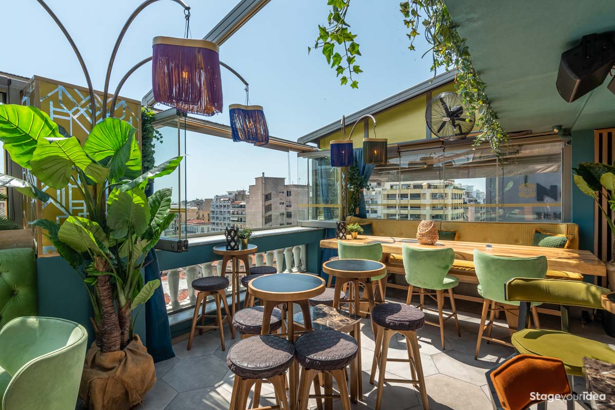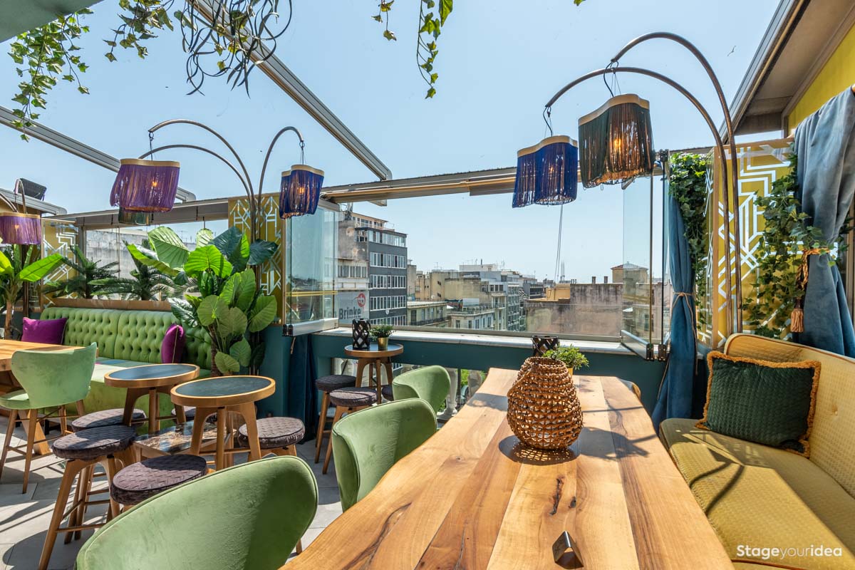 Με αναφορές στην αισθητική της pop κουλτούρας, με ρετρό ζωηρούς χρωματισμούς, με το βελούδο να κυριαρχεί στην επίπλωση, και την πολυμορφία σε γραμμές και φόρμες, η «Μεταμοντέρνα Ταράτσα με Βελούδινα Καθίσματα» πρεσβεύει επάξια τον μεταμοντέρνο εκλεκτικισμό. Κάθε τμήμα του χώρου αφηγείται και μια διαφορετική αισθητική ιστορία, η οποία εναρμονίζεται με συνάφεια με τα υπόλοιπα τμήματα δημιουργώντας μια ενιαία και συνεκτική αφήγηση. Ξεχωρίζει το θολωτό μπαρ το οποίο παραπέμπει σε μια φουτουριστική εκδοχή της αρχετυπικής δόμησης που εφήρμοζαν διάφορες φυλές ιθαγενών ανά τον κόσμο. Τα φυτά κατακλύζουν τον χώρο αναζωογονώντας την ατμόσφαιρα και ενισχύοντας το αίσθημα χαλάρωσης. Τέλος, ένα τμήμα της ταράτσας είναι κατ' επιλογή σκεπαζόμενο και όταν μενει ανοικτό προσφέρεται θέα στη πόλη και τον απέραντο ουρανό.