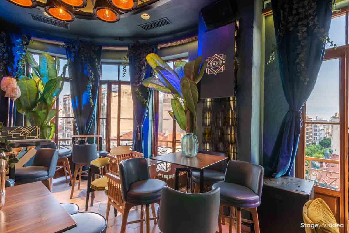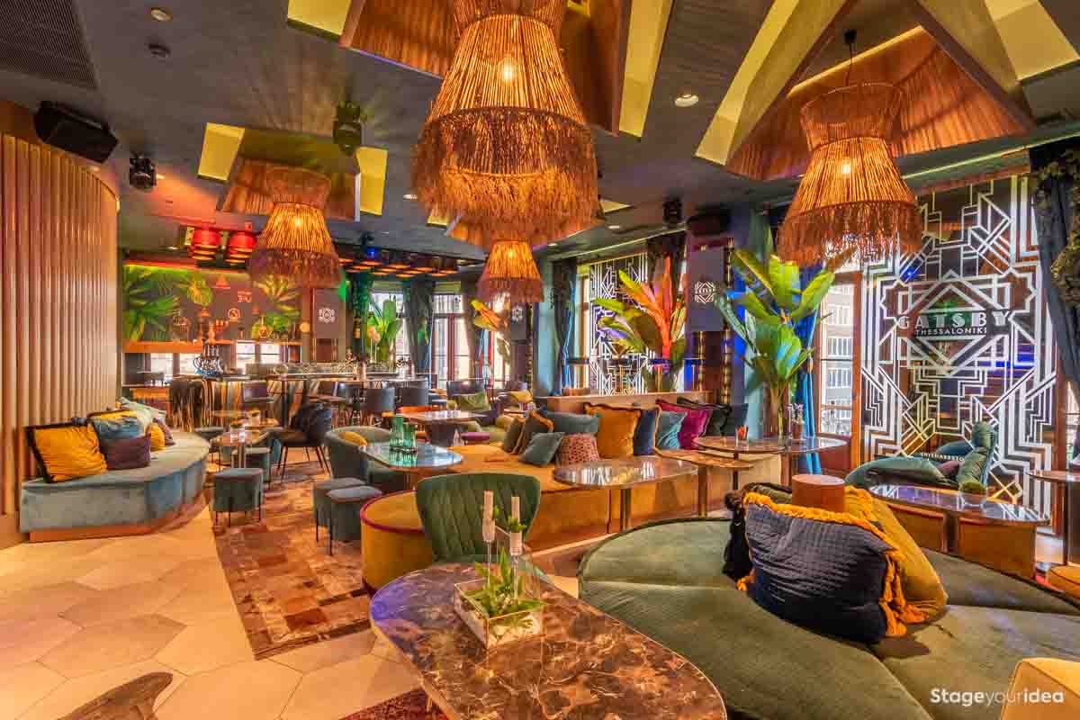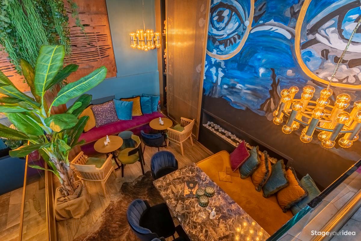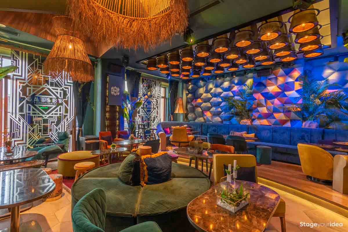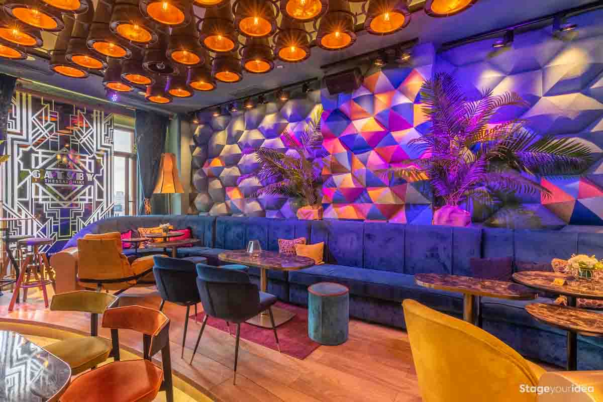 Με αναφορές στην αισθητική της pop κουλτούρας, με ρετρό ζωηρούς χρωματισμούς, με το βελούδο να κυριαρχεί στην επίπλωση, και την πολυμορφία σε γραμμές και φόρμες, η «Μεταμοντέρνα Ταράτσα με Βελούδινα Καθίσματα» πρεσβεύει επάξια τον μεταμοντέρνο εκλεκτικισμό. Κάθε τμήμα του χώρου αφηγείται και μια διαφορετική αισθητική ιστορία, η οποία εναρμονίζεται με συνάφεια με τα υπόλοιπα τμήματα δημιουργώντας μια ενιαία και συνεκτική αφήγηση. Ξεχωρίζει το θολωτό μπαρ το οποίο παραπέμπει σε μια φουτουριστική εκδοχή της αρχετυπικής δόμησης που εφήρμοζαν διάφορες φυλές ιθαγενών ανά τον κόσμο. Τα φυτά κατακλύζουν τον χώρο αναζωογονώντας την ατμόσφαιρα και ενισχύοντας το αίσθημα χαλάρωσης. Τέλος, ένα τμήμα της ταράτσας είναι κατ' επιλογή σκεπαζόμενο και όταν μενει ανοικτό προσφέρεται θέα στη πόλη και τον απέραντο ουρανό.