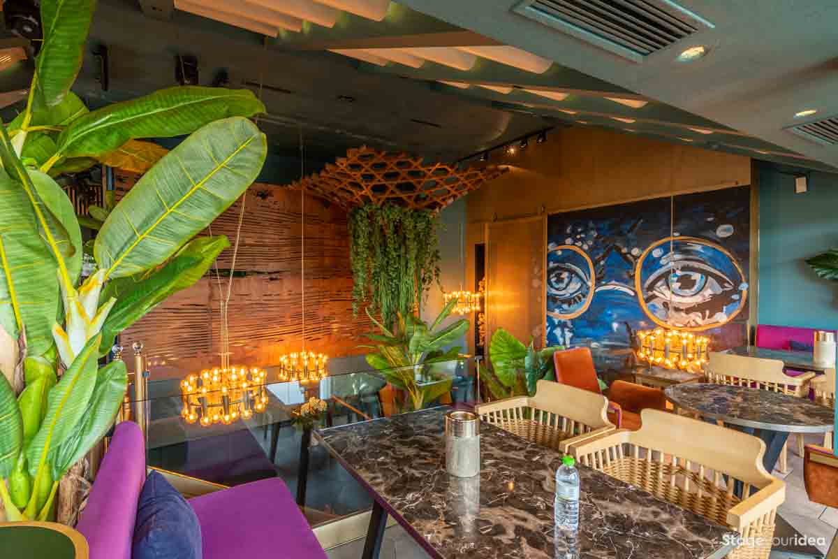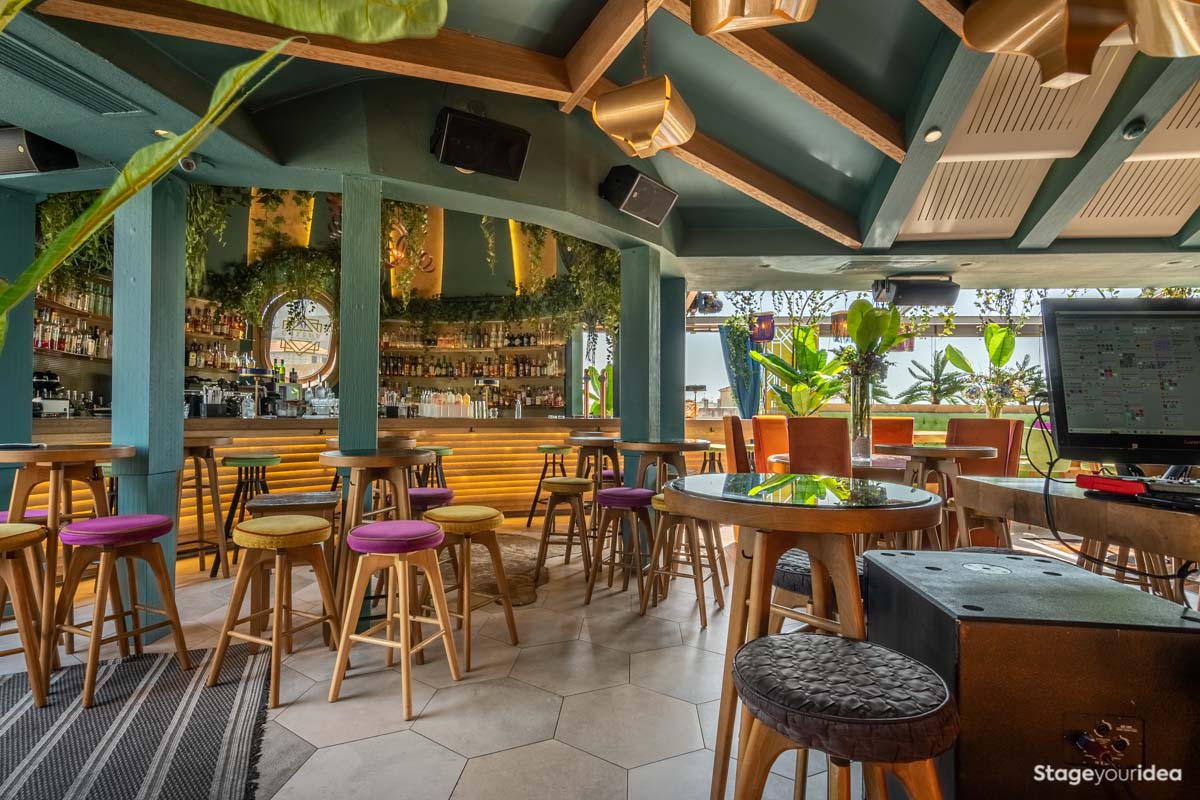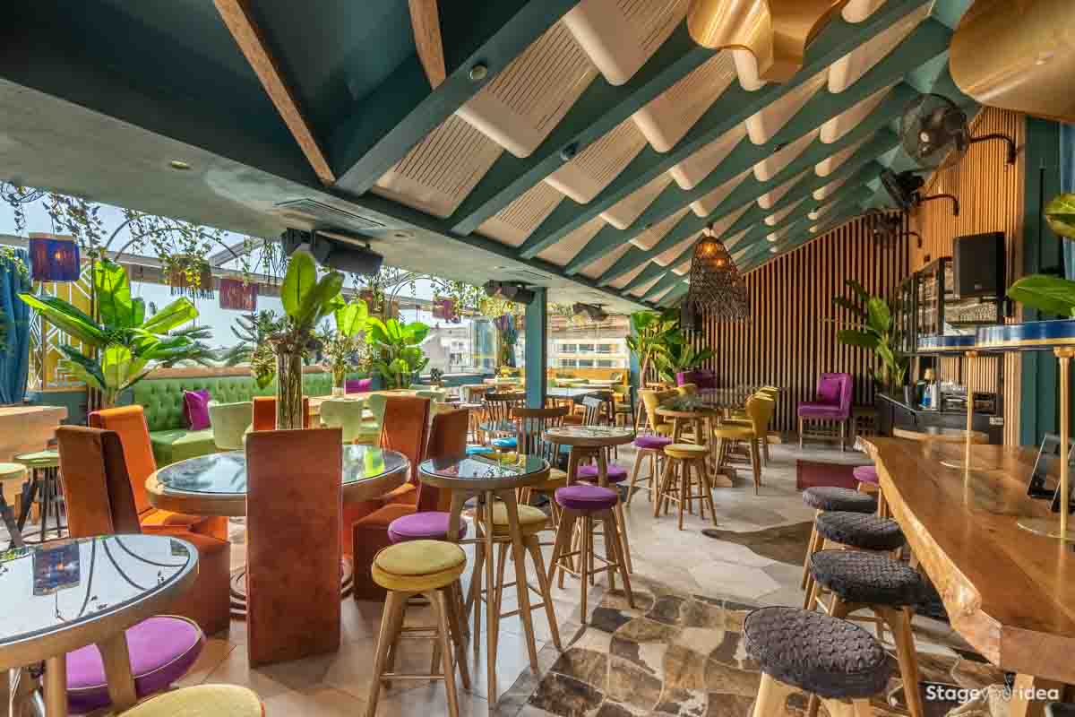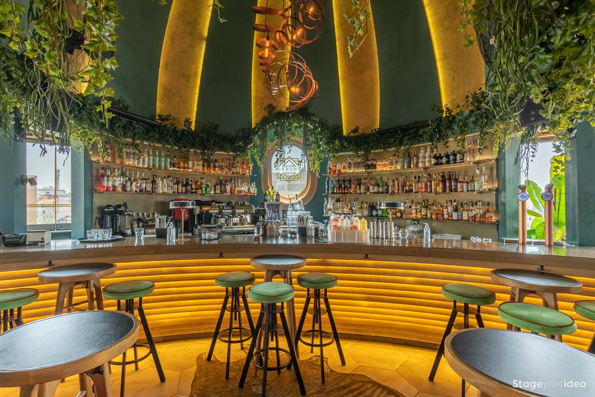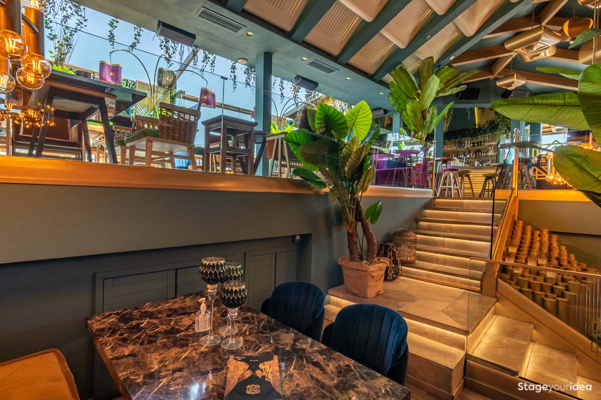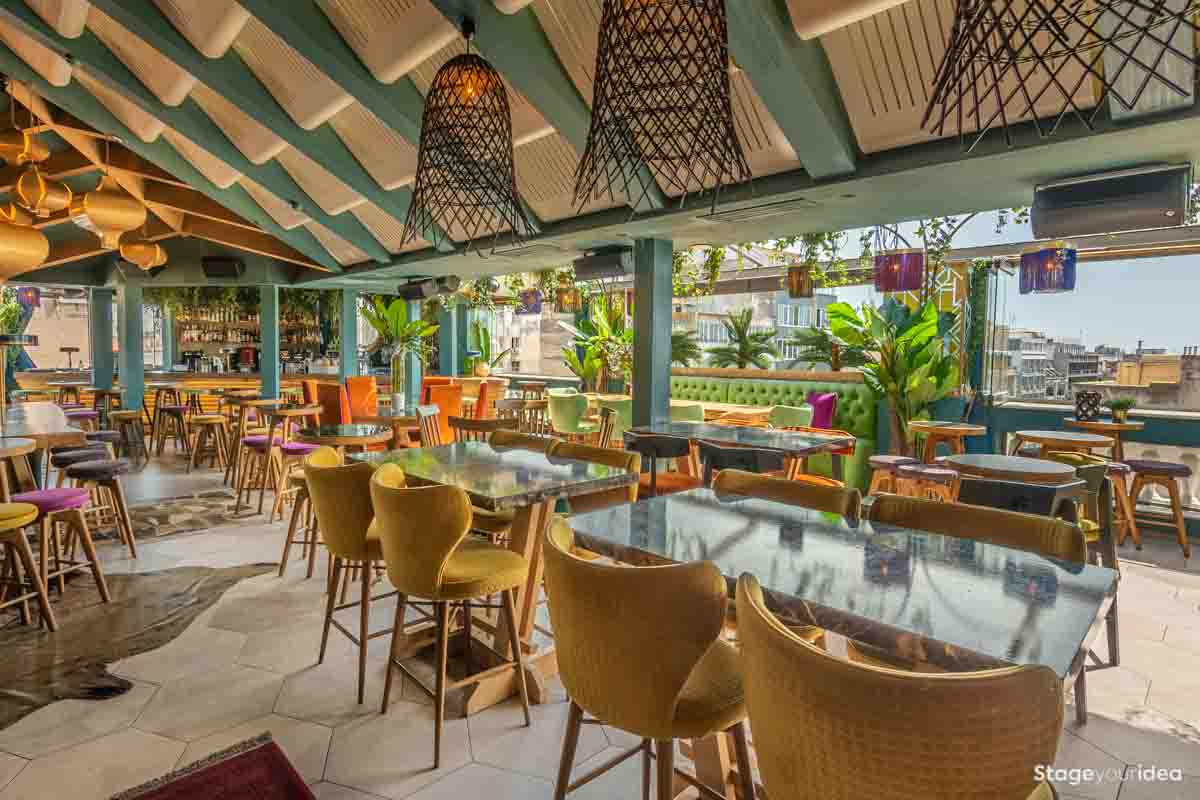 Με αναφορές στην αισθητική της pop κουλτούρας, με ρετρό ζωηρούς χρωματισμούς, με το βελούδο να κυριαρχεί στην επίπλωση, και την πολυμορφία σε γραμμές και φόρμες, η «Μεταμοντέρνα Ταράτσα με Βελούδινα Καθίσματα» πρεσβεύει επάξια τον μεταμοντέρνο εκλεκτικισμό. Κάθε τμήμα του χώρου αφηγείται και μια διαφορετική αισθητική ιστορία, η οποία εναρμονίζεται με συνάφεια με τα υπόλοιπα τμήματα δημιουργώντας μια ενιαία και συνεκτική αφήγηση. Ξεχωρίζει το θολωτό μπαρ το οποίο παραπέμπει σε μια φουτουριστική εκδοχή της αρχετυπικής δόμησης που εφήρμοζαν διάφορες φυλές ιθαγενών ανά τον κόσμο. Τα φυτά κατακλύζουν τον χώρο αναζωογονώντας την ατμόσφαιρα και ενισχύοντας το αίσθημα χαλάρωσης. Τέλος, ένα τμήμα της ταράτσας είναι κατ' επιλογή σκεπαζόμενο και όταν μενει ανοικτό προσφέρεται θέα στη πόλη και τον απέραντο ουρανό.