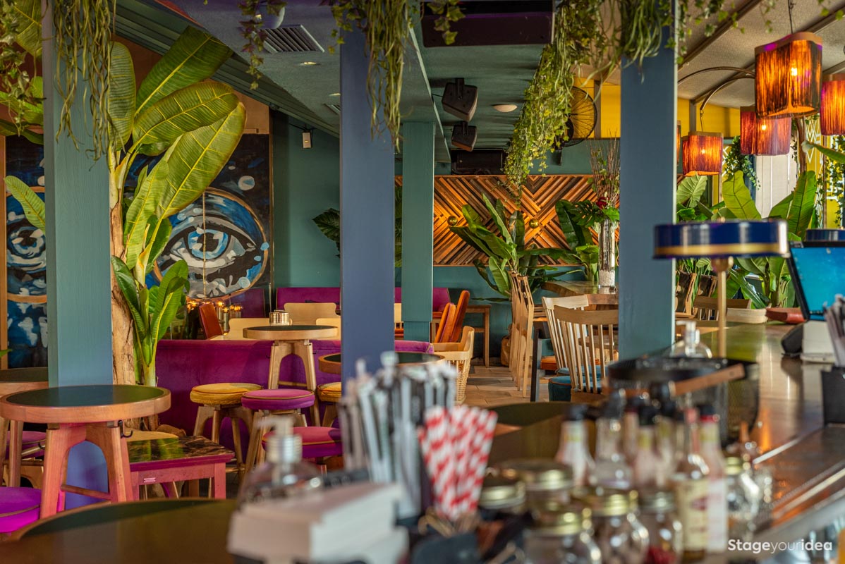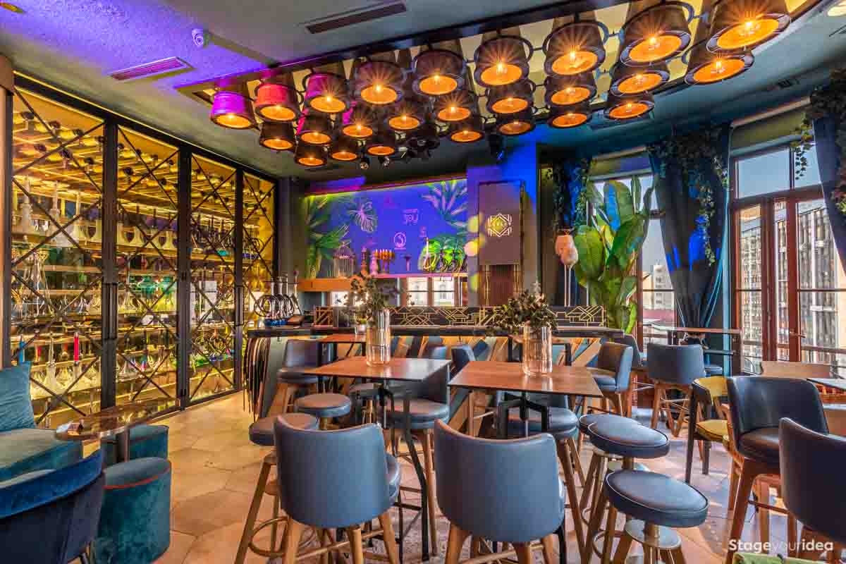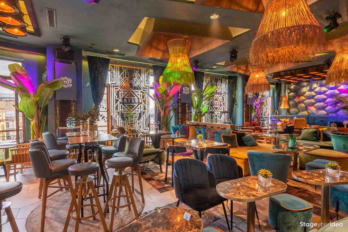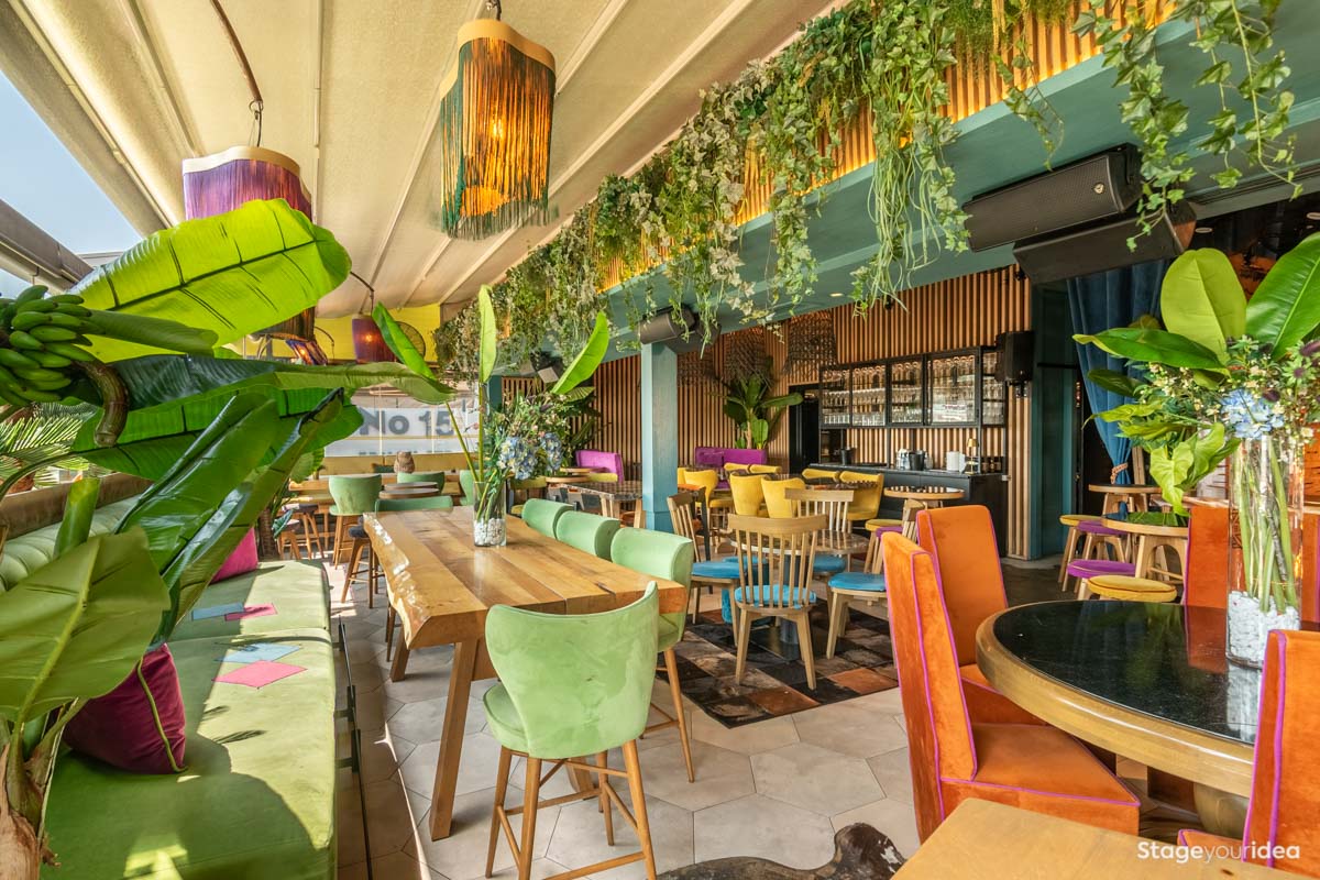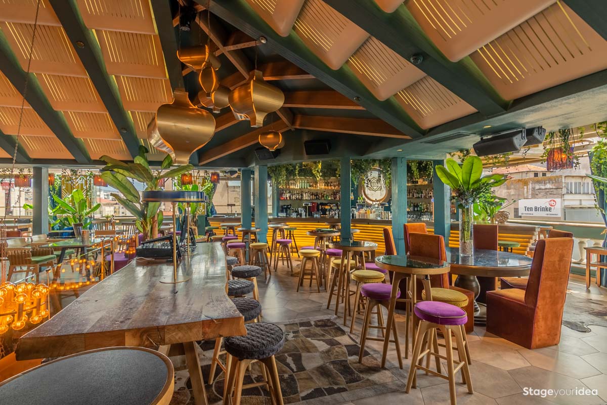 Με αναφορές στην αισθητική της pop κουλτούρας, με ρετρό ζωηρούς χρωματισμούς, με το βελούδο να κυριαρχεί στην επίπλωση, και την πολυμορφία σε γραμμές και φόρμες, η «Μεταμοντέρνα Ταράτσα με Βελούδινα Καθίσματα» πρεσβεύει επάξια τον μεταμοντέρνο εκλεκτικισμό. Κάθε τμήμα του χώρου αφηγείται και μια διαφορετική αισθητική ιστορία, η οποία εναρμονίζεται με συνάφεια με τα υπόλοιπα τμήματα δημιουργώντας μια ενιαία και συνεκτική αφήγηση. Ξεχωρίζει το θολωτό μπαρ το οποίο παραπέμπει σε μια φουτουριστική εκδοχή της αρχετυπικής δόμησης που εφήρμοζαν διάφορες φυλές ιθαγενών ανά τον κόσμο. Τα φυτά κατακλύζουν τον χώρο αναζωογονώντας την ατμόσφαιρα και ενισχύοντας το αίσθημα χαλάρωσης. Τέλος, ένα τμήμα της ταράτσας είναι κατ' επιλογή σκεπαζόμενο και όταν μενει ανοικτό προσφέρεται θέα στη πόλη και τον απέραντο ουρανό.