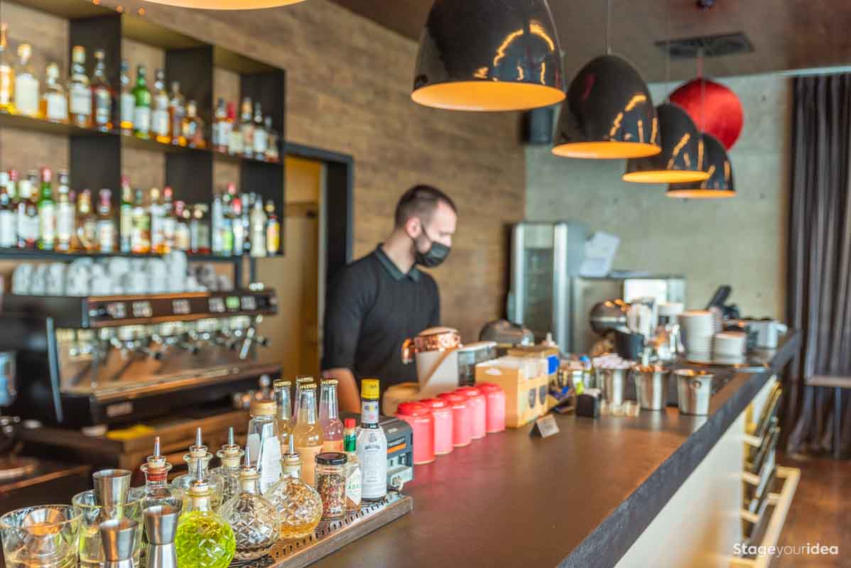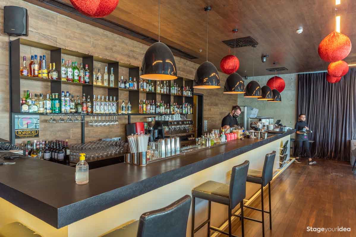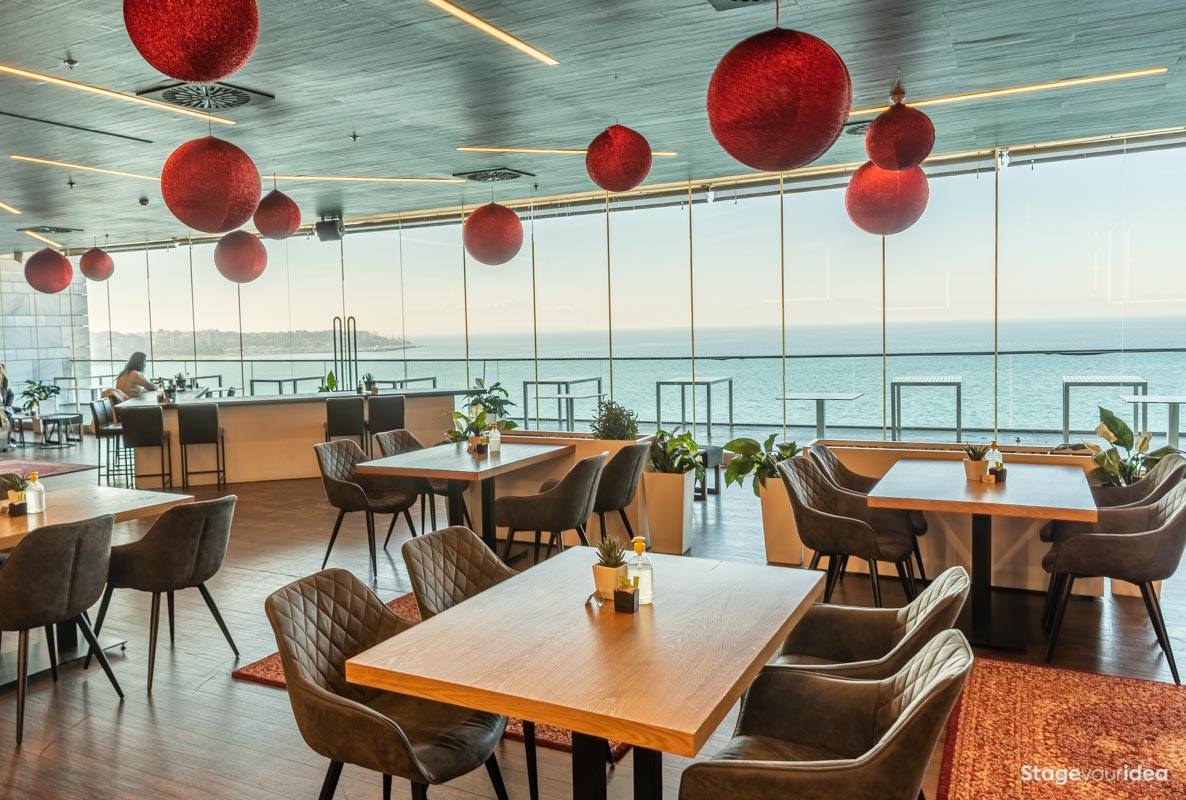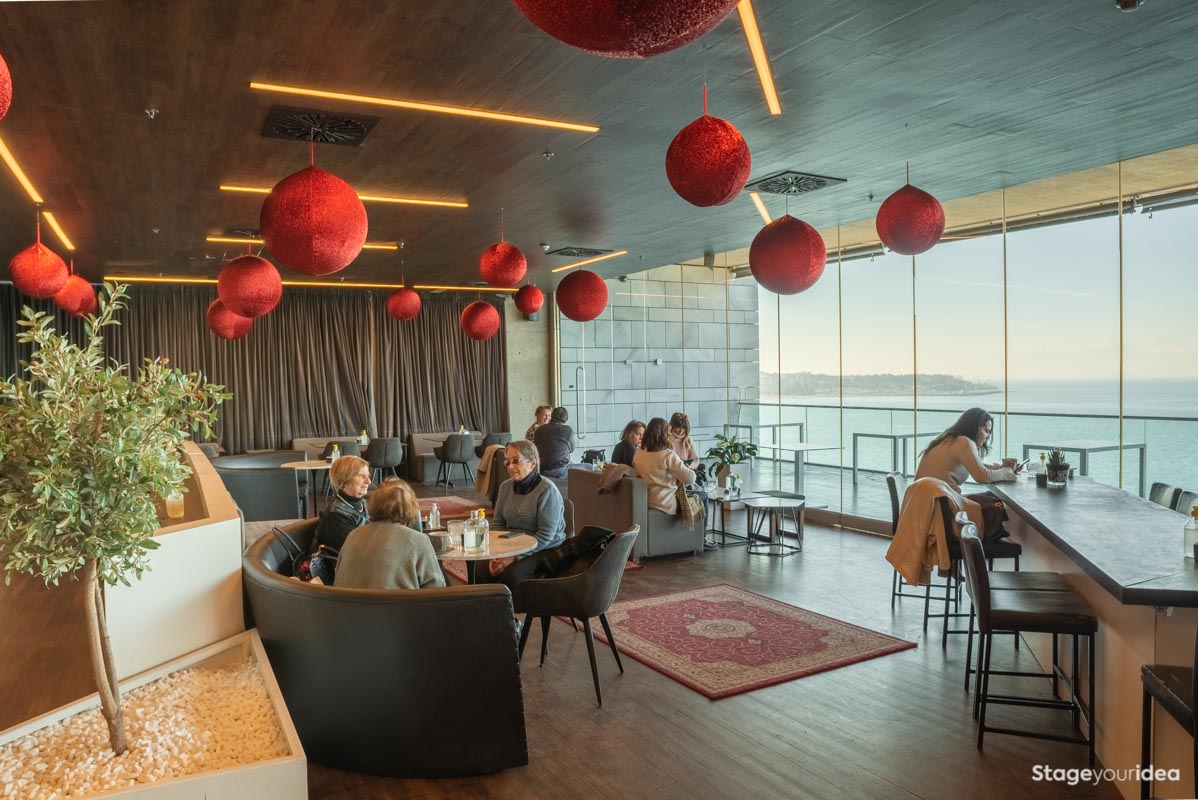 Το «Μινιμαλιστικό Πολυτελές Bar με Θέα στην Θάλασσα» χαρακτηρίζεται αισθητικά από μια μοντέρνα μινιμαλιστική πολυτέλεια με έπιπλα και διακοσμητικά σε αποχρώσεις του γκρι, το οποίο κυριαρχεί ως χρωματισμός. Ο συνδυασμός του γκρι με το λευκό προσδίδει μια αίσθηση χαλάρωσης και λιτότητας. Η αφαιρετικότητα που δεσπόζει στην διακόσμηση λειτουργεί ως παράγοντας αποσυμπίεσης από την φορτική και πολλές φορές αισθητικά δυσβάσταχτη καθημερινότητα. Επίσης, μπορεί κανείς να διακρίνει και art deco επιρροές όπως statement φωτιστικά οροφής, κουρτίνες συσκότισης με μεταλλική λάμψη, εξωτικά ξύλα με γυαλιστερό φινίρισμα, καθώς και χαλιά με γεωμετρικά σχέδια. Η Αίθουσα συνδυάζει αρμονικά την πολυτέλεια και την κομψότητα της art deco αισθητικής σε συνδυασμό με την απέριττη λειτουργικότητα του μοντέρνου μινιμαλισμού.