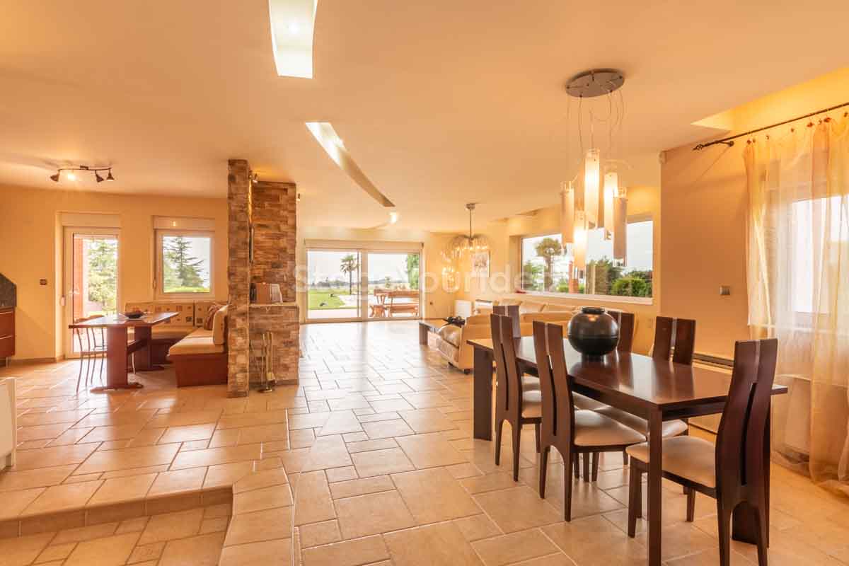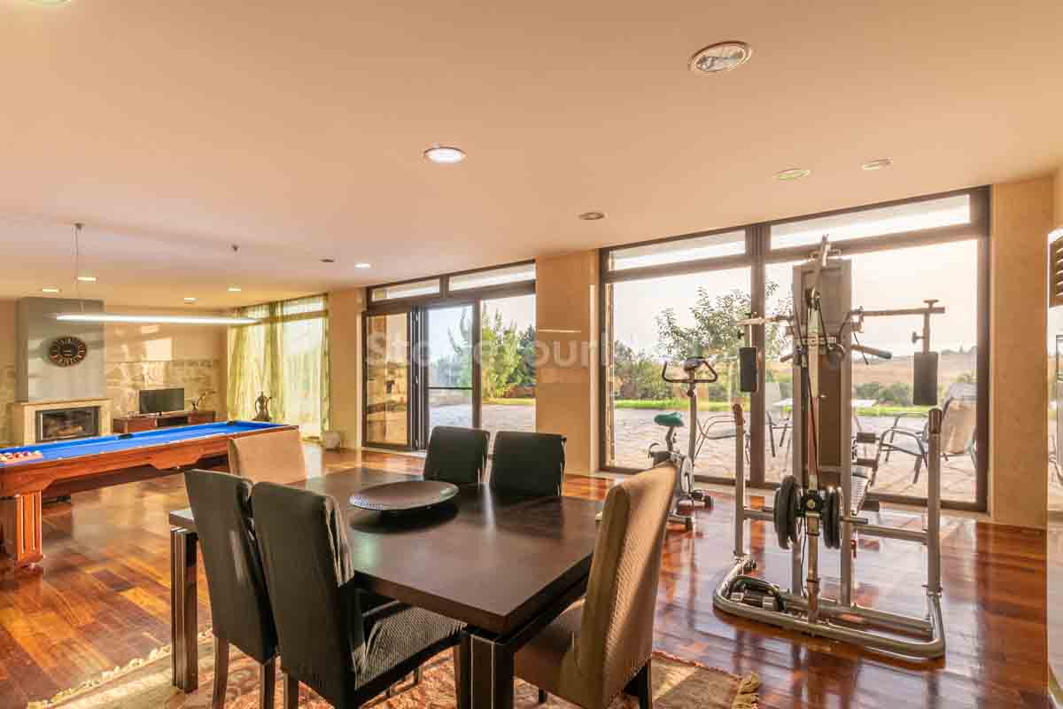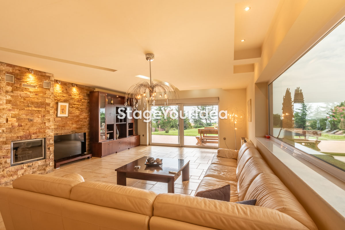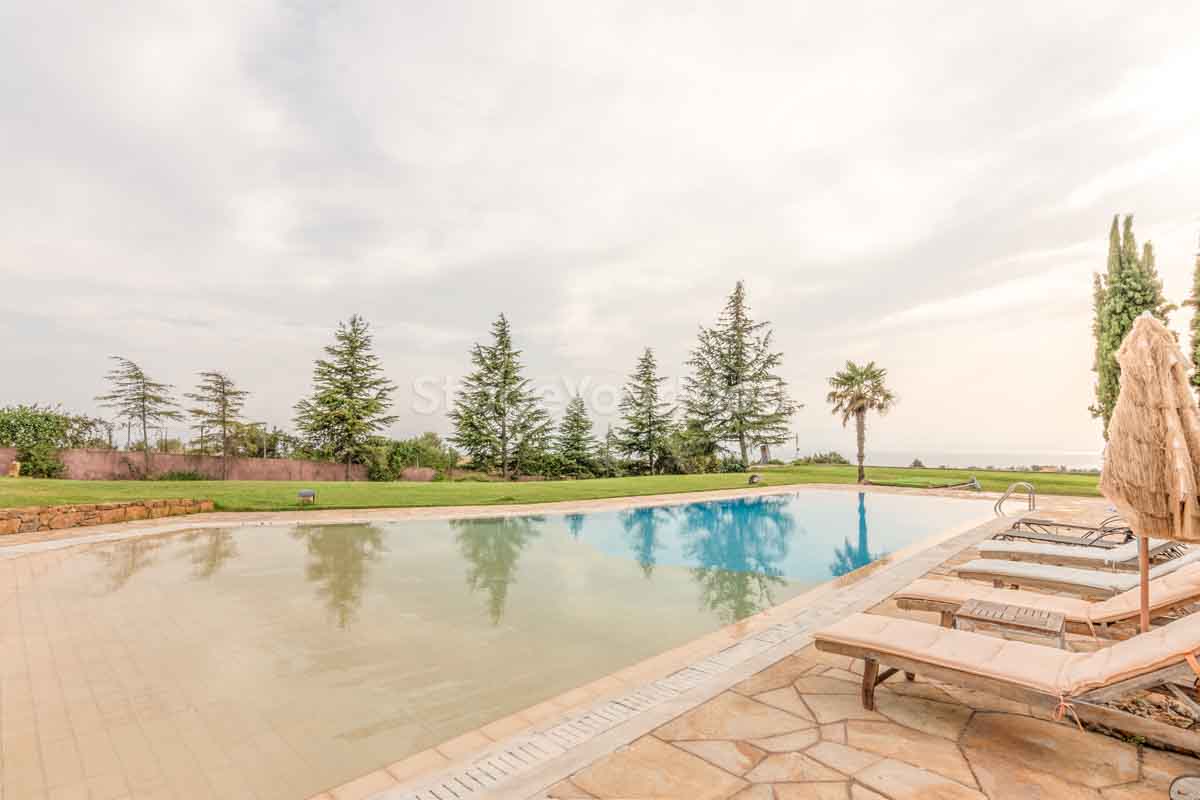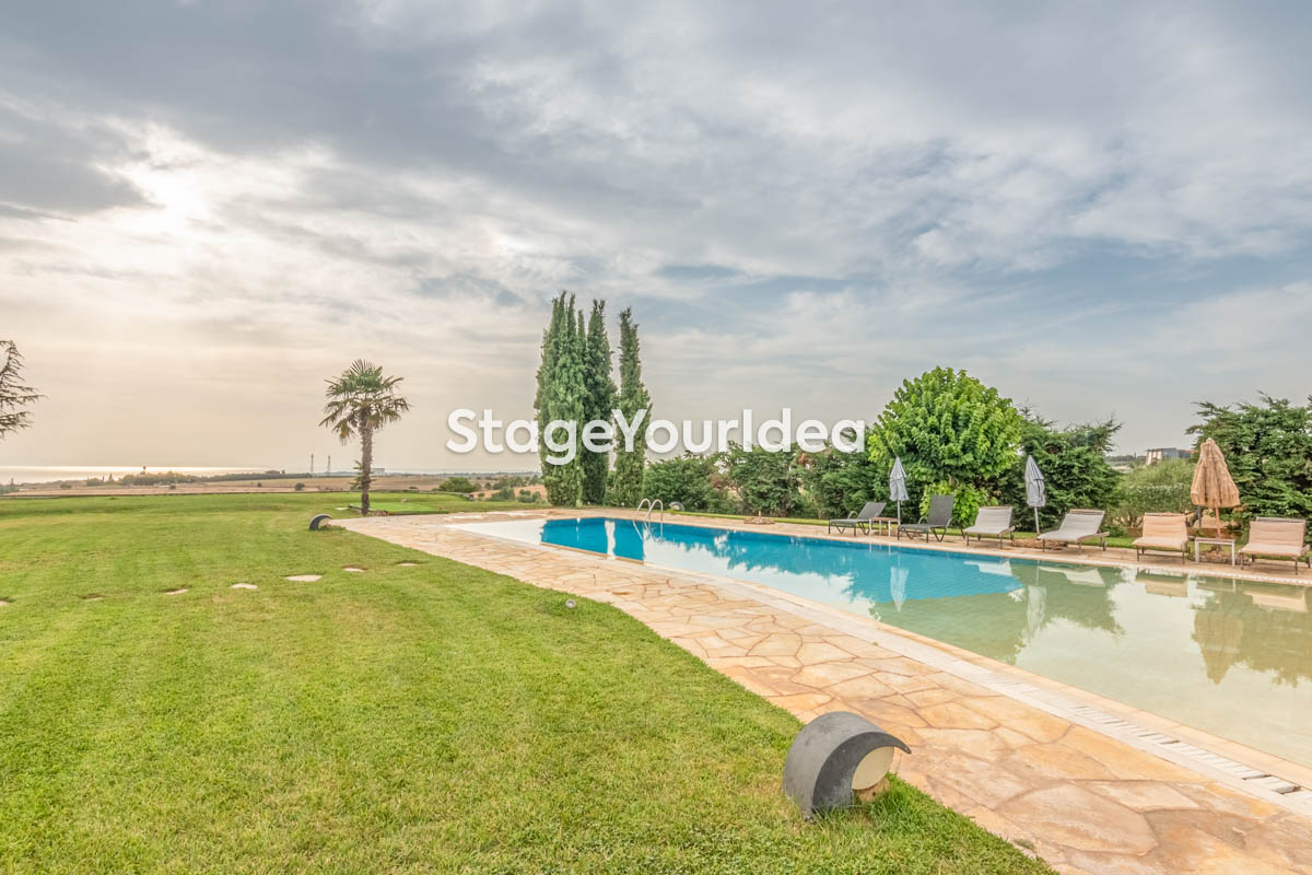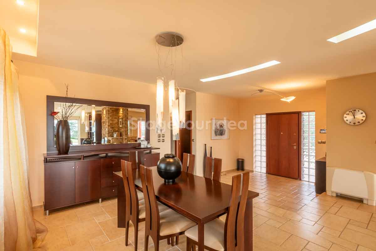 Η ειδυλλιακή θέα του ουρανού, η εντυπωσιακή πισίνα (100 τ.μ., 3 μέτρα βάθος), οι ζεστές γήινες αποχρώσεις της τερακότα σε συνδυασμό με τον περιποιημένο καταπράσινο κήπο καλύπτουν και τα 4 στοιχεία της φύσης προκειμένου να επιτείνουν στο μέγιστο την εμπειρία των καλεσμένων σας. Η παρουσία της πέτρας, του ξύλου και του δέρματος στην επίπλωση αποπνέουν παράδοση και συνάμα πολυτέλεια. Η παρουσία μοντέρνων φωτιστικών με τη συνοδεία περίτεχνων ασυμμετριών και καμπύλων γραμμών προσδίδουν εκσυγχρονιστικό χαρακτήρα. Οι διάπλατες τζαμαρίες διευρύνουν περαιτέρω το οπτικό πεδίο από το εσωτερικό της αίθουσας ενισχύοντας την διαπερατότητα με το εξωτερικό τοπίο.