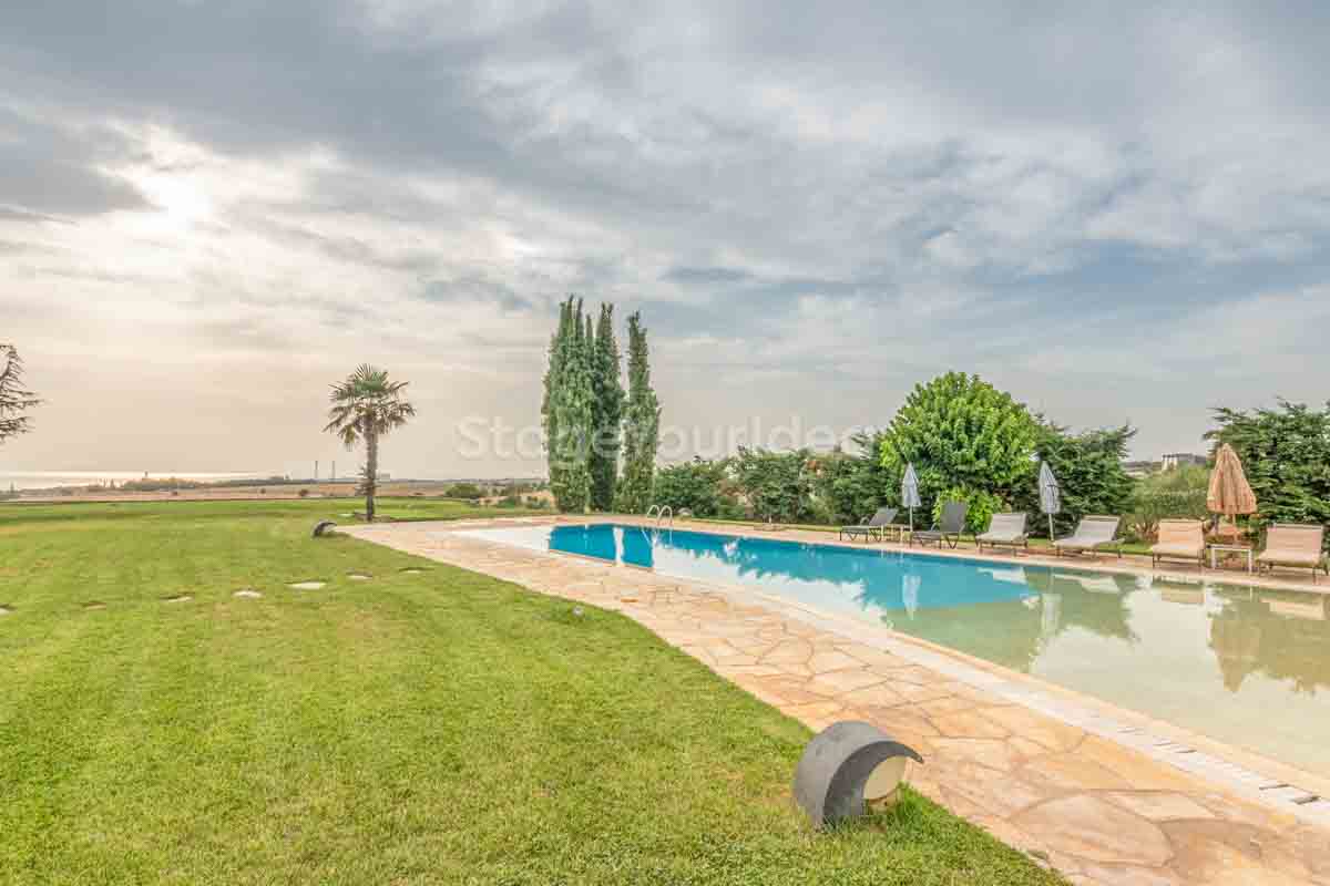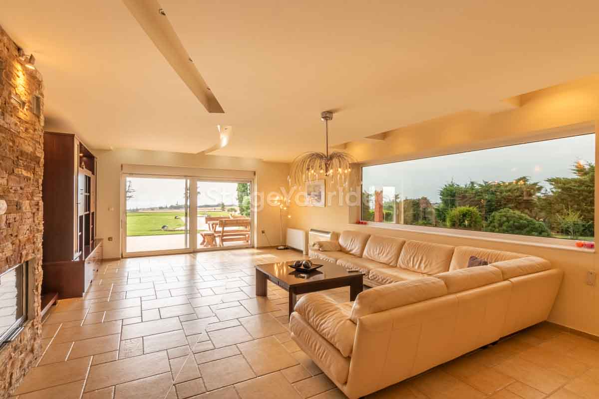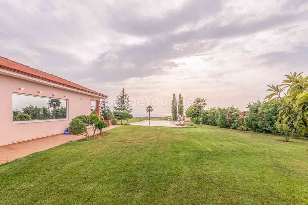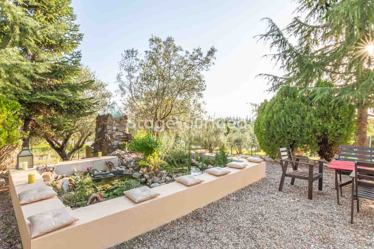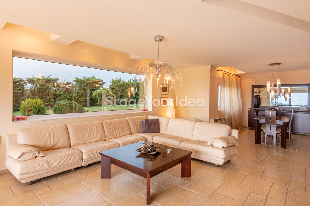 Η ειδυλλιακή θέα του ουρανού, η εντυπωσιακή πισίνα (100 τ.μ., 3 μέτρα βάθος), οι ζεστές γήινες αποχρώσεις της τερακότα σε συνδυασμό με τον περιποιημένο καταπράσινο κήπο καλύπτουν και τα 4 στοιχεία της φύσης προκειμένου να επιτείνουν στο μέγιστο την εμπειρία των καλεσμένων σας. Η παρουσία της πέτρας, του ξύλου και του δέρματος στην επίπλωση αποπνέουν παράδοση και συνάμα πολυτέλεια. Η παρουσία μοντέρνων φωτιστικών με τη συνοδεία περίτεχνων ασυμμετριών και καμπύλων γραμμών προσδίδουν εκσυγχρονιστικό χαρακτήρα. Οι διάπλατες τζαμαρίες διευρύνουν περαιτέρω το οπτικό πεδίο από το εσωτερικό της αίθουσας ενισχύοντας την διαπερατότητα με το εξωτερικό τοπίο.