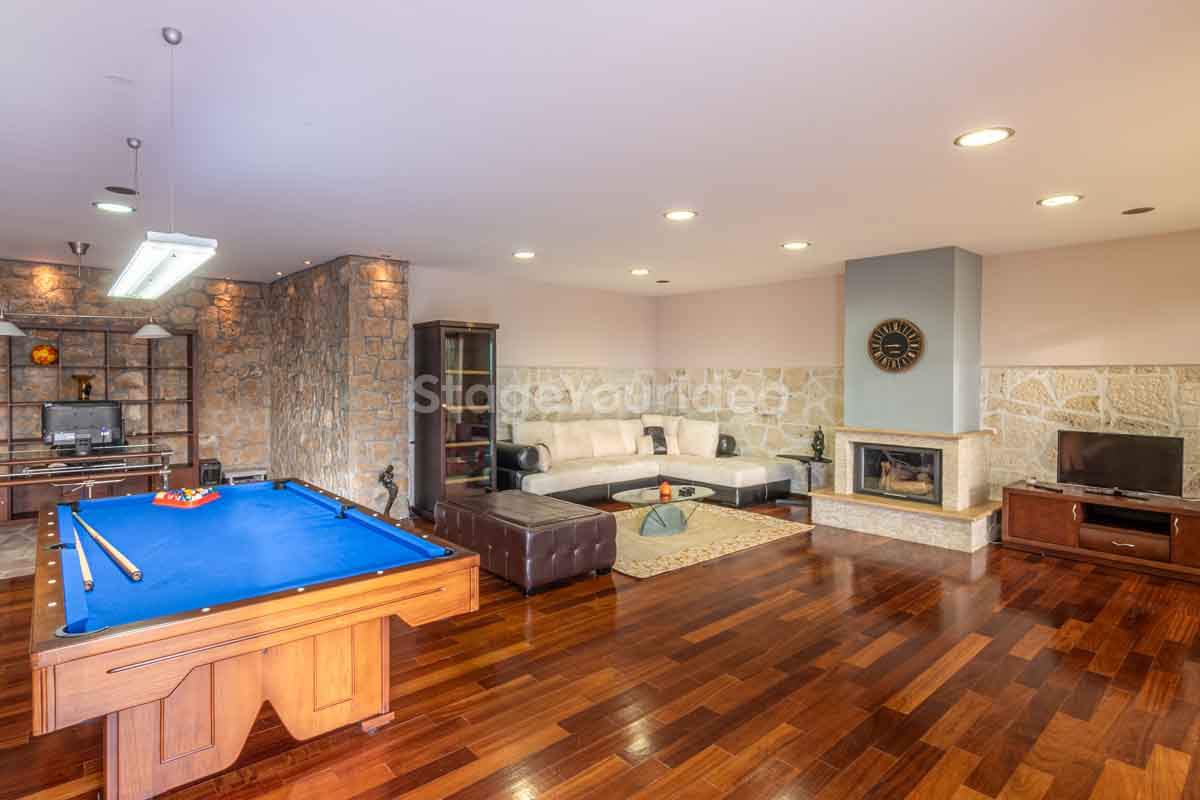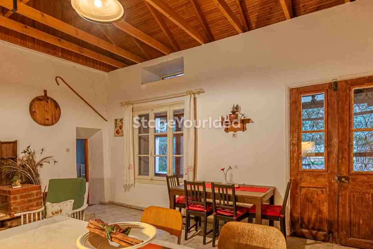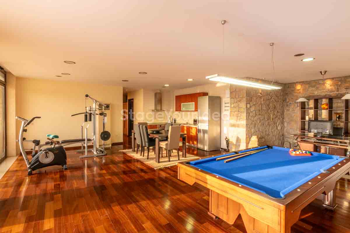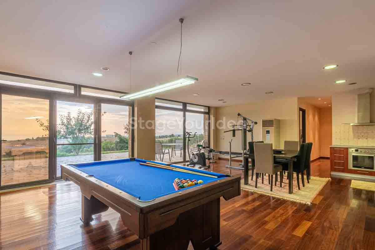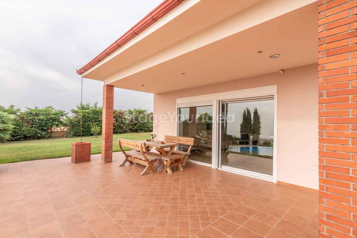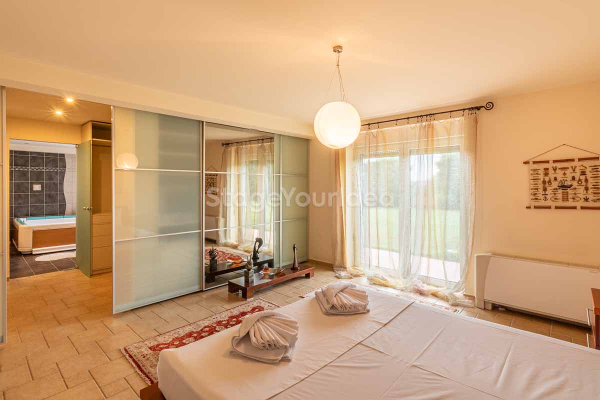 Η ειδυλλιακή θέα του ουρανού, η εντυπωσιακή πισίνα (100 τ.μ., 3 μέτρα βάθος), οι ζεστές γήινες αποχρώσεις της τερακότα σε συνδυασμό με τον περιποιημένο καταπράσινο κήπο καλύπτουν και τα 4 στοιχεία της φύσης προκειμένου να επιτείνουν στο μέγιστο την εμπειρία των καλεσμένων σας. Η παρουσία της πέτρας, του ξύλου και του δέρματος στην επίπλωση αποπνέουν παράδοση και συνάμα πολυτέλεια. Η παρουσία μοντέρνων φωτιστικών με τη συνοδεία περίτεχνων ασυμμετριών και καμπύλων γραμμών προσδίδουν εκσυγχρονιστικό χαρακτήρα. Οι διάπλατες τζαμαρίες διευρύνουν περαιτέρω το οπτικό πεδίο από το εσωτερικό της αίθουσας ενισχύοντας την διαπερατότητα με το εξωτερικό τοπίο.
