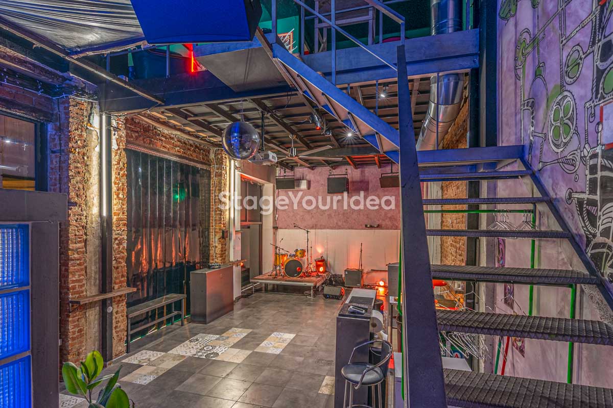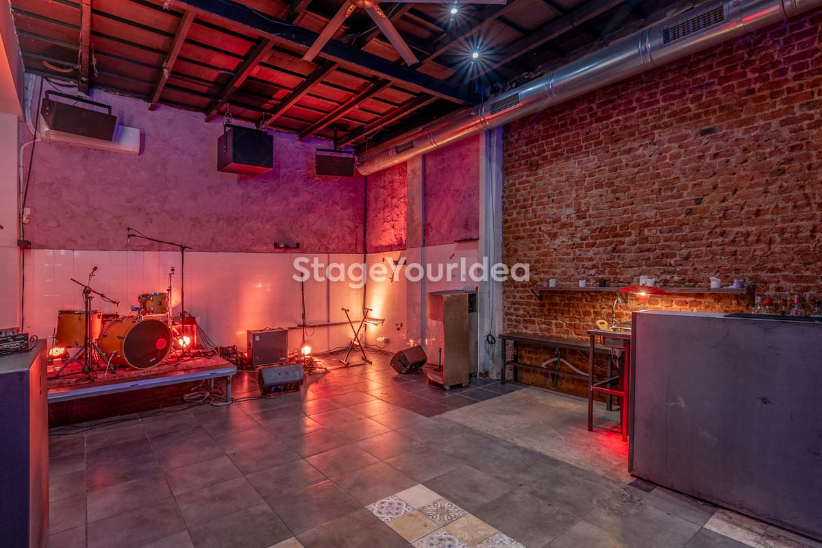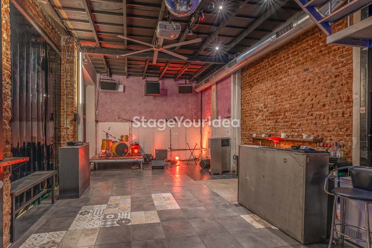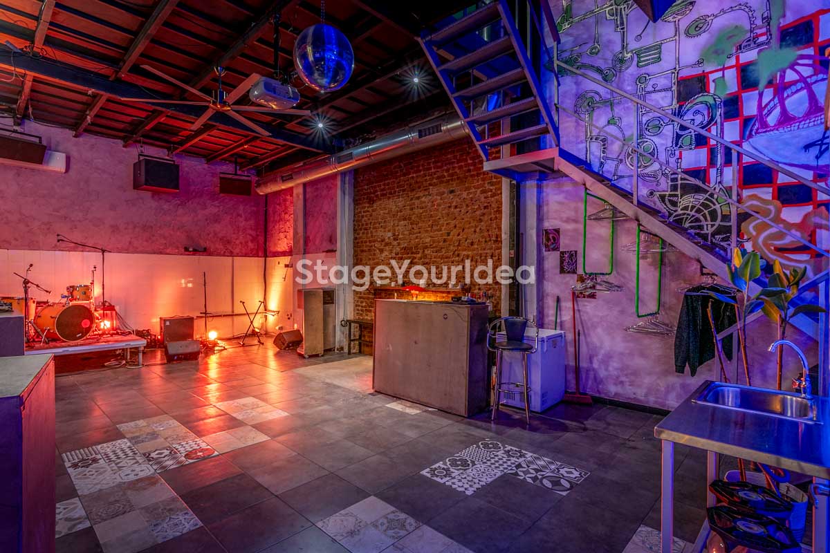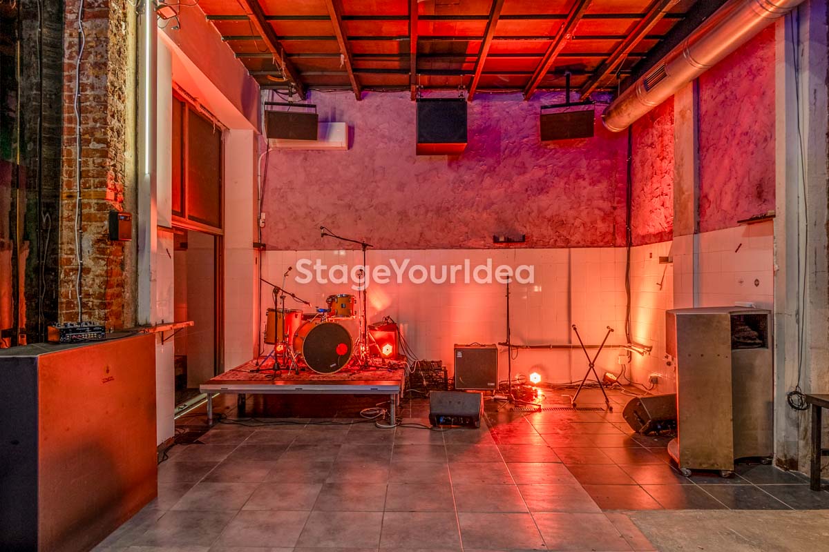 Η αισθητική του χώρου συνδυάζει βιομηχανικά στοιχεία με έντονη urban προσωπικότητα. Τα εκτεθειμένα τούβλα, τα μεταλλικά δοκάρια, ο προθάλαμος από υαλότουβλα και οι neon φωτισμοί δημιουργούν μια σκηνή που θυμίζει εγκατελλειμένο βιομηχανικό κτίριο, ενώ οι τοιχογραφίες και τα έντονα χρώματα ενισχύουν τον καλλιτεχνικό χαρακτήρα. Η κεντρική σκηνή με τα drums και τον έτοιμο ηχητικό εξοπλισμό προσφέρει άμεση λειτουργικότητα για live performances, μουσικά σχήματα, experimental sets ή μικρά showcases. Ο ανοιχτός χώρος (open floor) επιτρέπει την ελεύθερη διαμόρφωση, ιδανική για bazaars, exhibitions ή pop-up παρουσιάσεις.