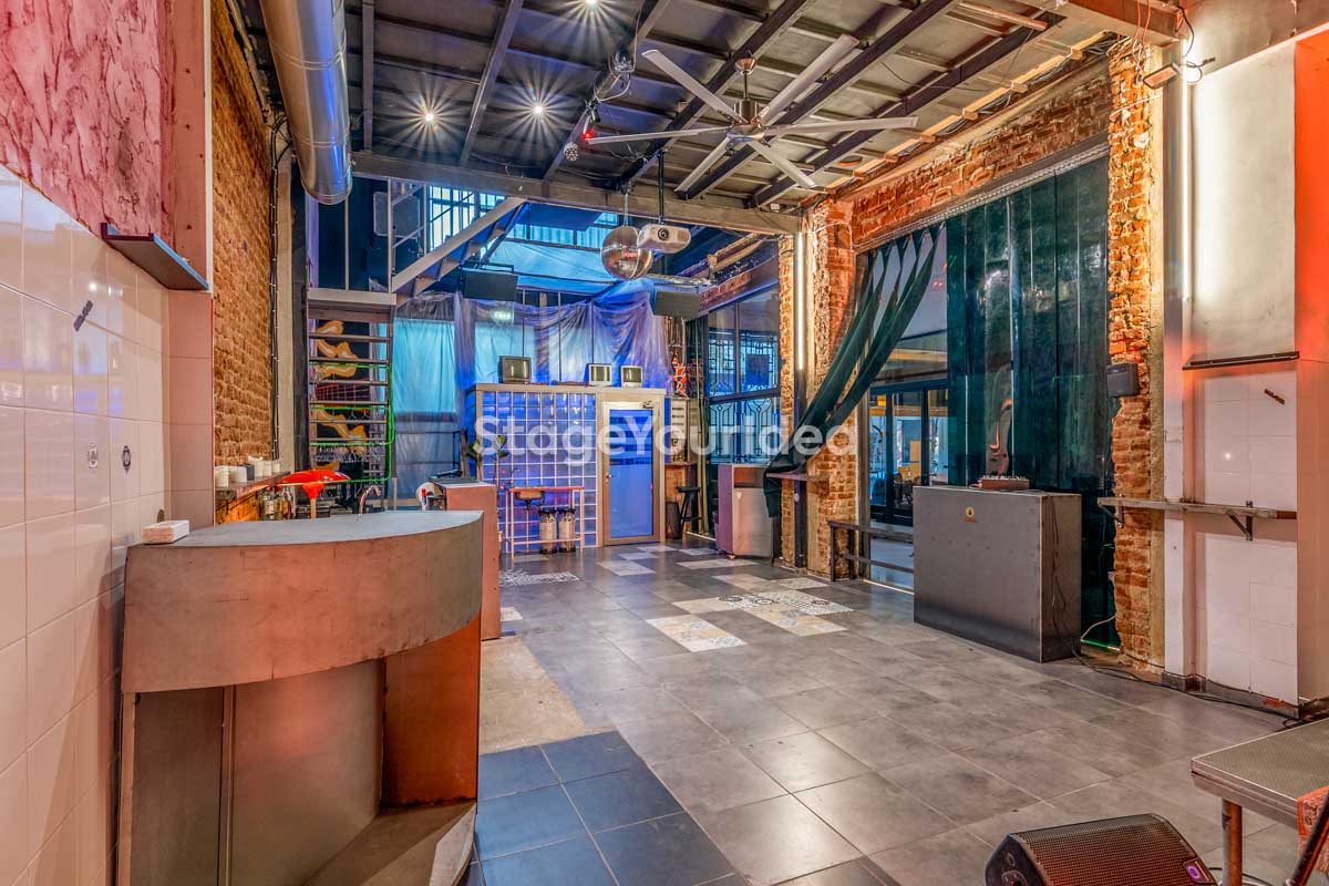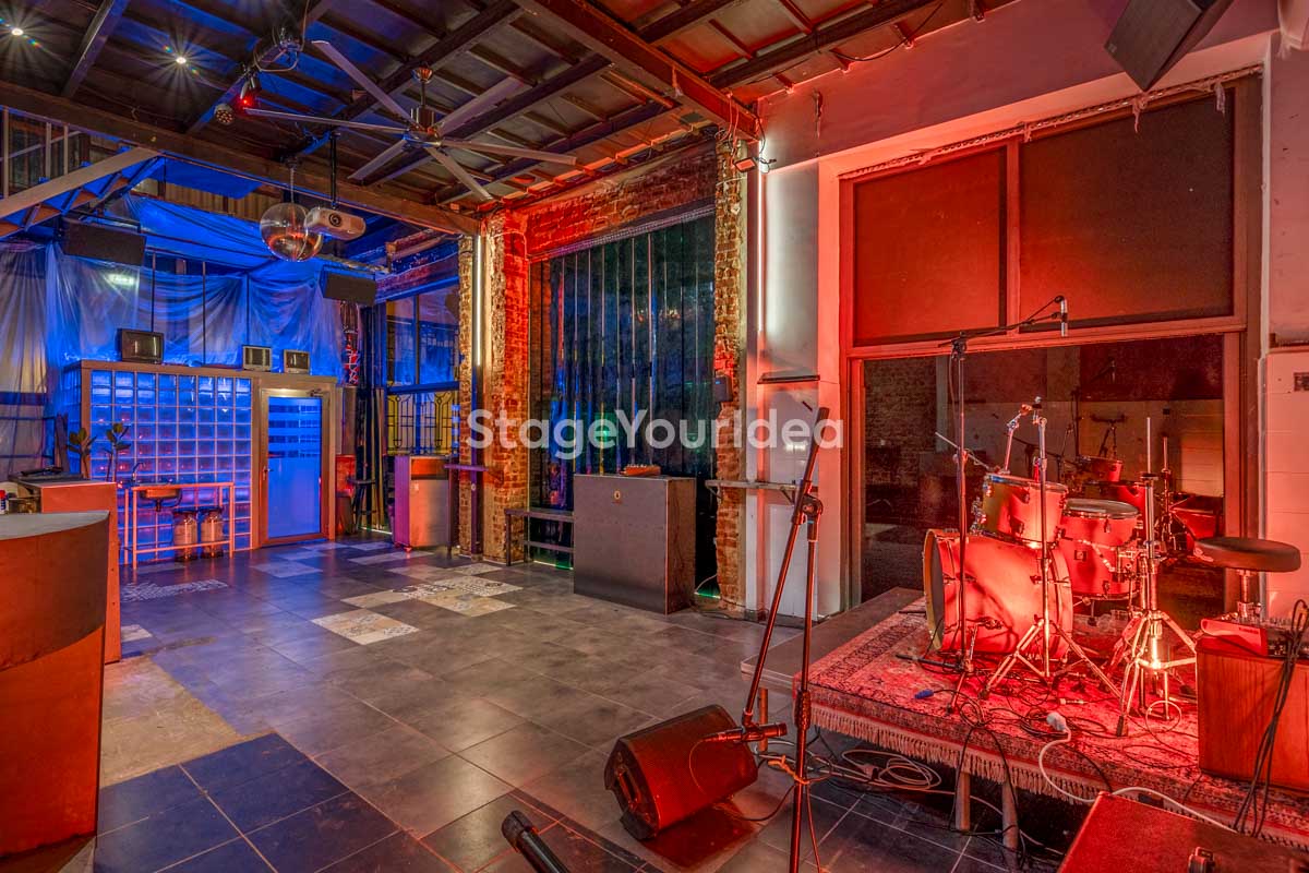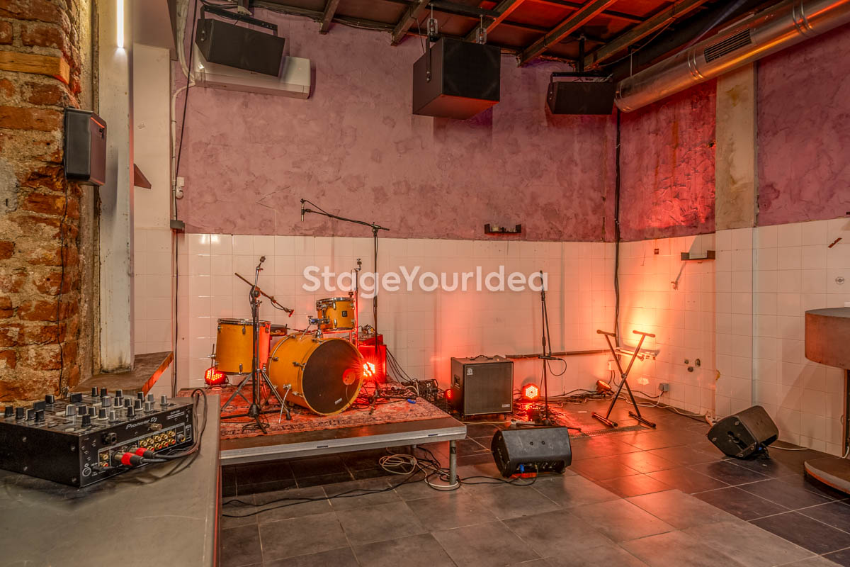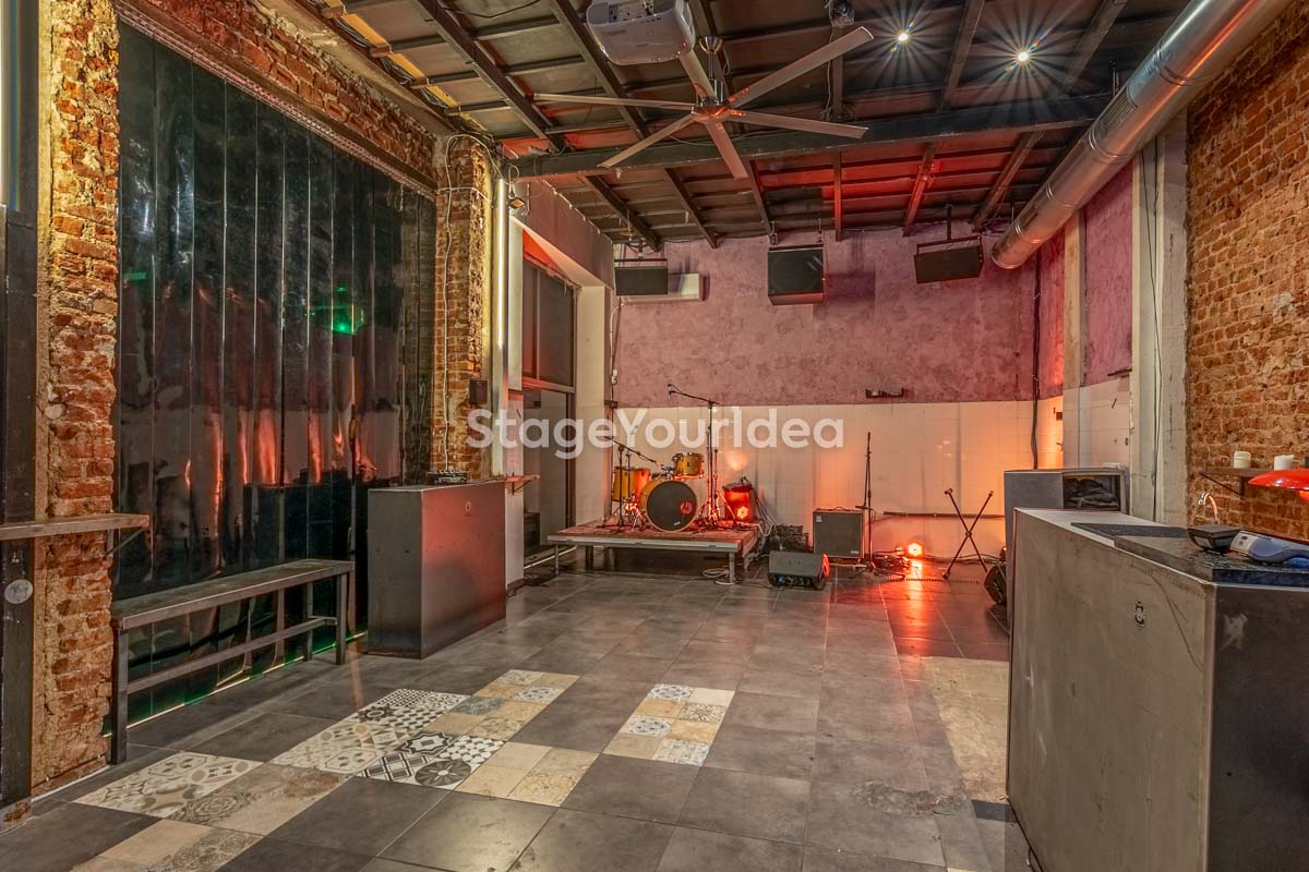 Η αισθητική του χώρου συνδυάζει βιομηχανικά στοιχεία με έντονη urban προσωπικότητα. Τα εκτεθειμένα τούβλα, τα μεταλλικά δοκάρια, ο προθάλαμος από υαλότουβλα και οι neon φωτισμοί δημιουργούν μια σκηνή που θυμίζει εγκατελλειμένο βιομηχανικό κτίριο, ενώ οι τοιχογραφίες και τα έντονα χρώματα ενισχύουν τον καλλιτεχνικό χαρακτήρα. Η κεντρική σκηνή με τα drums και τον έτοιμο ηχητικό εξοπλισμό προσφέρει άμεση λειτουργικότητα για live performances, μουσικά σχήματα, experimental sets ή μικρά showcases. Ο ανοιχτός χώρος (open floor) επιτρέπει την ελεύθερη διαμόρφωση, ιδανική για bazaars, exhibitions ή pop-up παρουσιάσεις.