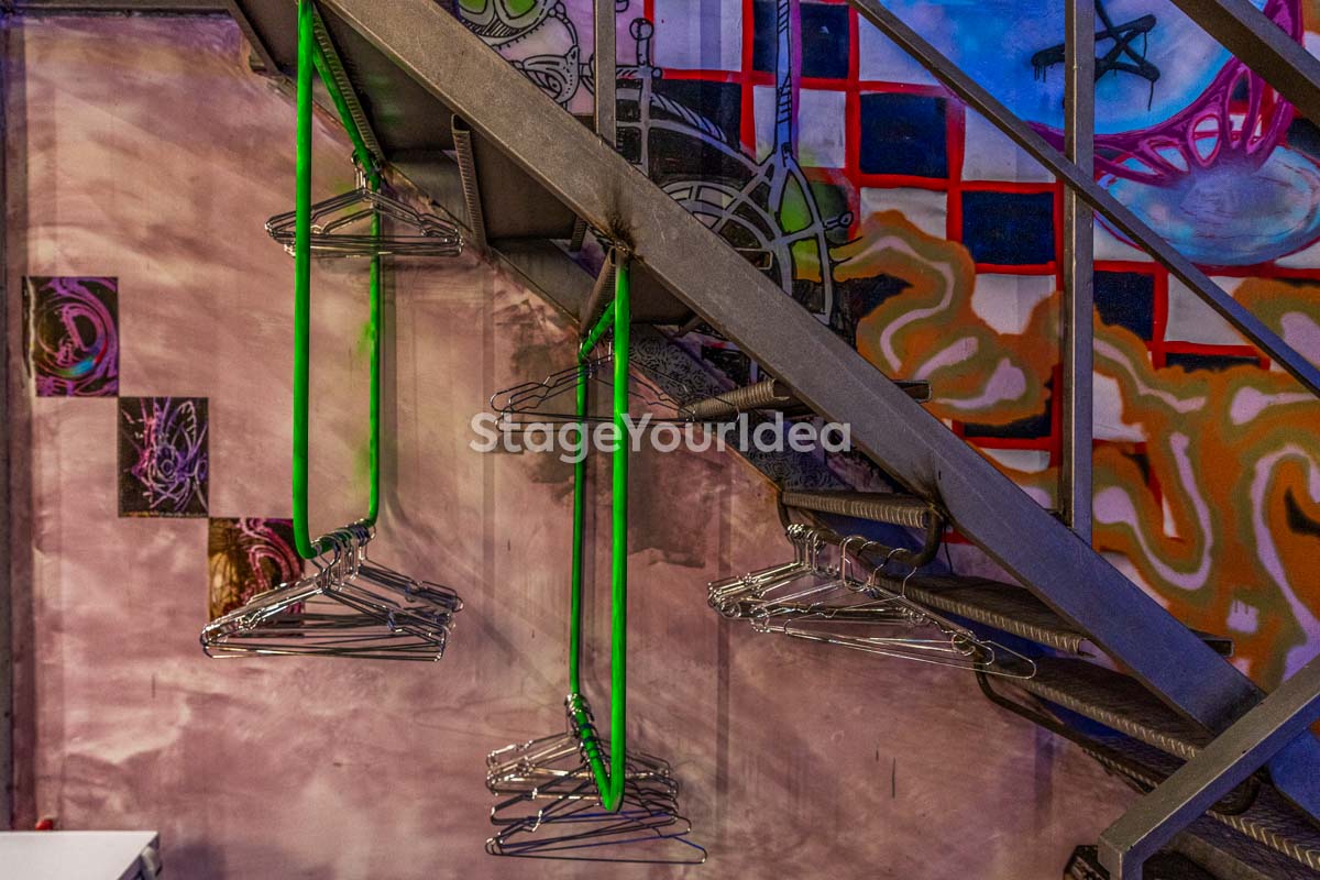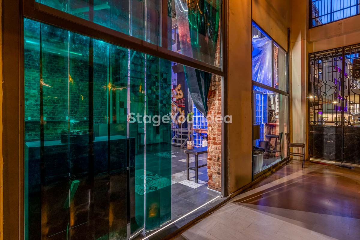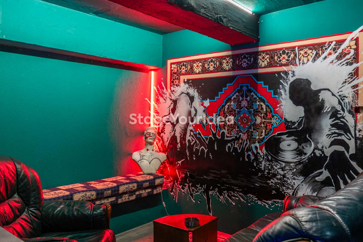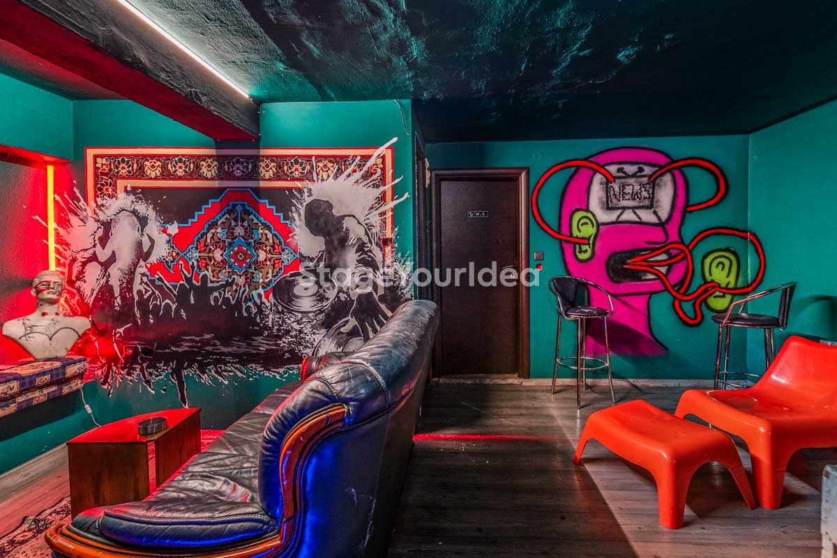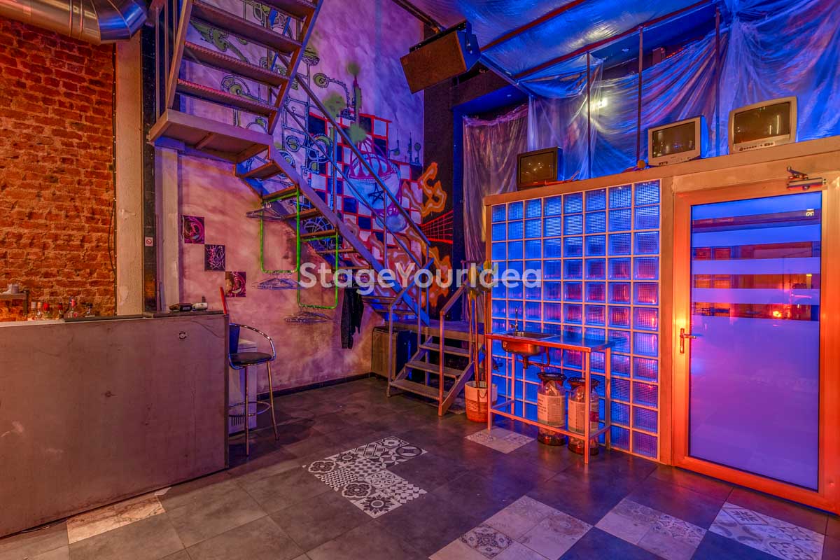 Η αισθητική του χώρου συνδυάζει βιομηχανικά στοιχεία με έντονη urban προσωπικότητα. Τα εκτεθειμένα τούβλα, τα μεταλλικά δοκάρια, ο προθάλαμος από υαλότουβλα και οι neon φωτισμοί δημιουργούν μια σκηνή που θυμίζει εγκατελλειμένο βιομηχανικό κτίριο, ενώ οι τοιχογραφίες και τα έντονα χρώματα ενισχύουν τον καλλιτεχνικό χαρακτήρα. Η κεντρική σκηνή με τα drums και τον έτοιμο ηχητικό εξοπλισμό προσφέρει άμεση λειτουργικότητα για live performances, μουσικά σχήματα, experimental sets ή μικρά showcases. Ο ανοιχτός χώρος (open floor) επιτρέπει την ελεύθερη διαμόρφωση, ιδανική για bazaars, exhibitions ή pop-up παρουσιάσεις.