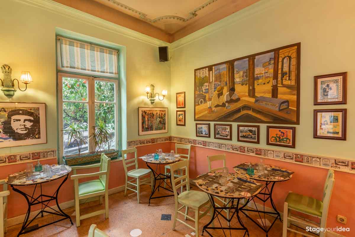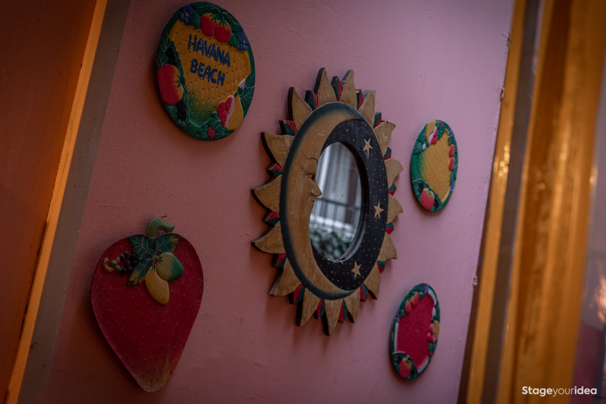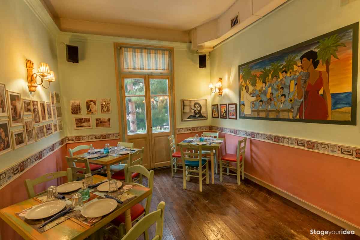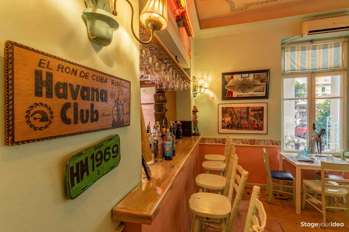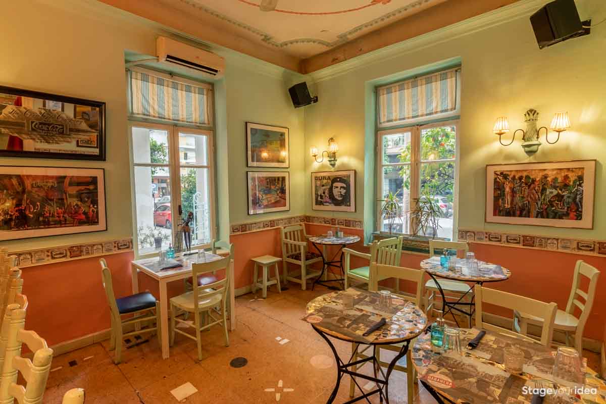 Η Αίθουσα συνδυάζει την νεοκλασική αρχιτεκτονική και το αποικιακό στυλ που χαρακτηρίζει την παραδοσιακή αισθητική και διακόσμηση των χωρών της Λατινικής Αμερικής και της Καραϊβικής. Η χρωματική της παλέτα κινείται κατά κύριο λόγο στους γήινους τόνους της τερακότα, σε διάφορες διαβαθμίσεις και σε συνδυασμό με παστέλ και ήπιες αποχρώσεις (μέντα, μπεζ - λευκό) . Η στέγη είναι πολυεπίπεδη επικλινής ακολουθώντας την πορεία των εσωτερικών σκαλοπατιών και επιπέδων. Η επίπλωση είναι ρετρό και υπάρχει ποικιλία υφών καθώς ο διάκοσμος είναι πλούσιος από κάδρα και ανάγλυφες επιφάνειες.