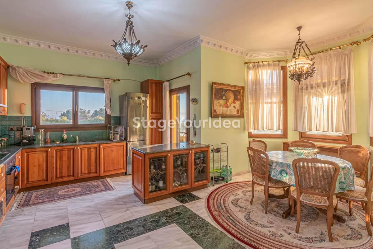 Συνδυάζοντας την αισθητική του μπαρόκ με τη σύγχρονη άνεση, ο σχεδιασμός της βίλας δίνει έμφαση τόσο στην πολυτέλεια όσο και στη λειτουργικότητα. Οι πολλαπλοί χώροι καθιστικού και η ενιαία ροή μεταξύ σαλονιού, τραπεζαρίας και κουζίνας διευκολύνουν την διοργάνωση εκδηλώσεων. Η διακόσμηση με ξύλινα έπιπλα εποχής, φωτιστικά αντίκες και απαλή χρωματική παλέτα δημιουργεί ένα περιβάλλον φινετσάτο και φιλόξενο. Ο κήπος με το μπάρμπεκιου επεκτείνει τις δυνατότητες φιλοξενίας, ιδανικός για υπαίθρια γεύματα, εταιρικά events ή δημιουργικές συναντήσεις σε γαλήνια ατμόσφαιρα.