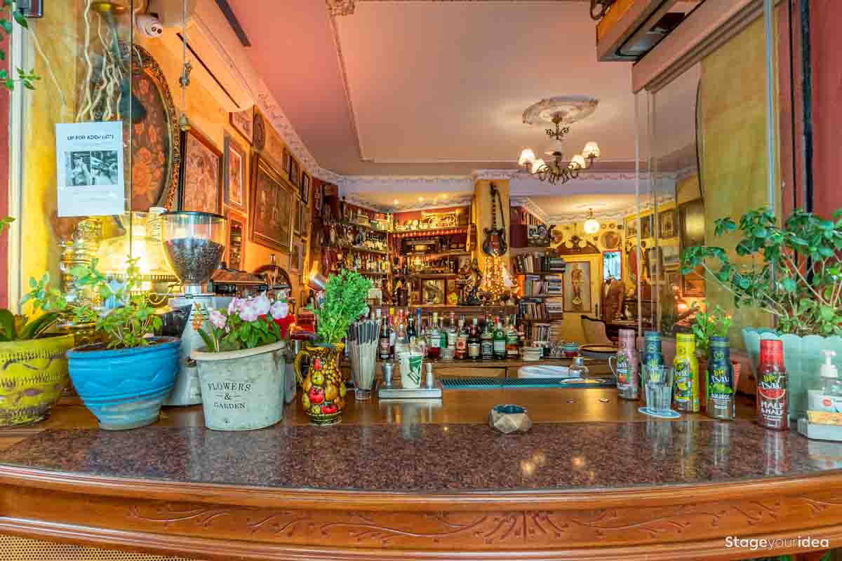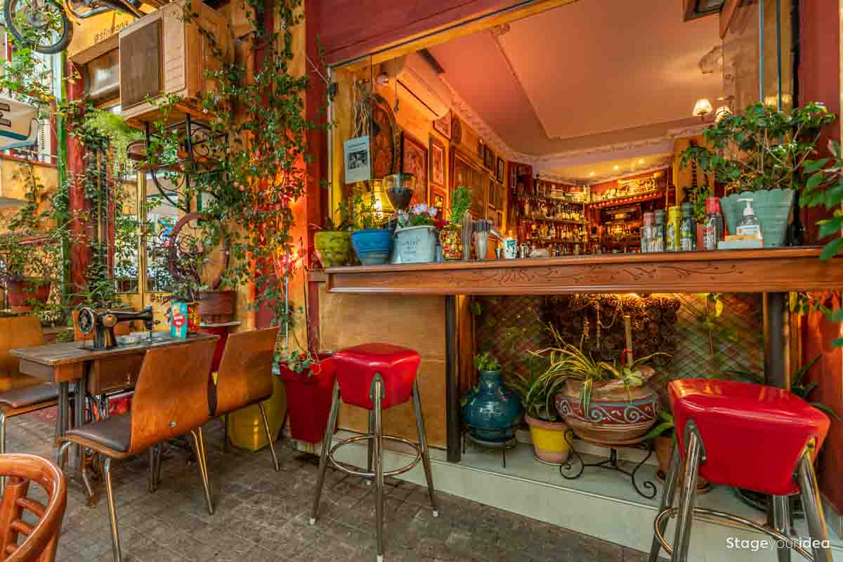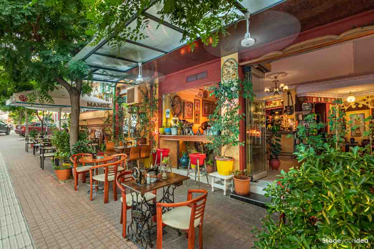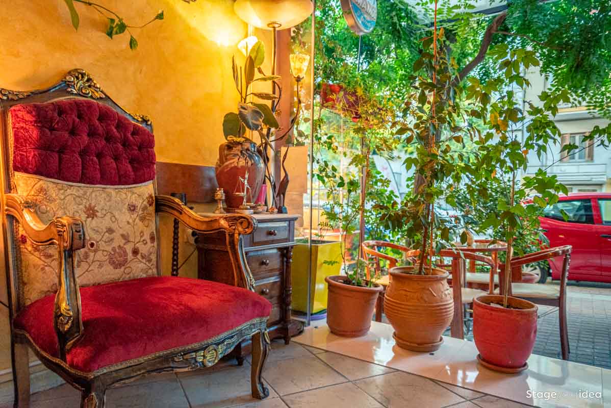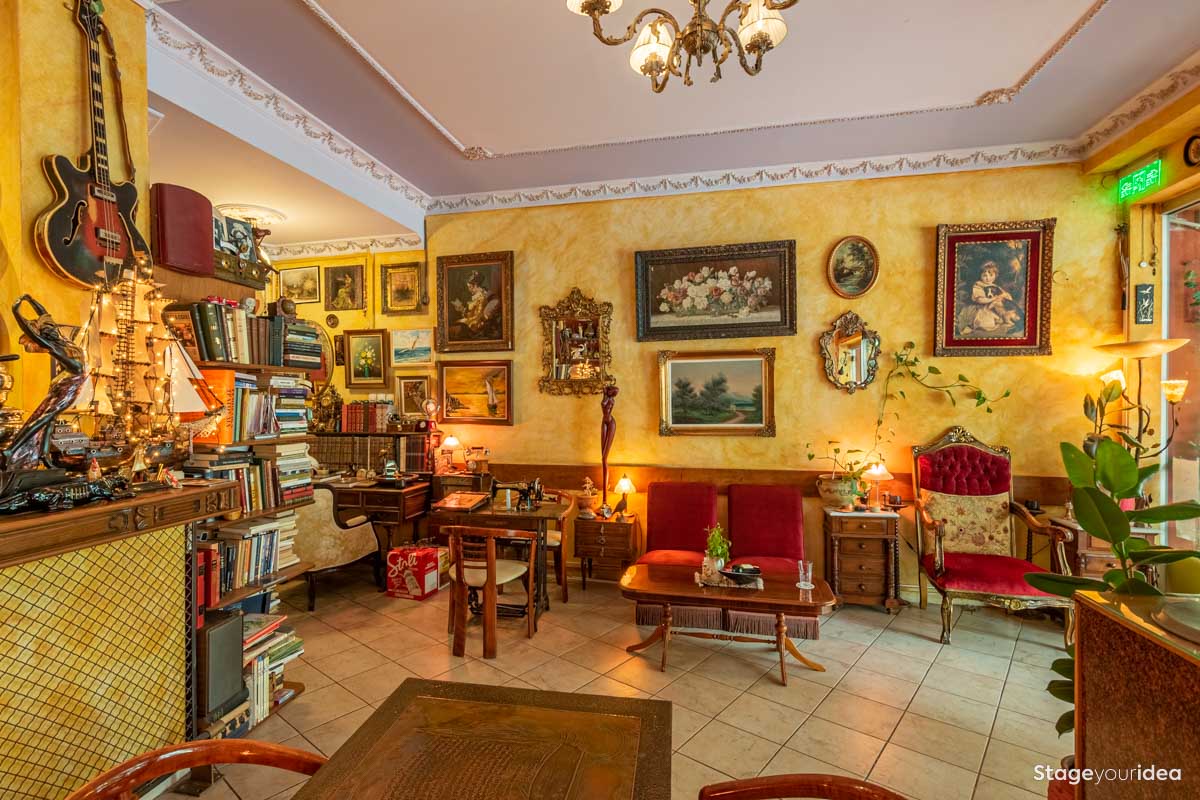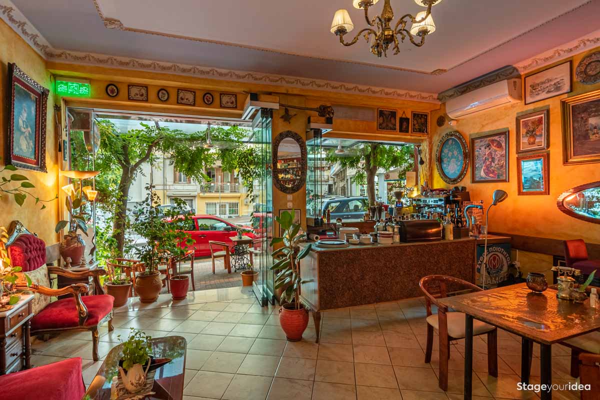 Η αισθητική του «Καφέ / Μουσείο - Έκθεση Αντίκας» χαρακτηρίζεται από αισθητικό εκλεκτικισμό, όπου ο πληθωρισμός, η πολυτέλεια και η αίσθηση του μεγαλειώδους που εκπέμπουν οι ροκοκό πινελιές στον διάκοσμο και την επίπλωση, συμβιώνουν με ρετρό στοιχεία όπως αντίκες, κάδρα και άλλα συλλεκτικά αντικείμενα που εξυμνούν την ομορφιά, τον ρομαντισμό, την δεξιοτεχνία αλλά και την αντισυμβατικότητα. Η ατμόσφαιρα του χώρου θυμίζει τα ιστορικά παριζιάνικα καφέ όπου καλλιτέχνες και διανοούμενοι διαμόρφωναν καλλιτεχνικά ρεύματα και ιδεολογίες που έμελλαν να επηρεάσουν το ρουν της ανθρωπότητας. Η διακόσμηση πληθωρική, θεατρική, δραματική, με ξεκάθαρες γραμμές και γωνίες, με μια ποικιλία υφών και με χρώματα γήινα, και απαλά, με διακοσμητικές ανάγλυφες λεπτομέρειες στους τοίχους, με έναν περίτεχνο πολυέλαιο και με μεγάλες, φαρδιές, τζαμαρίες, σε προσκαλεί να εισέλθεις στον θαυμαστό κόσμο της τέχνης.
