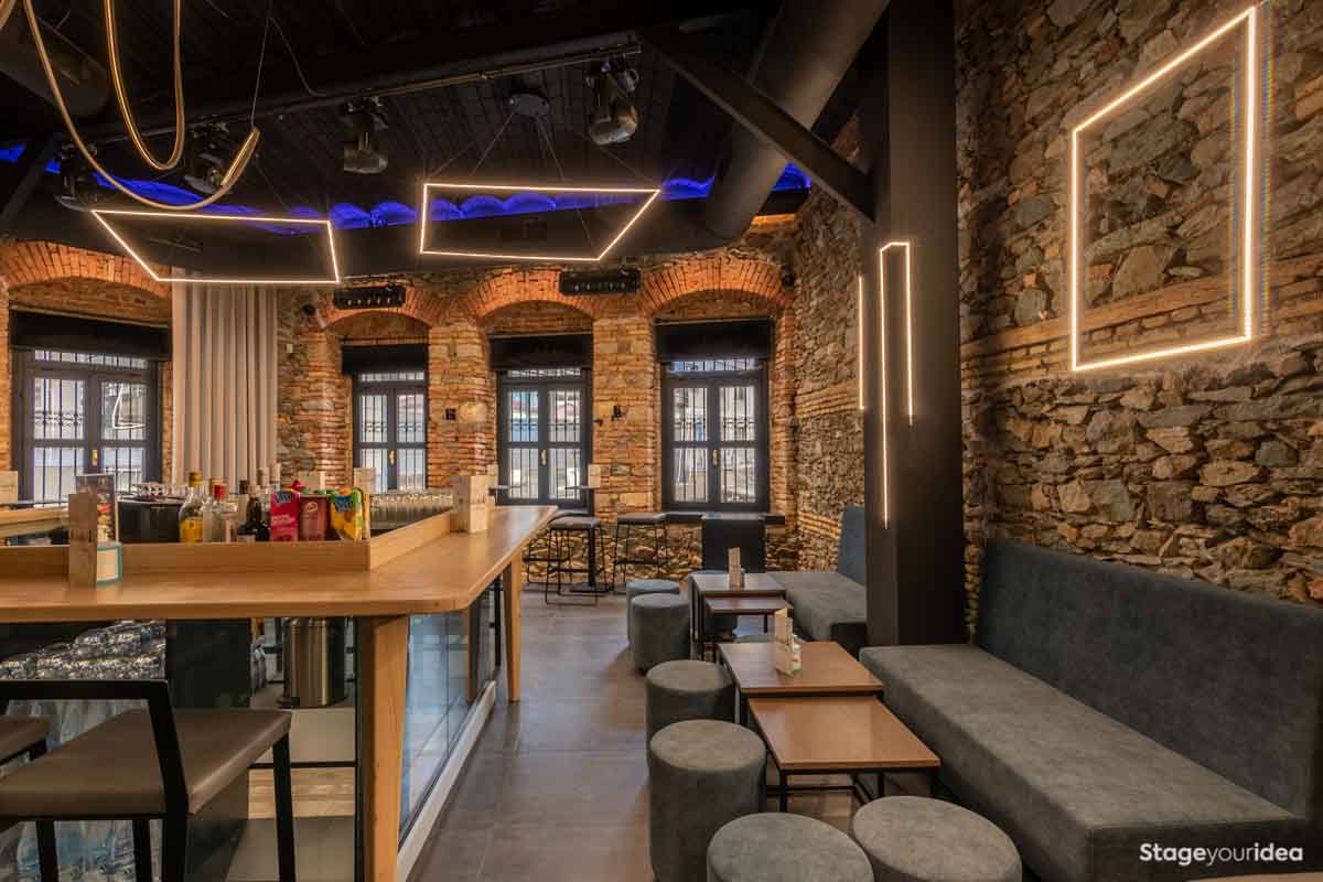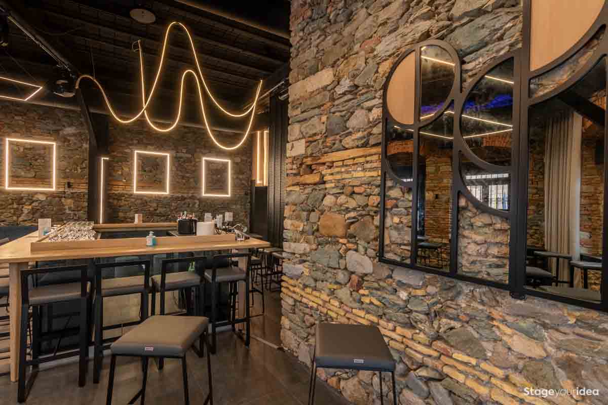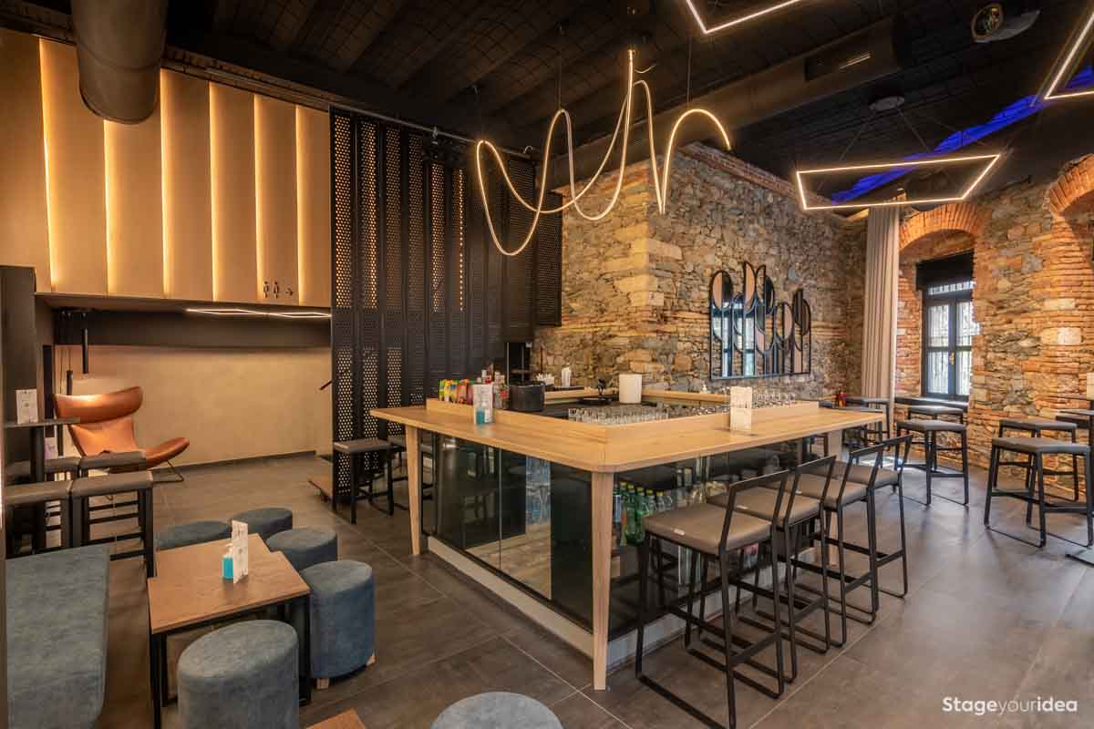Η αισθητική του χώρου διέπεται από το σύγχρονο βιομηχανικό στυλ με κυρίαρχα στοιχεία του χώρου, την πέτρα στους τοίχους, τις μεταλλικές λεπτομέρειες στην επίπλωση, τον ιδιαίτερο καθρέφτη που δεσπόζει ως έργο τέχνης, και τις επιβλητικές κουρτίνες συσκότισης που προσδίδουν μια επιπλέον ιδιωτικότητα και μεγαλοπρέπεια. Ξεχωρίζει το αφαιρετικό ωστόσο πλήρως λειτουργικό μπαρ που λειτουργεί ως ένα επίκεντρο συζητήσεων και κοινωνικοποίησης. Τα χρώματα που επικρατούν είναι ουδέτερα (μαύρο, μπλε, μπεζ), τα φωτιστικά σε abstract ή γεωμετρικούς σχηματισμούς εκπέμπουν ζεστό φως και το ξεχωριστό φωτιστικό που έχει το σχήμα από το πιόνι της βασίλισσας σε παρακινεί να «κάνεις την επόμενη κίνησή σου» και να ενταχθείς κι εσύ στο vibe του χώρου.