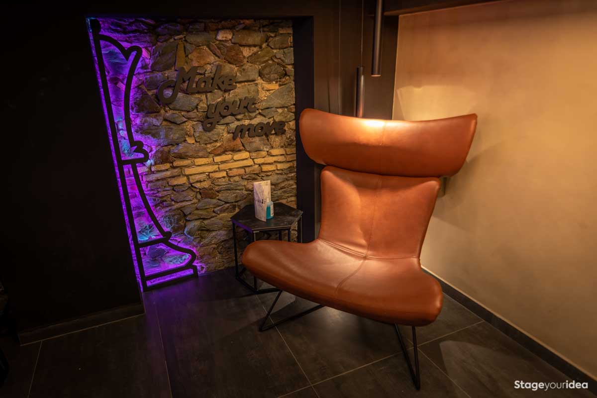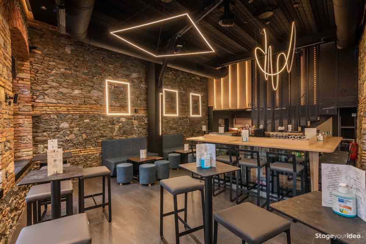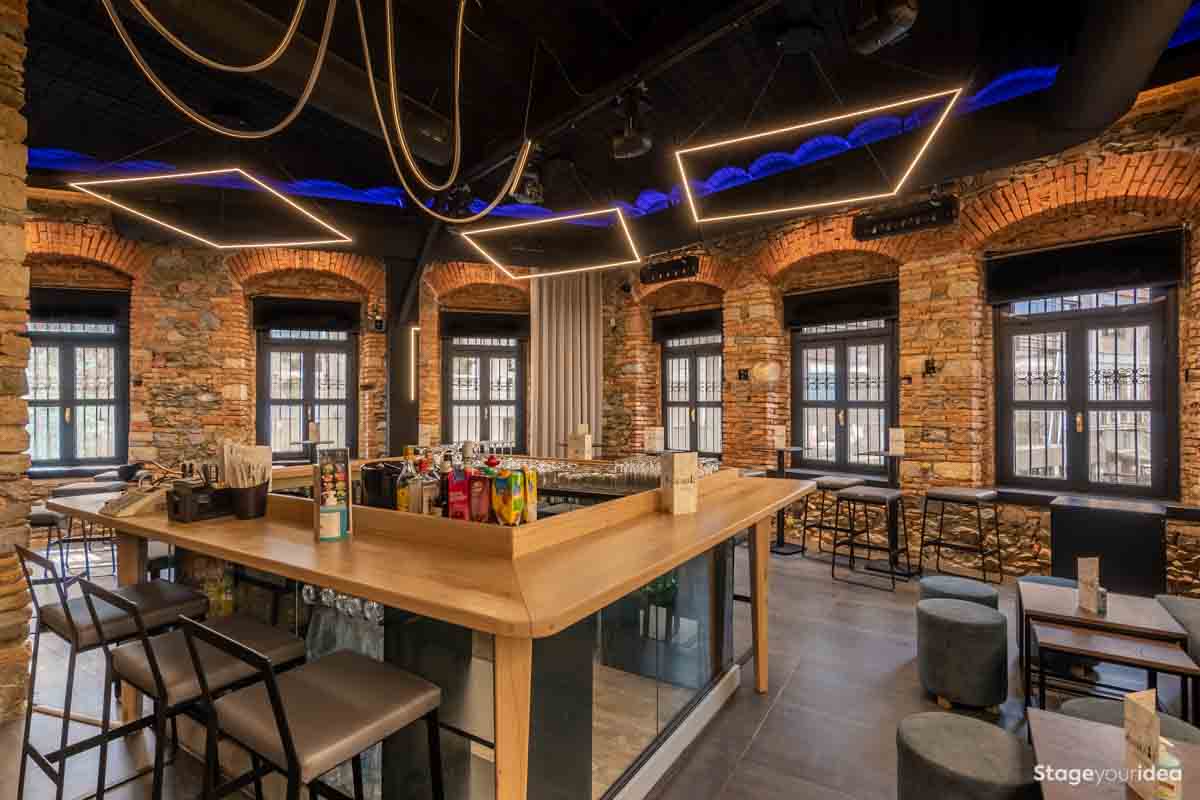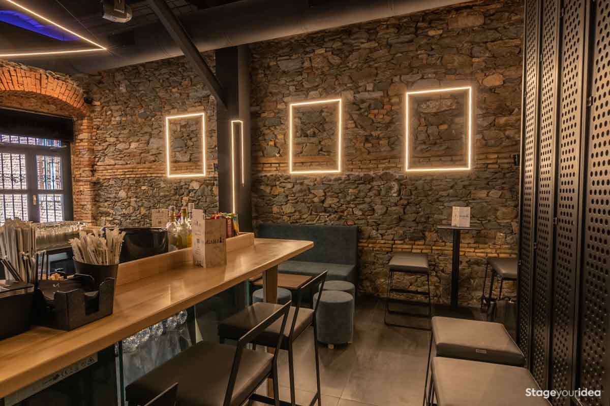 Η αισθητική του χώρου διέπεται από το σύγχρονο βιομηχανικό στυλ με κυρίαρχα στοιχεία του χώρου, την πέτρα στους τοίχους, τις μεταλλικές λεπτομέρειες στην επίπλωση, τον ιδιαίτερο καθρέφτη που δεσπόζει ως έργο τέχνης, και τις επιβλητικές κουρτίνες συσκότισης που προσδίδουν μια επιπλέον ιδιωτικότητα και μεγαλοπρέπεια. Ξεχωρίζει το αφαιρετικό ωστόσο πλήρως λειτουργικό μπαρ που λειτουργεί ως ένα επίκεντρο συζητήσεων και κοινωνικοποίησης. Τα χρώματα που επικρατούν είναι ουδέτερα (μαύρο, μπλε, μπεζ), τα φωτιστικά σε abstract ή γεωμετρικούς σχηματισμούς εκπέμπουν ζεστό φως και το ξεχωριστό φωτιστικό που έχει το σχήμα από το πιόνι της βασίλισσας σε παρακινεί να «κάνεις την επόμενη κίνησή σου» και να ενταχθείς κι εσύ στο vibe του χώρου.