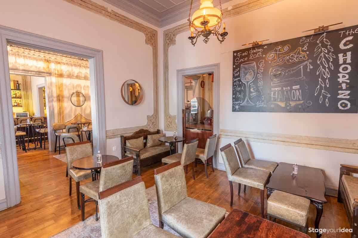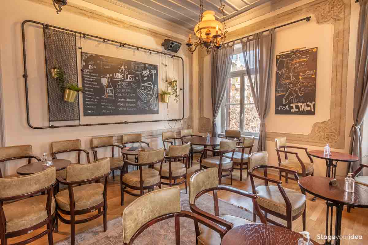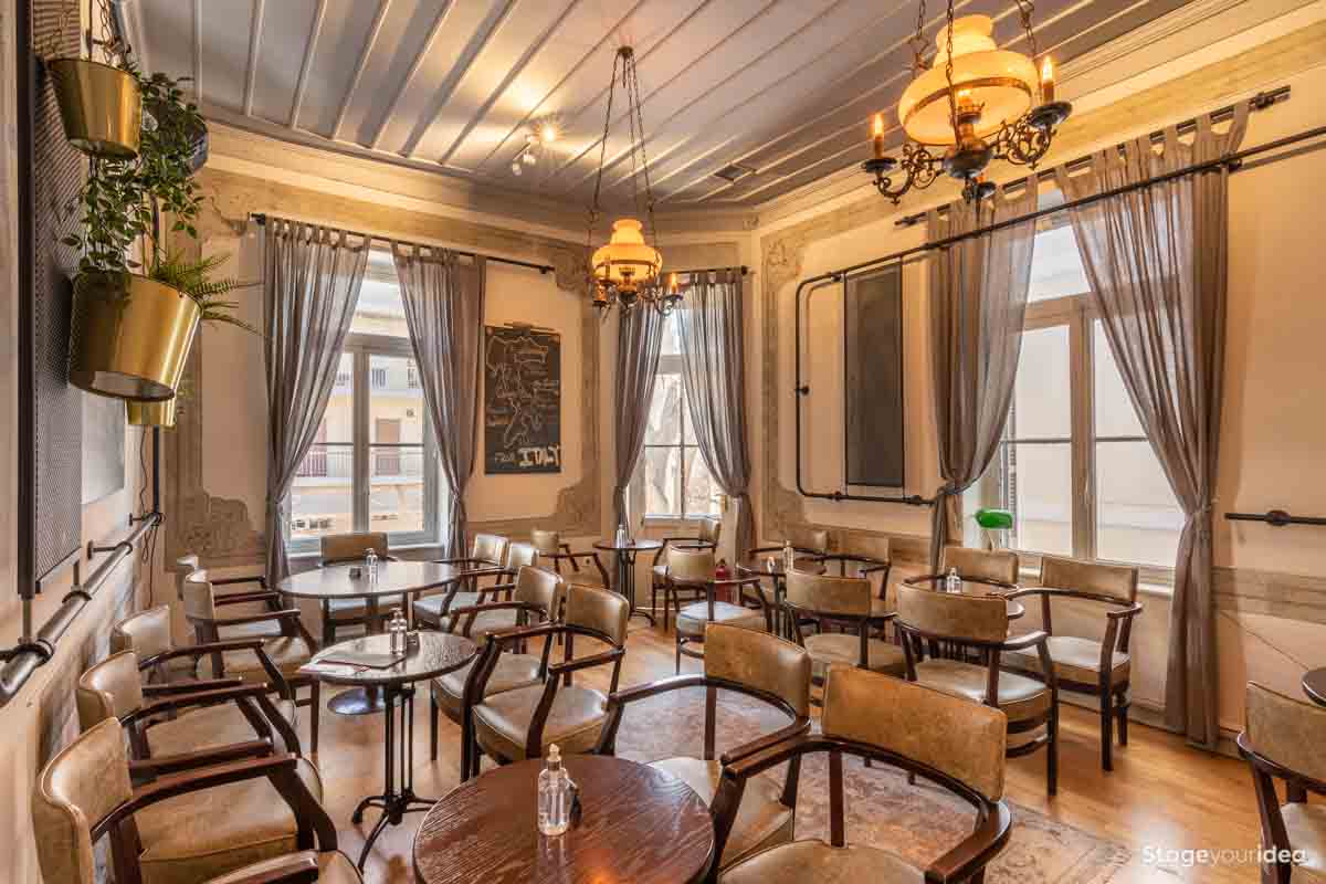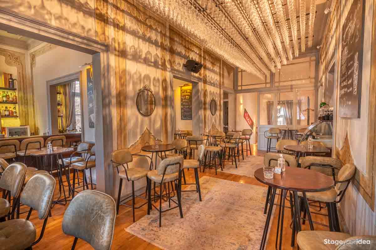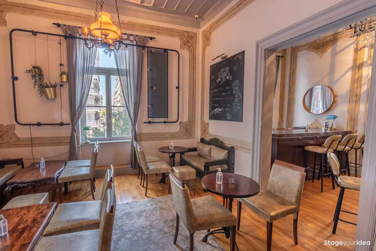 Η Αίθουσα αποτελεί επιτομή του ρουστίκ σε συνδυασμό με το βιομηχανικό στυλ ή αλλιώς όταν το παραδοσιακό συναντά την λιτότητα. Η ανεπεξέργαστη πέτρα στους τοίχους που αποπνέει την ιστορικότητα του χώρου στην φυσική απόχρωση της τερακότα, το ραφιναρισμένο ξύλο και το ανάγλυφο δάπεδο με τα πορσελανάτα πλακάκια με εφέ πέτρας μεταδίδουν την αρχοντικότητα και την διαχρονική γοητεία του χώρου. Οι σύγχρονης αισθητικής κάβες δηλώνουν την ταυτότητα της Αίθουσας και υπόσχονται στιγμές χαλάρωσης και απόλαυσης.