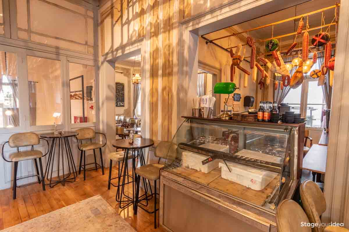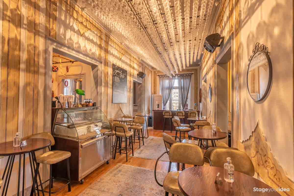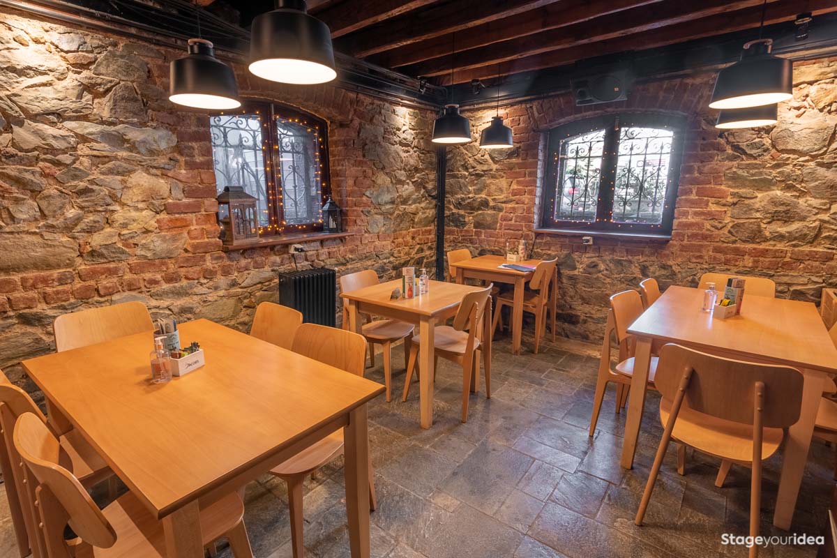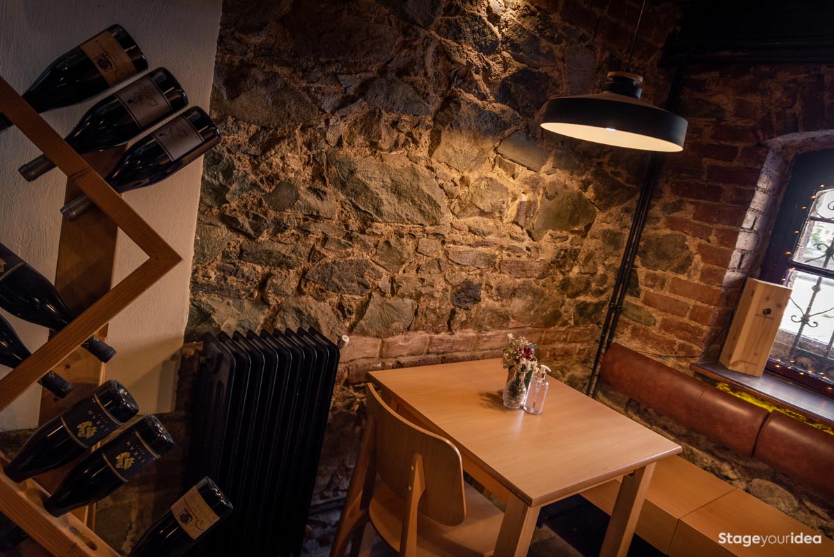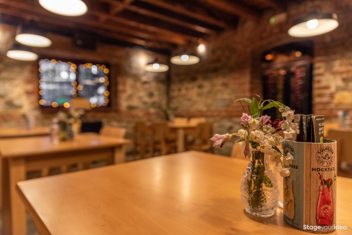 Η Αίθουσα αποτελεί επιτομή του ρουστίκ σε συνδυασμό με το βιομηχανικό στυλ ή αλλιώς όταν το παραδοσιακό συναντά την λιτότητα. Η ανεπεξέργαστη πέτρα στους τοίχους που αποπνέει την ιστορικότητα του χώρου στην φυσική απόχρωση της τερακότα, το ραφιναρισμένο ξύλο και το ανάγλυφο δάπεδο με τα πορσελανάτα πλακάκια με εφέ πέτρας μεταδίδουν την αρχοντικότητα και την διαχρονική γοητεία του χώρου. Οι σύγχρονης αισθητικής κάβες δηλώνουν την ταυτότητα της Αίθουσας και υπόσχονται στιγμές χαλάρωσης και απόλαυσης.