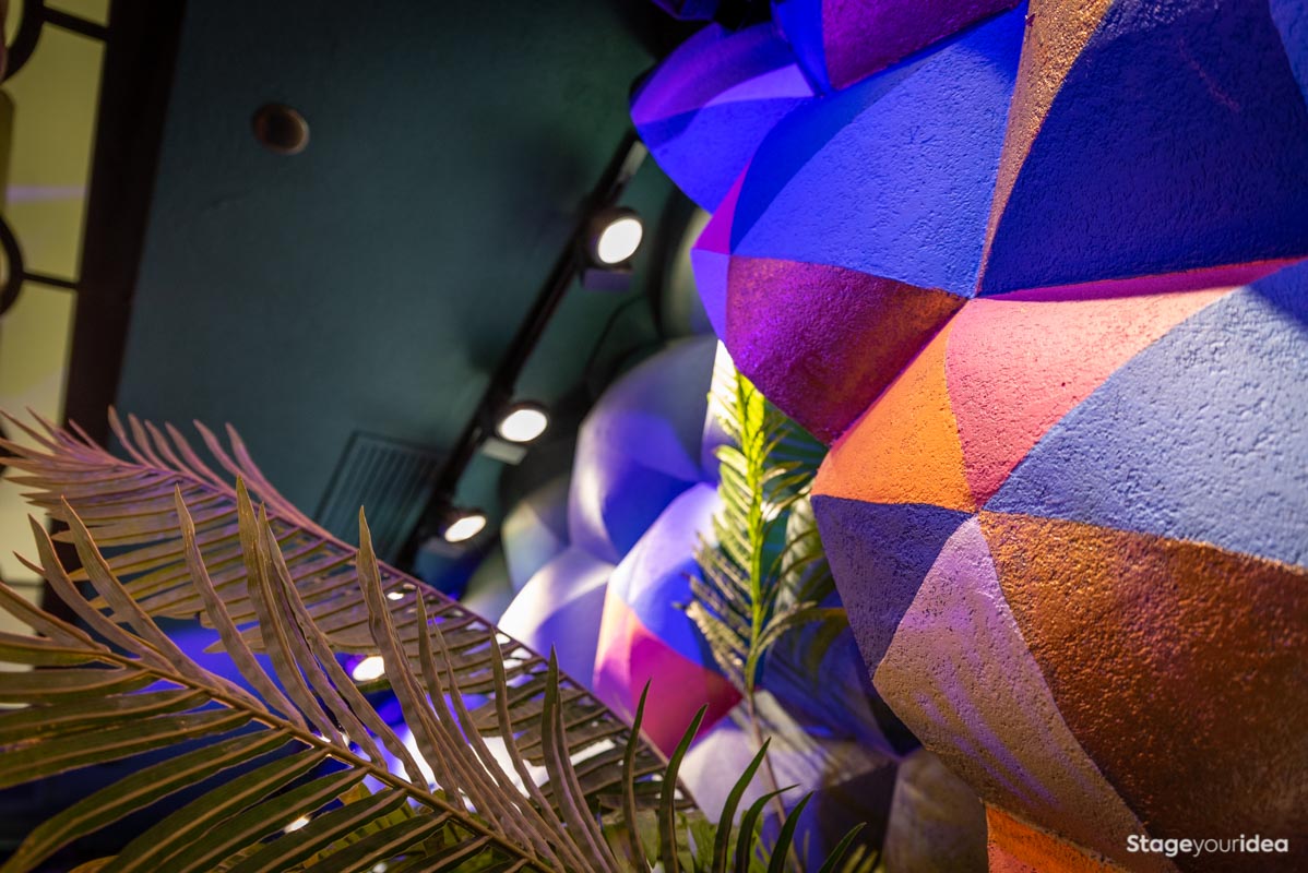To «Πολυτελές Club με Εξωτική Διακόσμηση» είναι η επιτομή του μεταμοντέρνου εκλεκτικισμού στην πιο μαξιμαλιστική και συνάμα έντεχνη εκδοχή του. Είναι ένας ανοιχτός χώρος αλλά ταυτόχρονα ζεστός που σε «αγκαλιάζει», με τις καμπυλωτές του γραμμές. Το βελούδο στην επίπλωση κυριαρχεί και κατακλύζει τον χώρο ως σύμβολο διαχρονικής πολυτέλειας προσδίδοντας μια αίσθηση κομψότητας και glam. Τα άφθονα γεωμετρικά στοιχεία στην οροφή, στους τοίχους υπό την μορφή ανάγλυφων 3d σχεδίων και στις τζαμαρίες εκπέμπουν μια αίσθηση πρωτογονική (tribal) παντρεμένη με σύγχρονες τεχνολογικές αποτυπώσεις (μοτίβα στις τζαμαρίες που μοιάζουν με ηλεκτρονικά κυκλώματα). Τα boho chic φωτιστικά «ζεσταίνουν» την ατμόσφαιρα και προσθέτουν εξωτικότητα στον χώρο. Ο φωτισμός είναι δυναμικός και ποικιλόμορφος προσαρμόσιμος σε διαφορετικές περιστάσεις και απαιτήσεις. Η χρωματική παλέτα με τις μωβ, κίτρινες και πράσινες αποχρώσεις, είναι δημιουργική και έντονη με αποτέλεσμα να κινητοποιεί τις αισθήσεις. Τέλος, η έντονη παρουσία τροπικών φυτών εσωτερικού χώρου συμβάλλει στην τροπική και εξωτική αισθητική που χαρακτηρίζει τον χώρο.